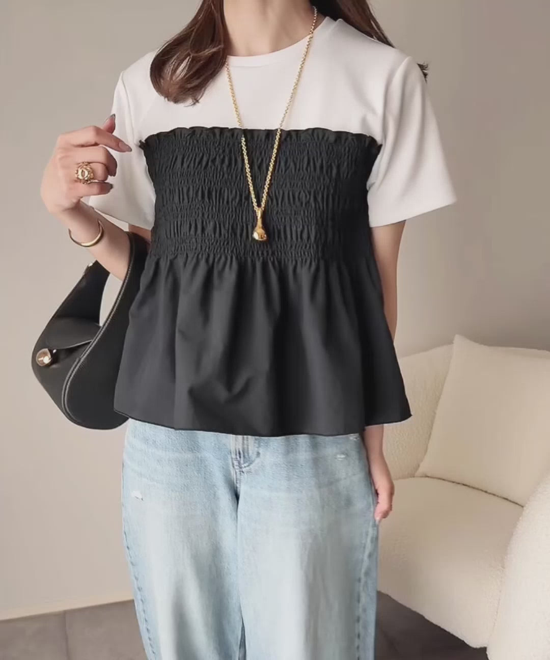 華やかなシャーリングで大人可愛い印象に。