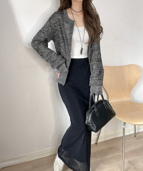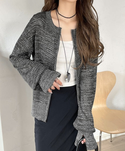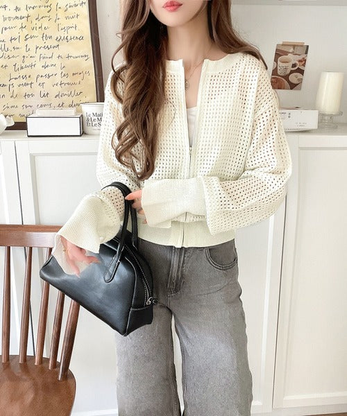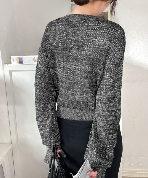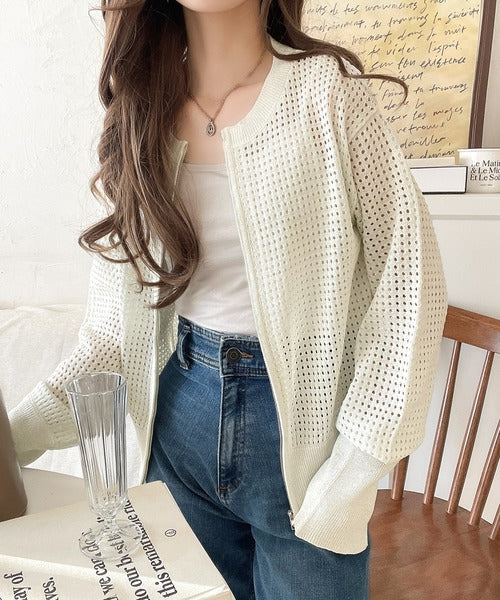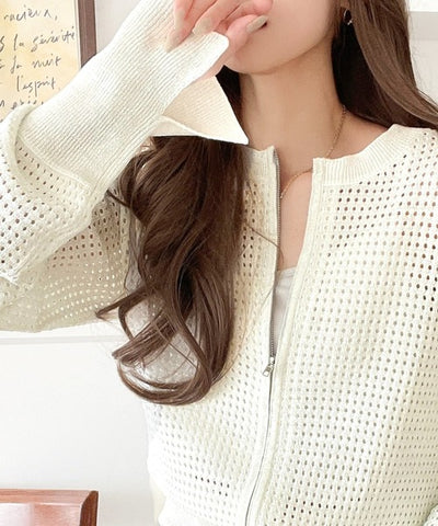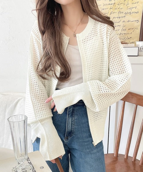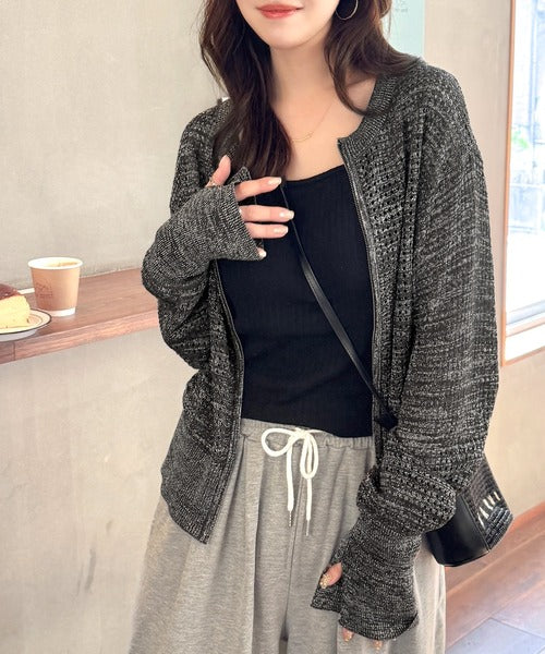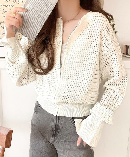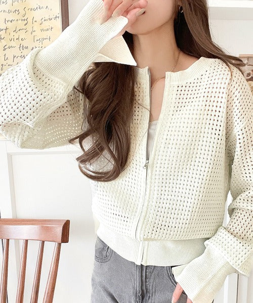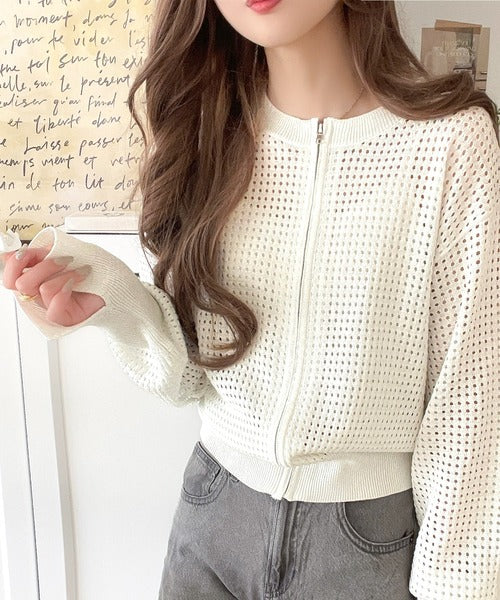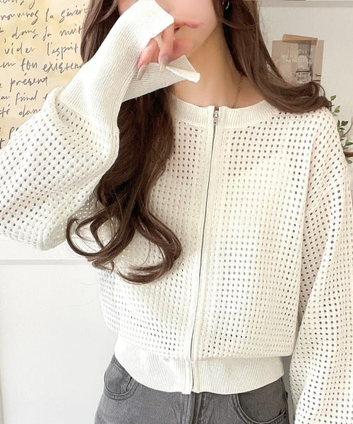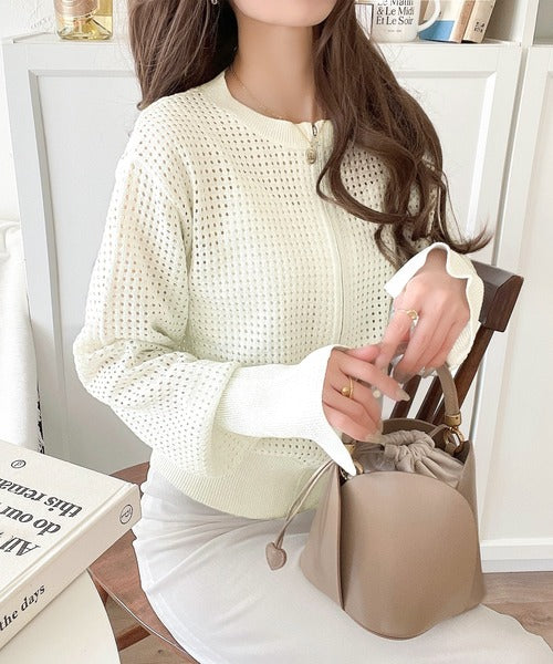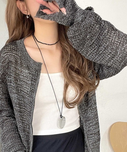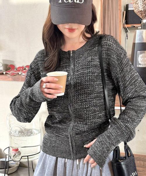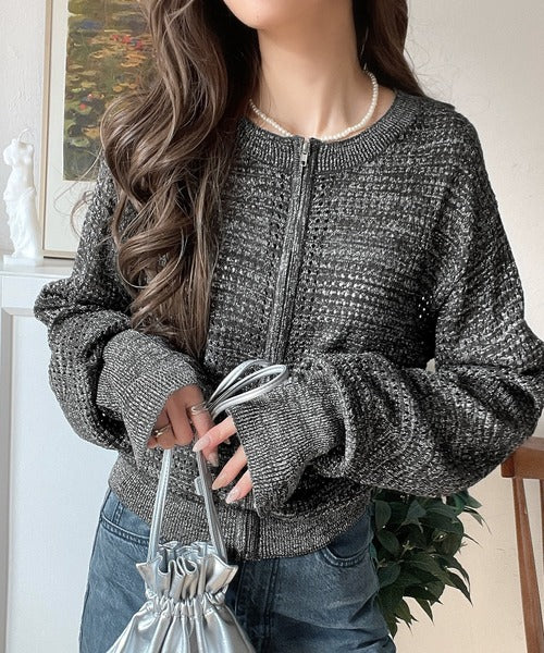 光沢感とシアー感が上品さ漂う。ラメ混透かし編みジップニットカーディガントップス(長袖) ce1050283