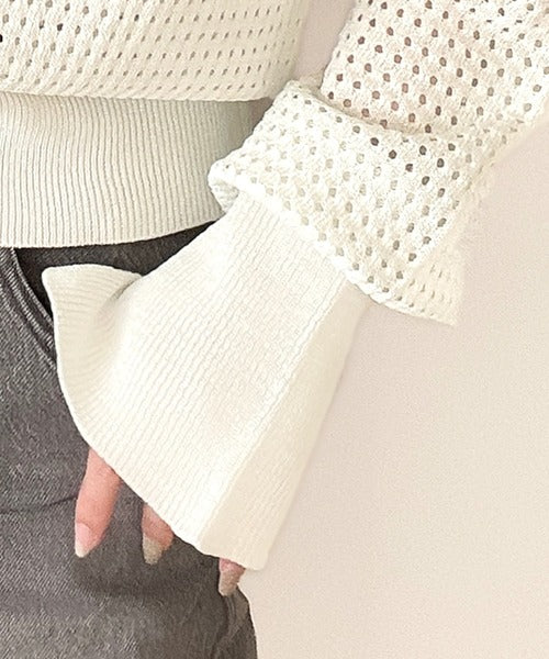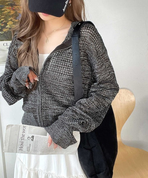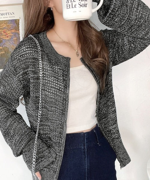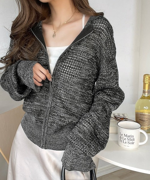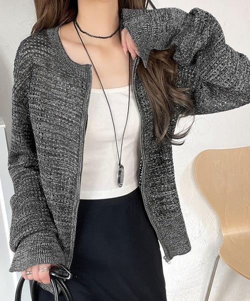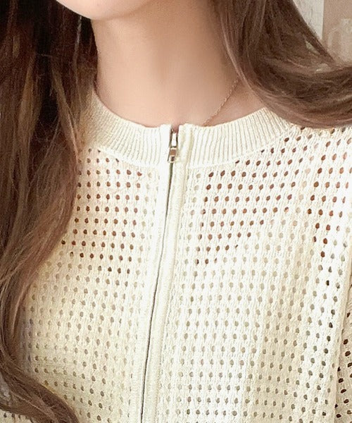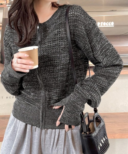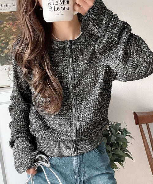 フロントジップとラメ混の透かし編みで大人っぽく仕上げた一着♪