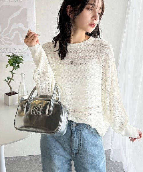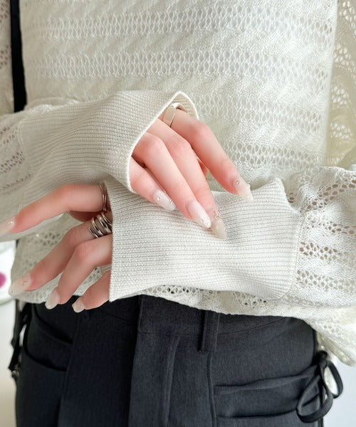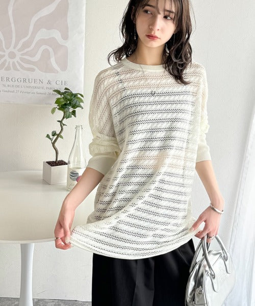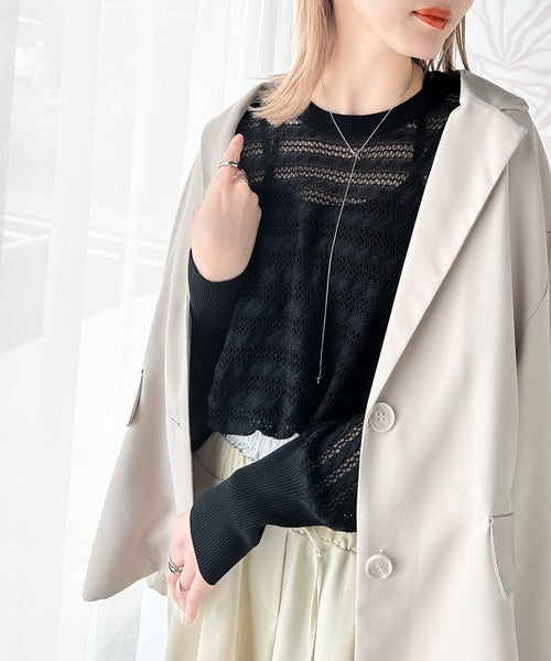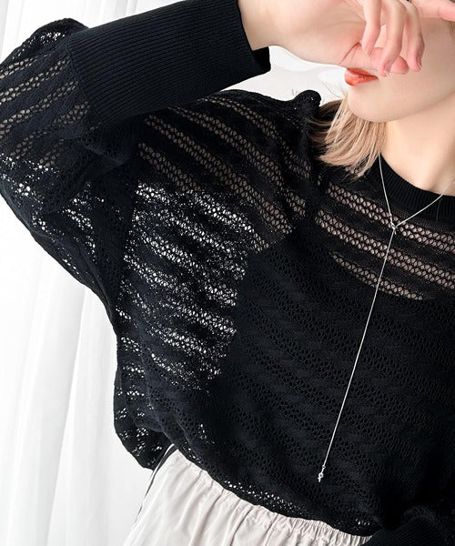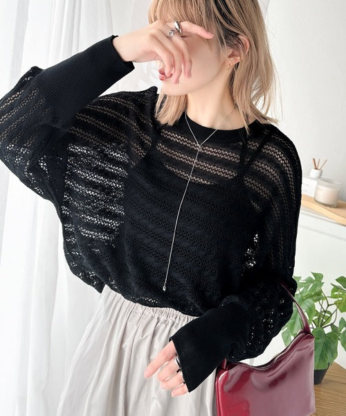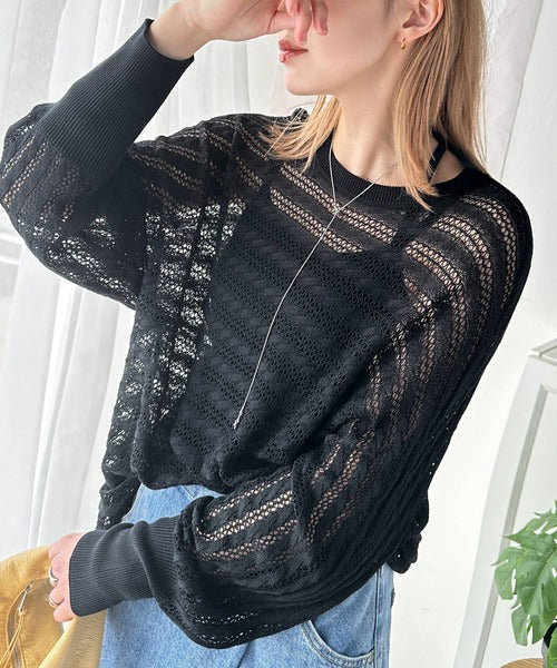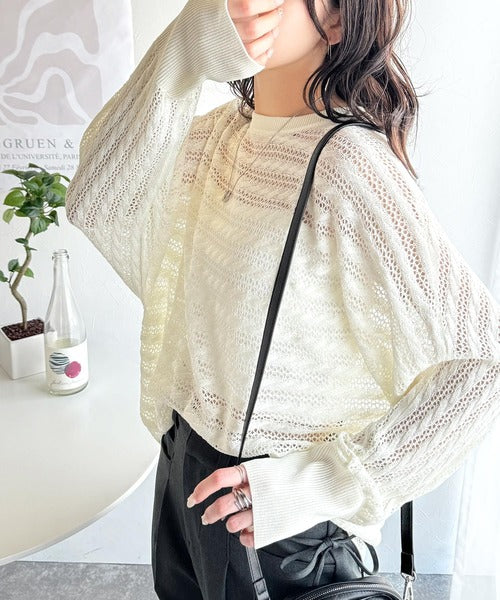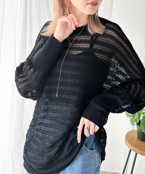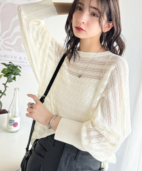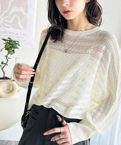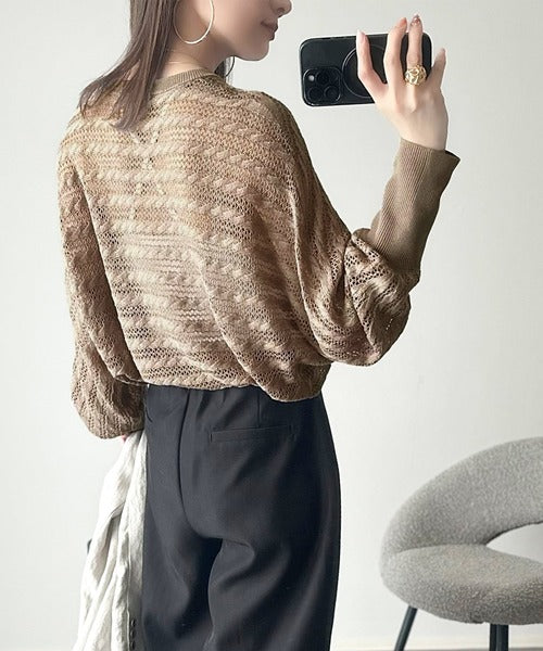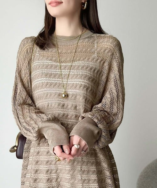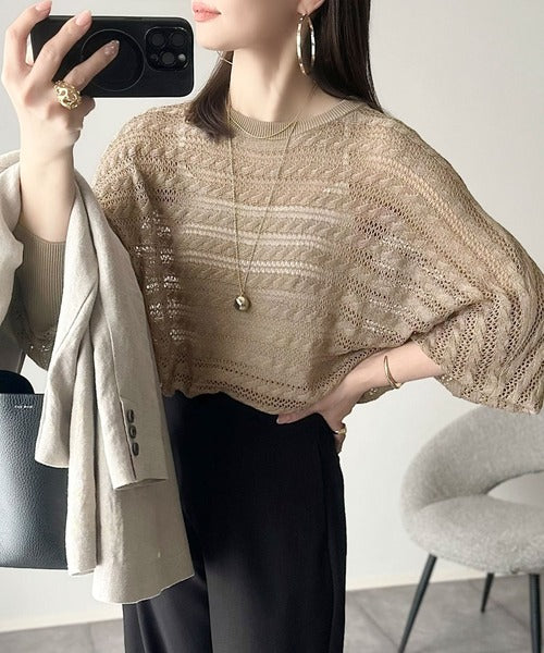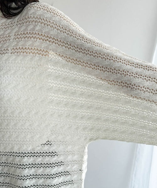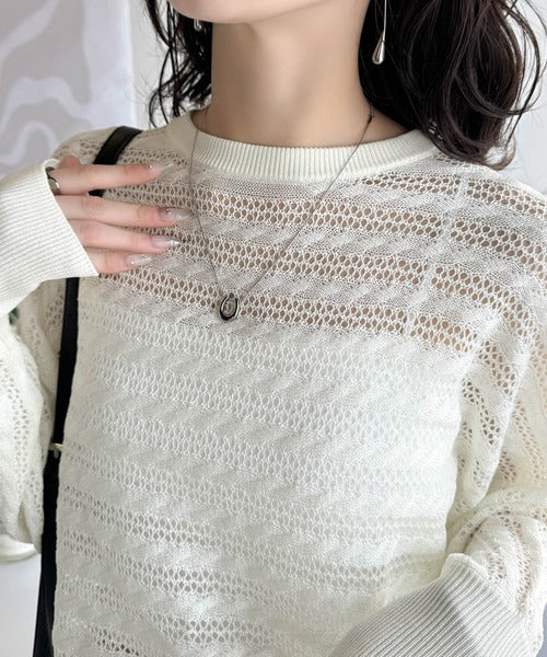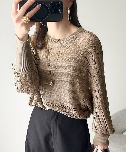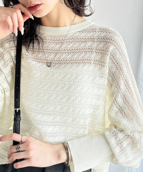 春夏シーズンにぴったりな透かし編み横使いケーブル柄ニットプルオーバー。