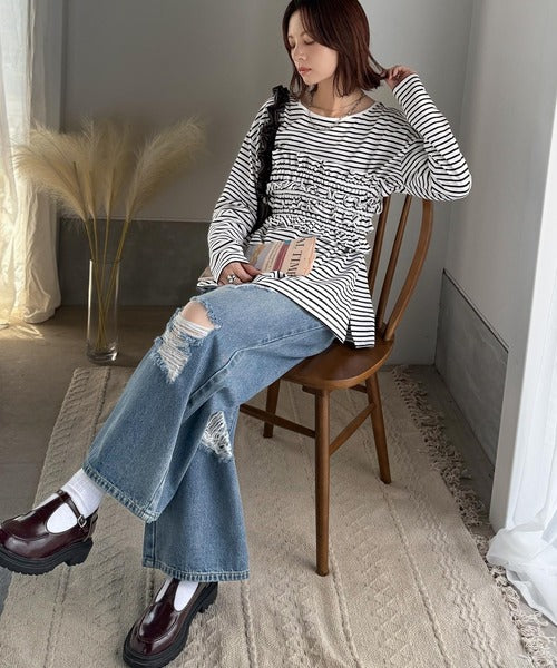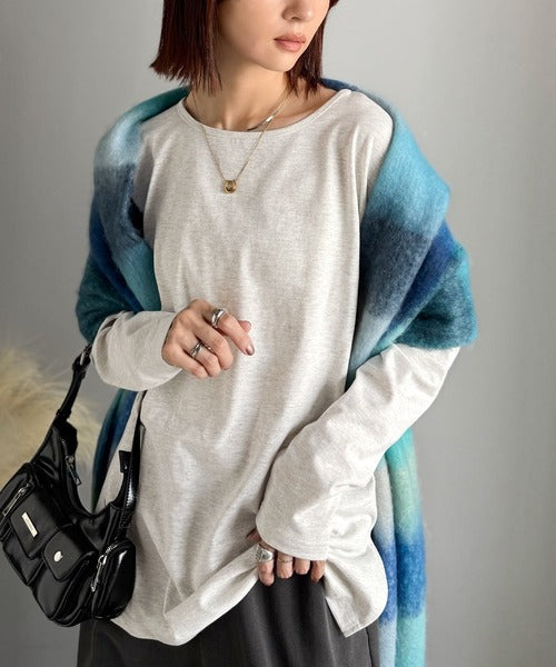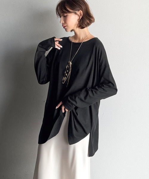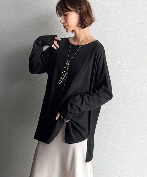 程よい身幅のロンTはシンプルなデザインで、単体でも着用可能。