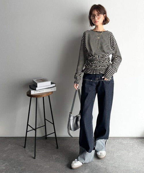 共布のビスチェは単品でも活用でき、シンプルなロンTと組み合わせてスタイリングの幅を広げられます。