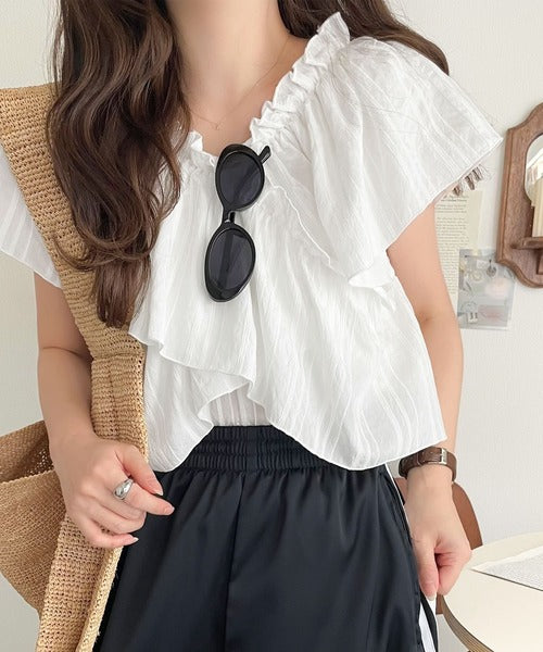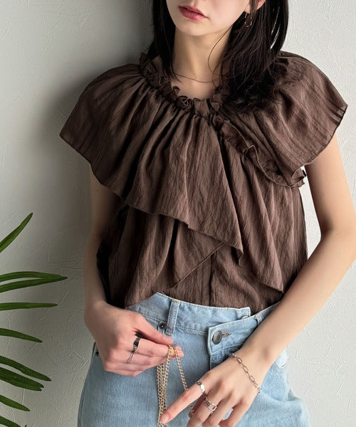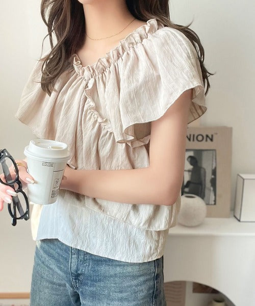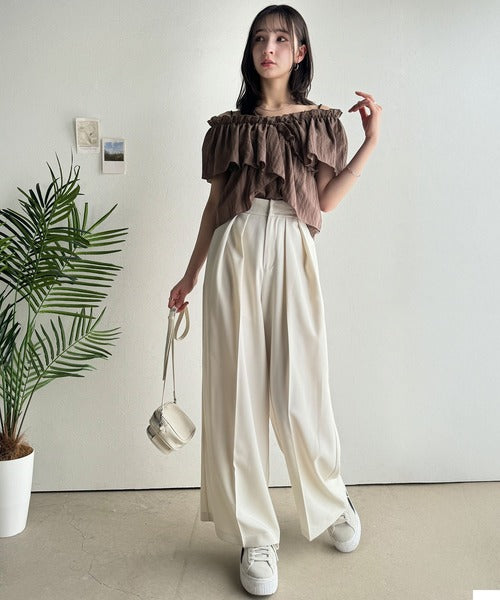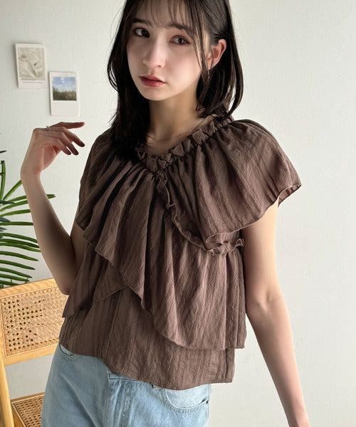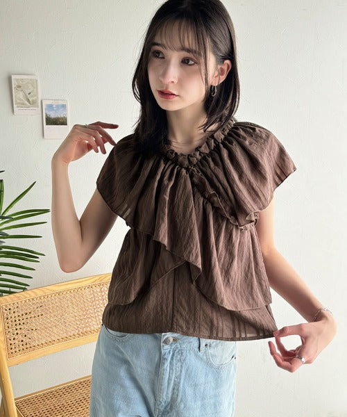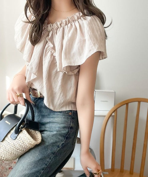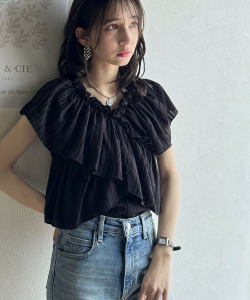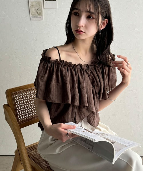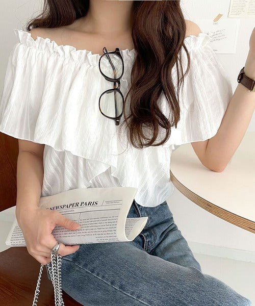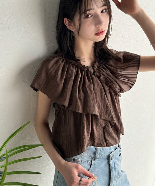 大人ガーリーに見せる。2wayオフショルフリルデザインシアーブラウス ce1070139