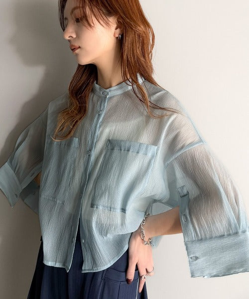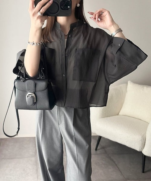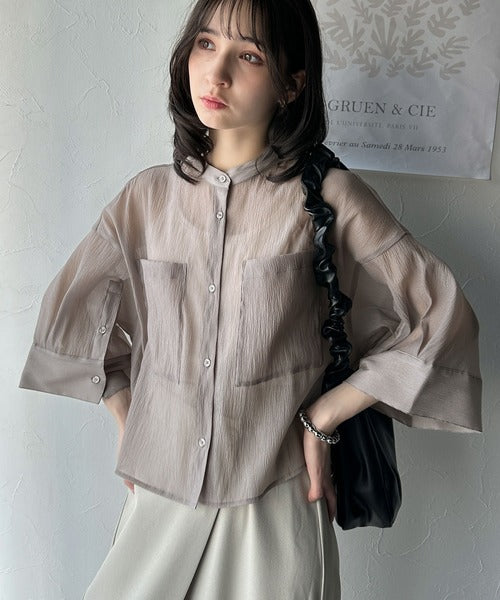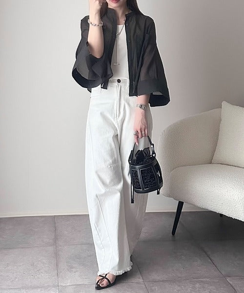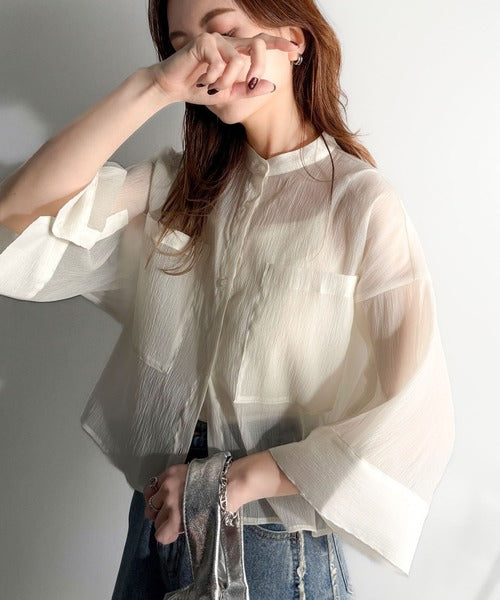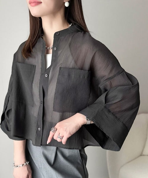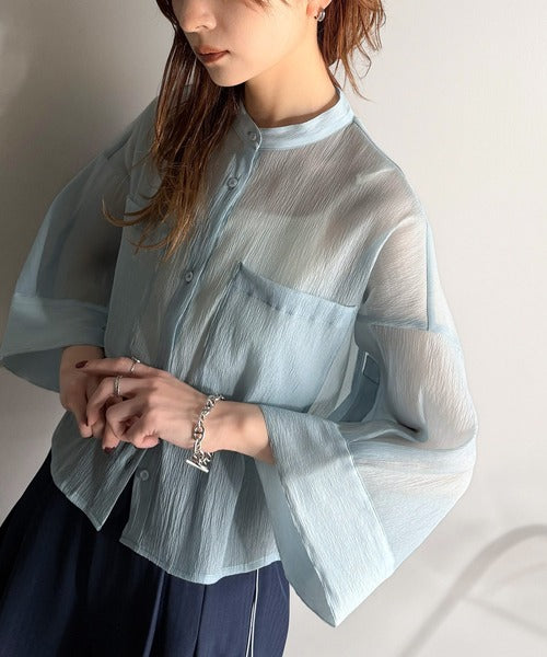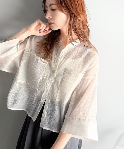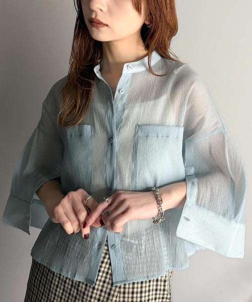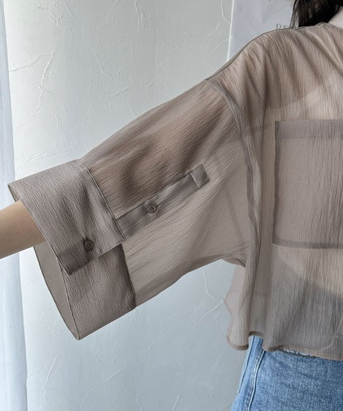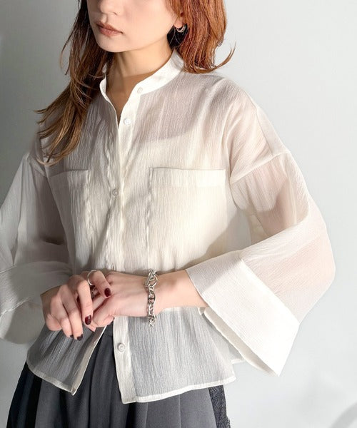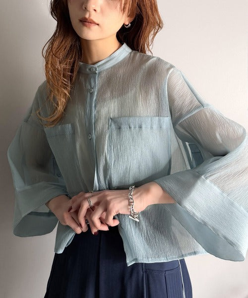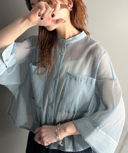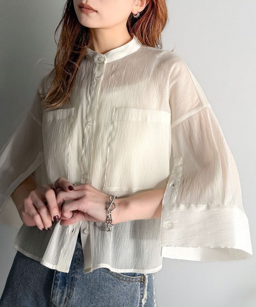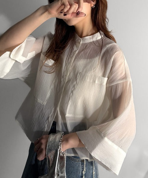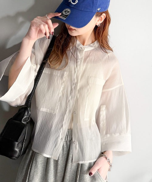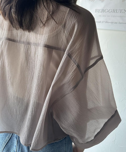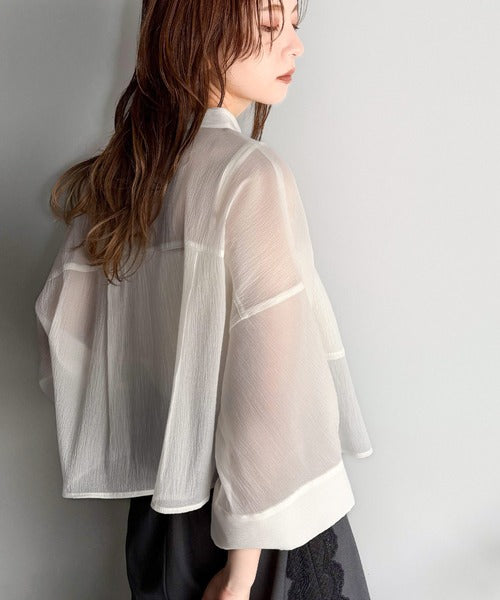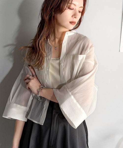 ワイドスリーブがこなれ感を演出する、冷房対策にも抜群のシアーシャツ。