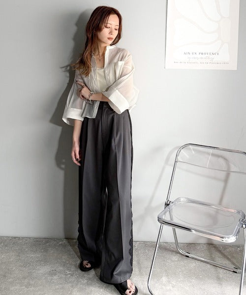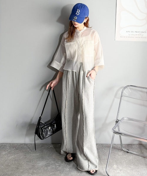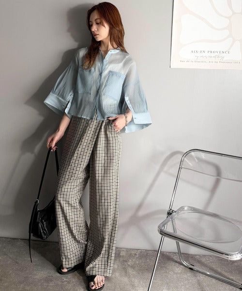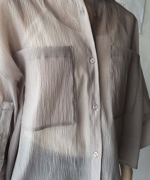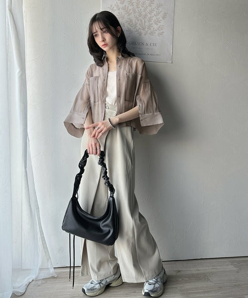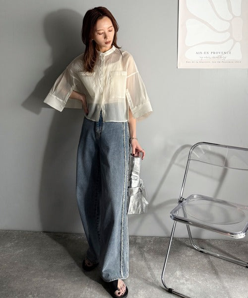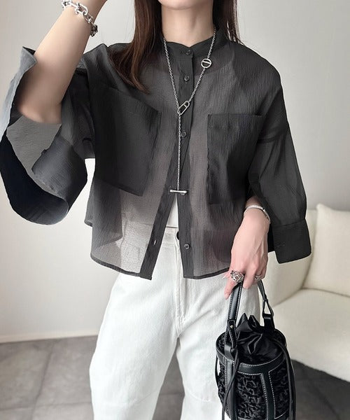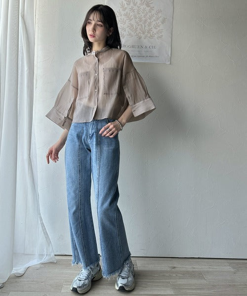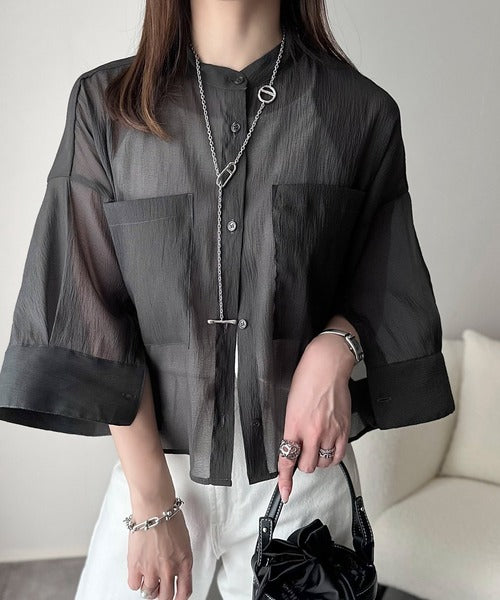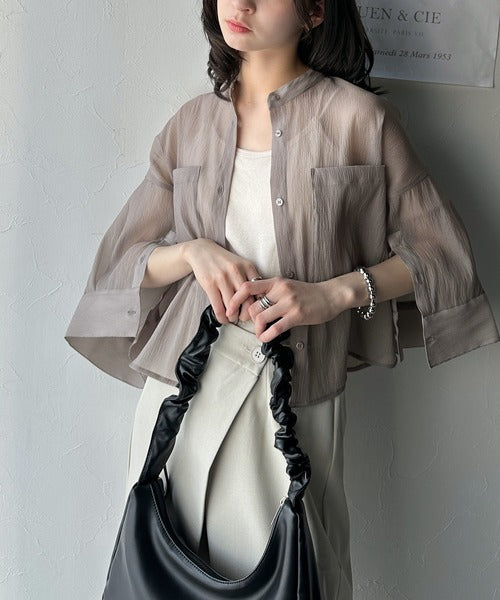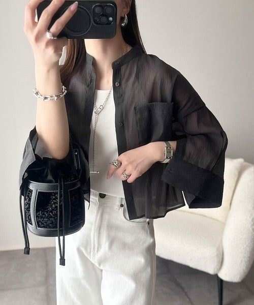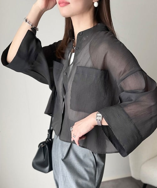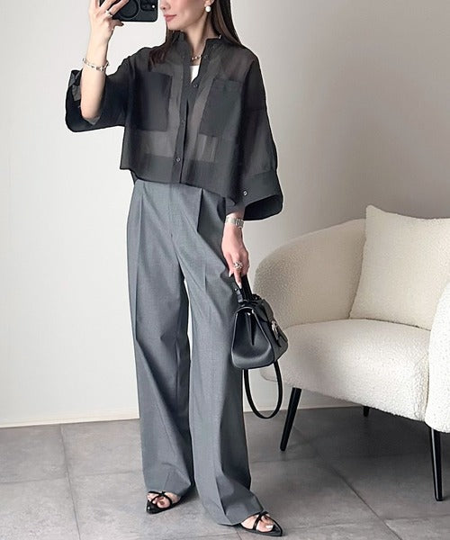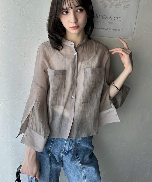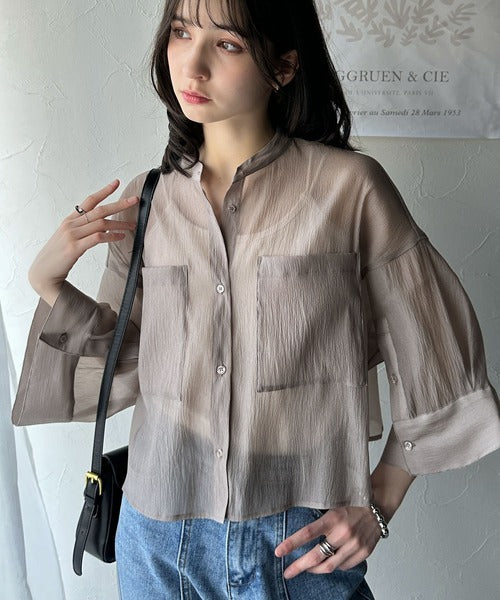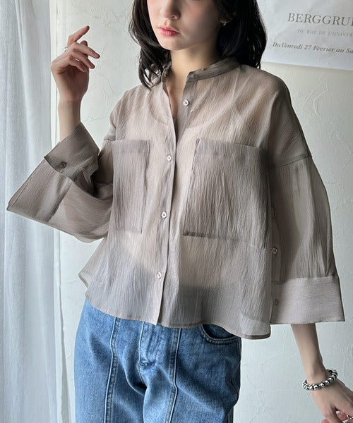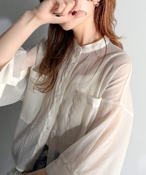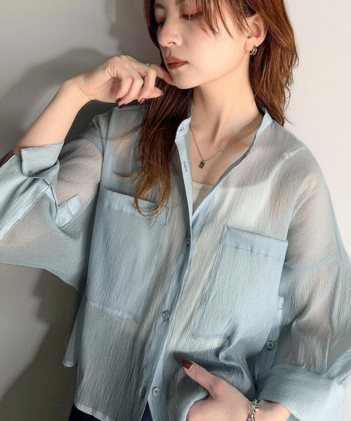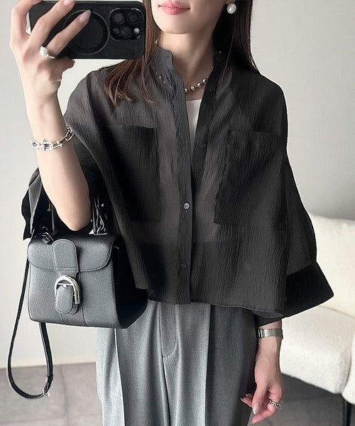 ワイドスリーブがこなれ感を演出する、冷房対策にも抜群のシアーシャツ。