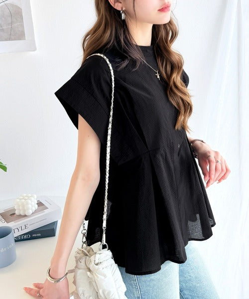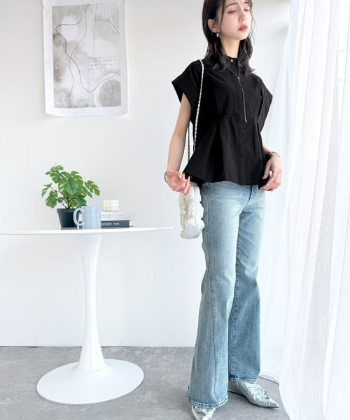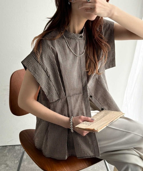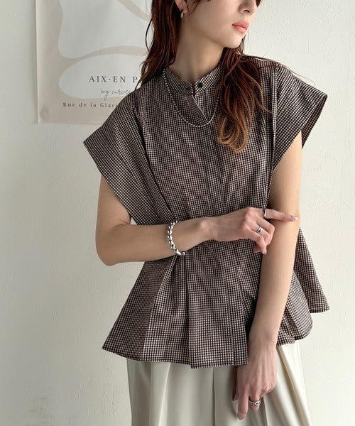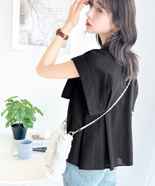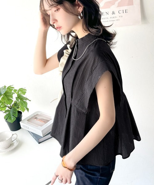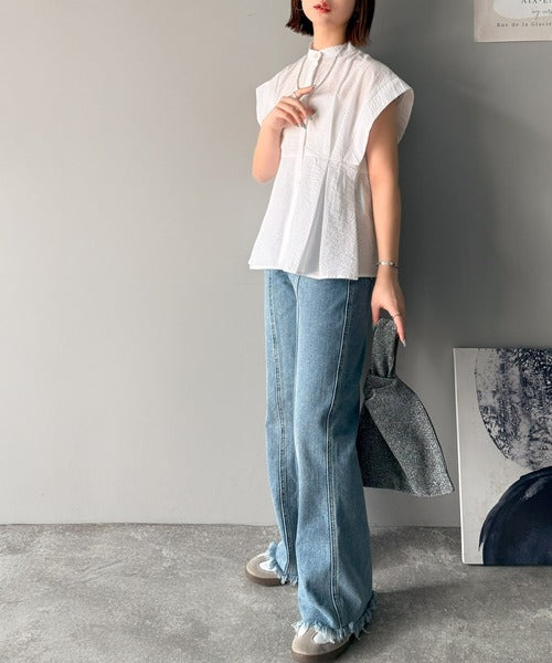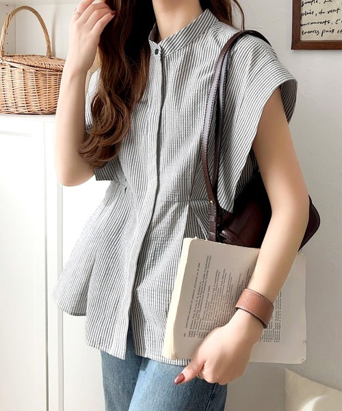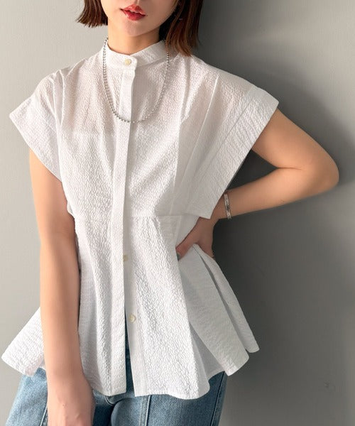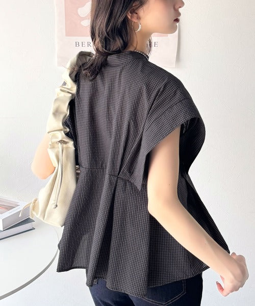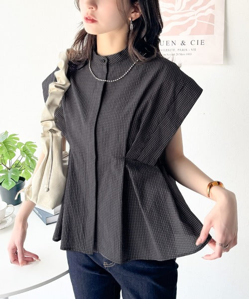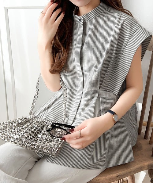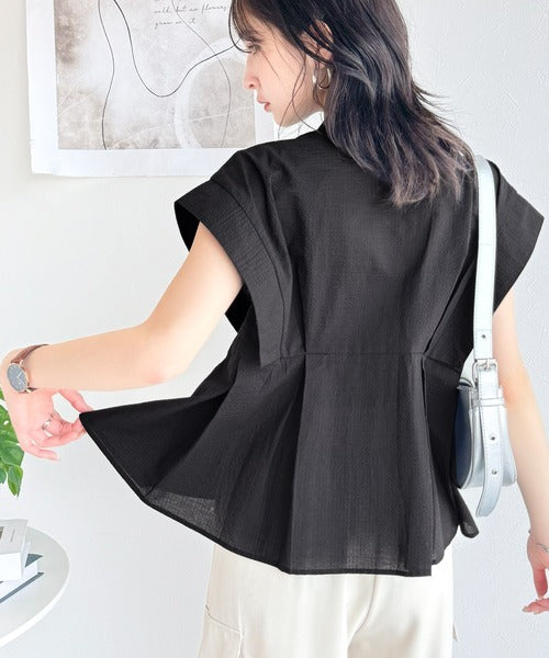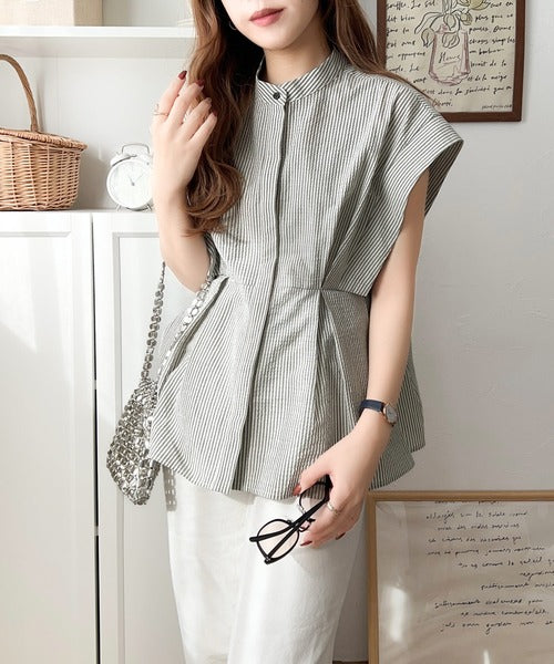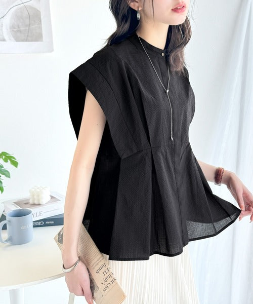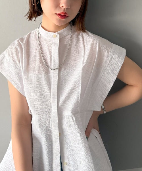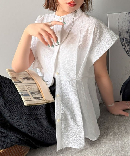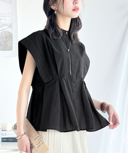 上品さとカジュアルのミックス。サッカー素材前後2wayバンドカラーウエストタックブラウス(ノースリーブ) ce1110101
