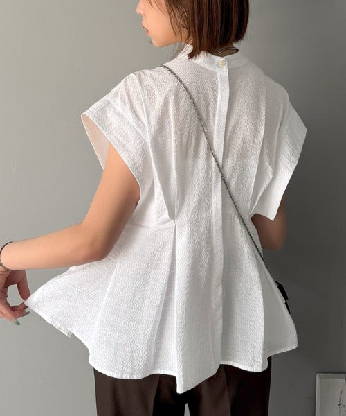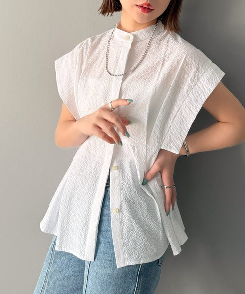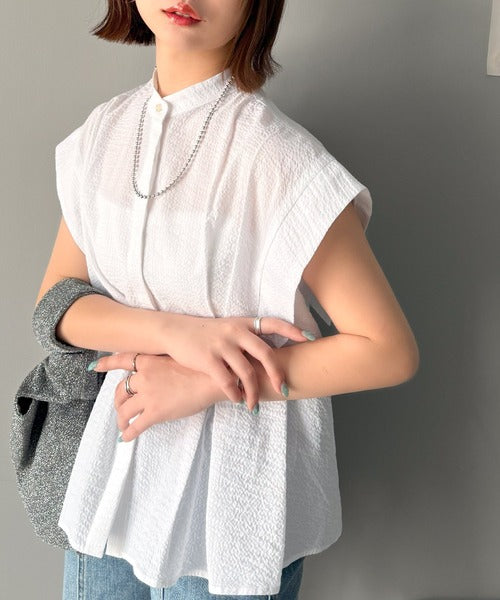 爽やかなサッカー素材で仕立てたバンドカラーブラウス。