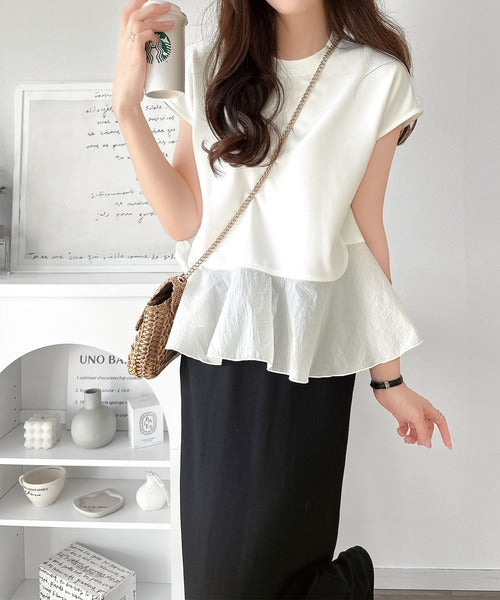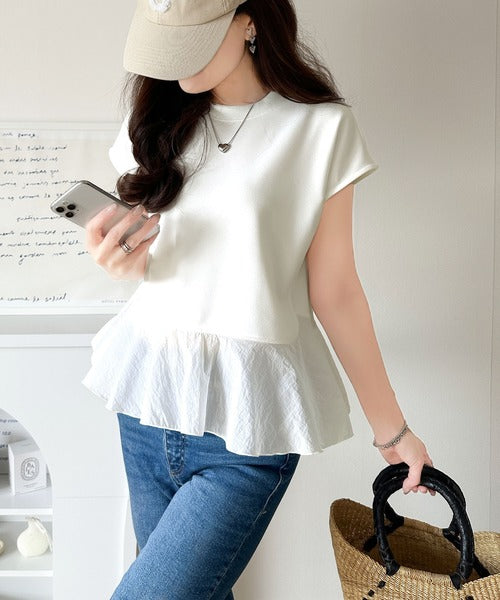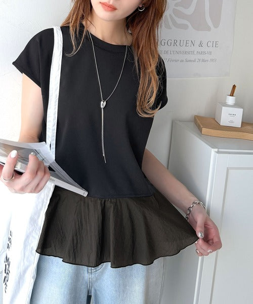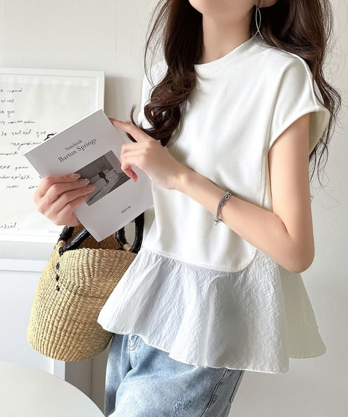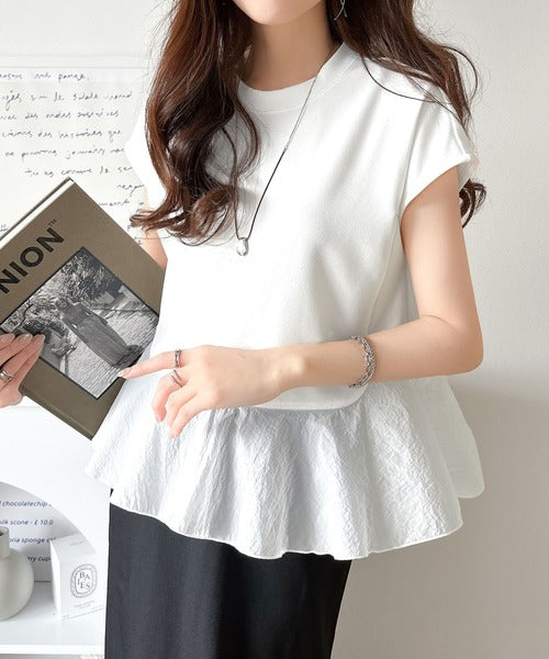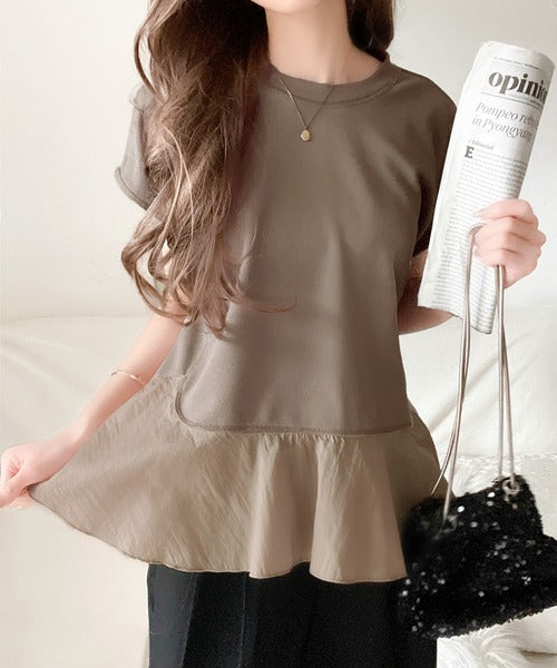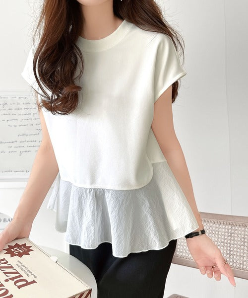 楽ちんなのに上品見え!裾フレア異素材切替フレンチスリーブブラウス ce1110103