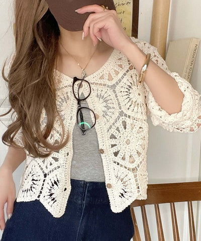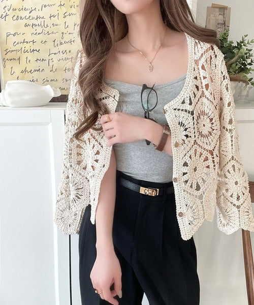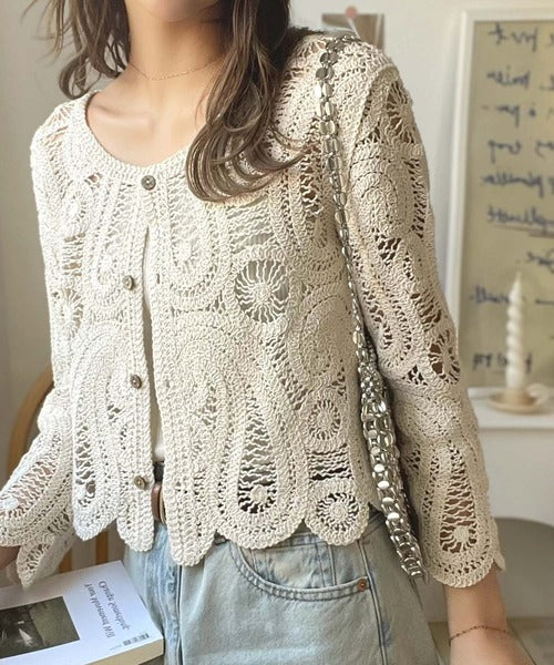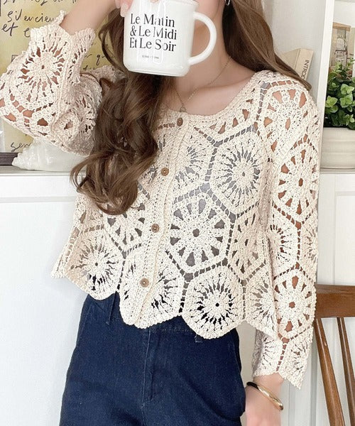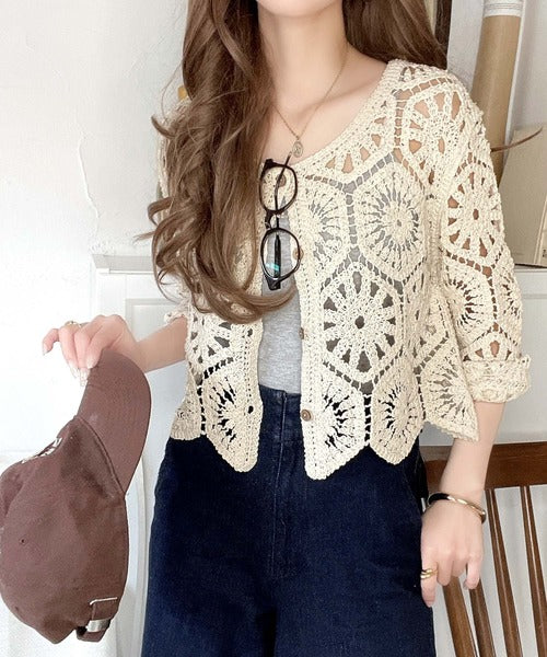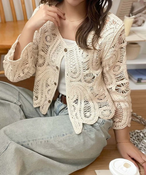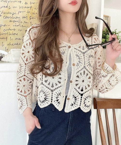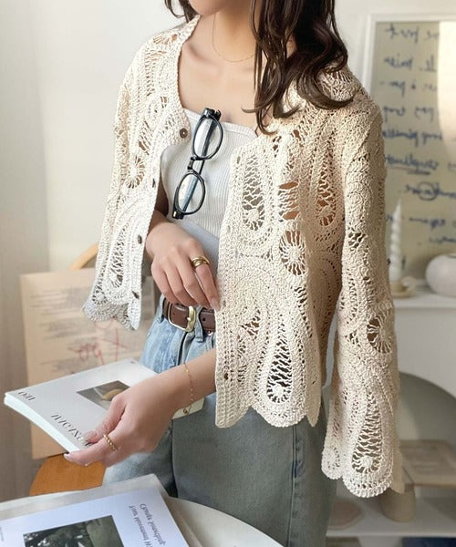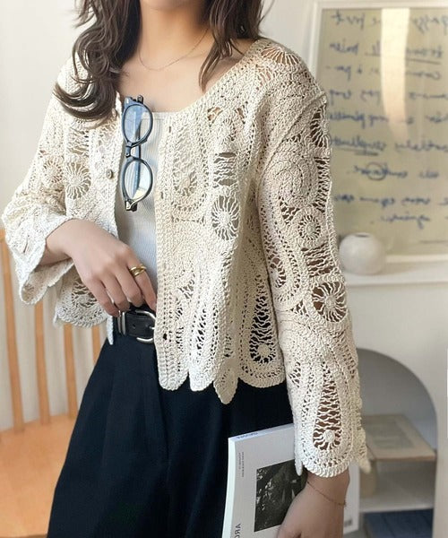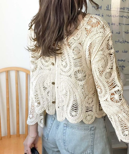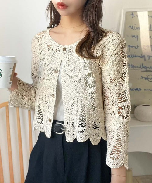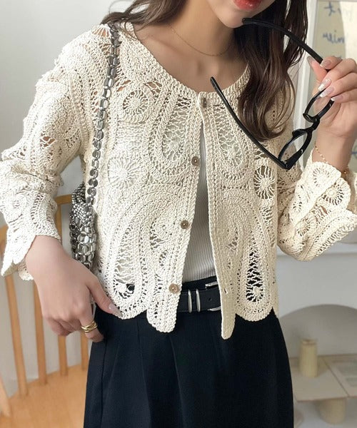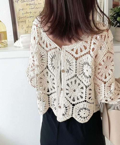 前後2WAYで楽しめる、トレンドライクなクロシェレースカーディガン。