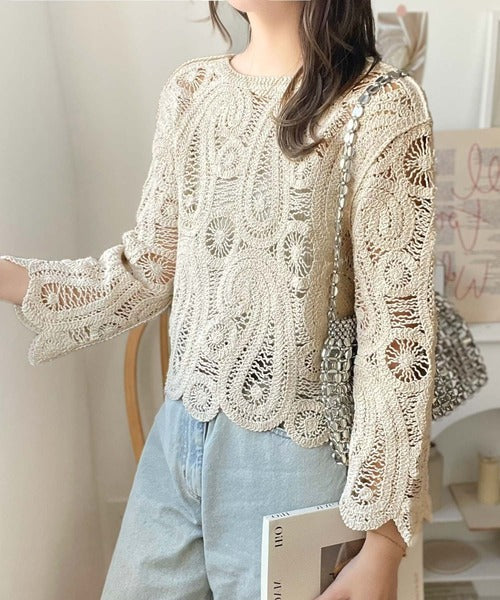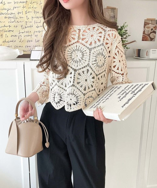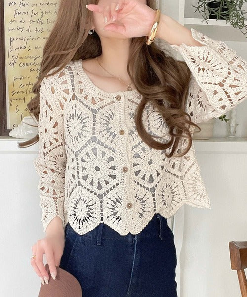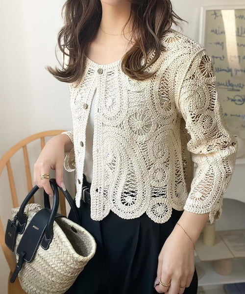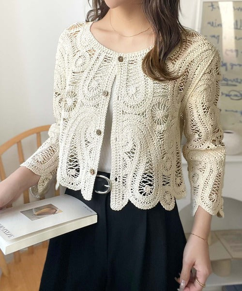 大人フェミニンな透け感トップス。前後2WAYクロシェレースカーディガン ce1110105