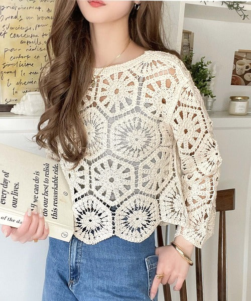 トレンド感のある鍵編みがオシャレな透けニットなので、合わせるインナー次第でロングシーズン楽しめます。