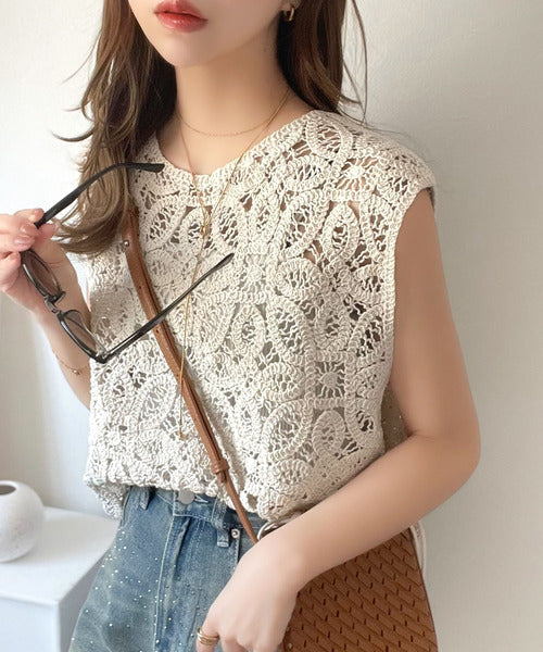 レトロ感漂うトレンド♪前後2WAYクロシェレースフレンチスリーブカットソー ce1110114