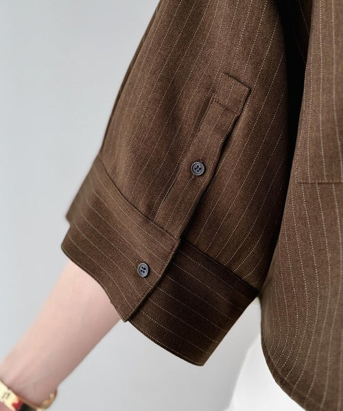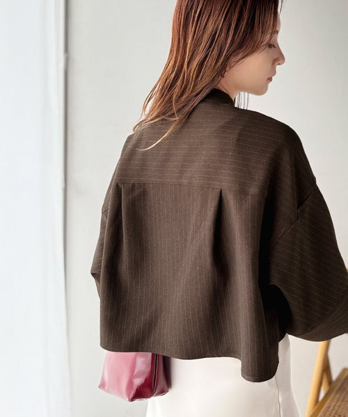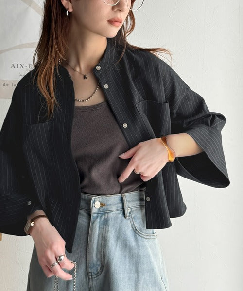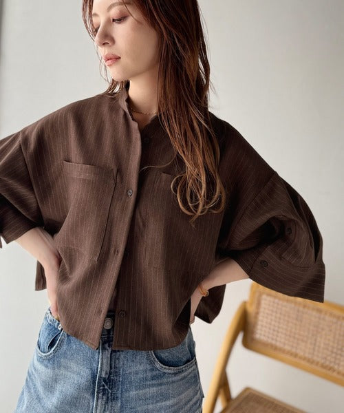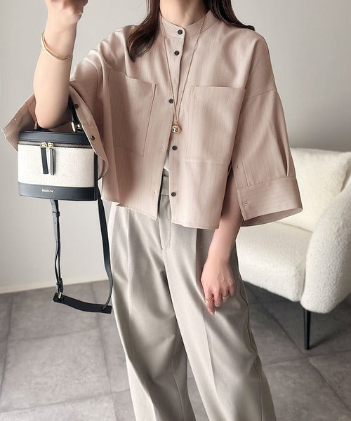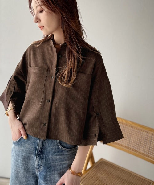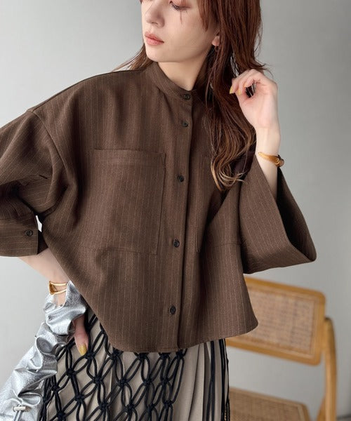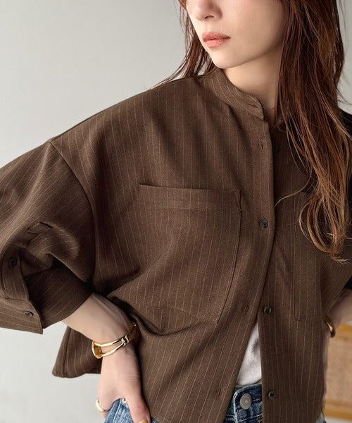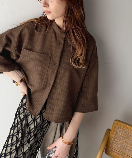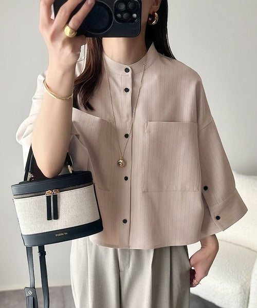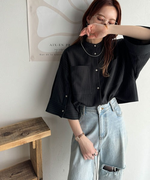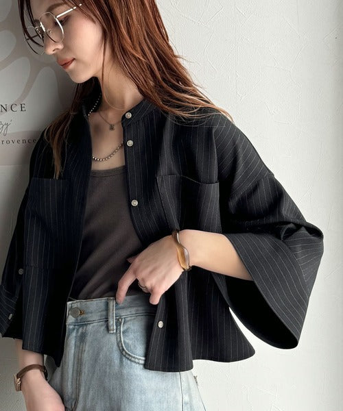 バンドカラーワイドスリーブショート丈ストライプシャツは、様々なスタイルにマッチします。