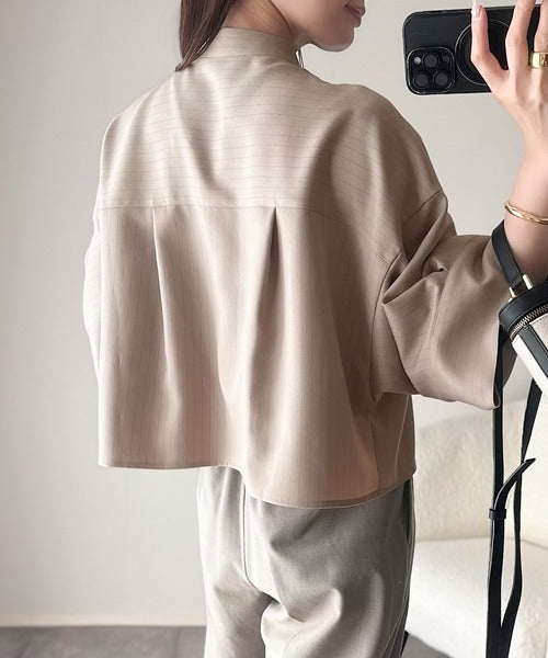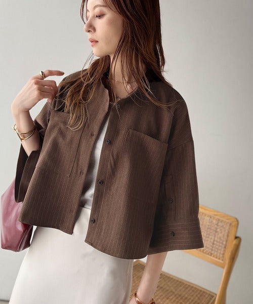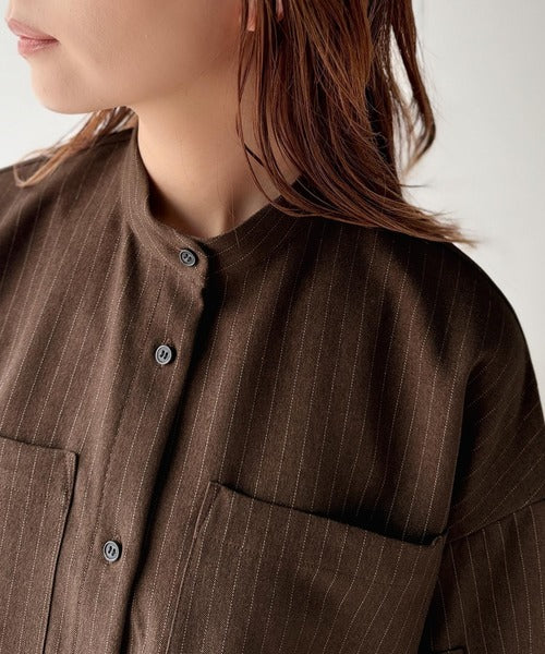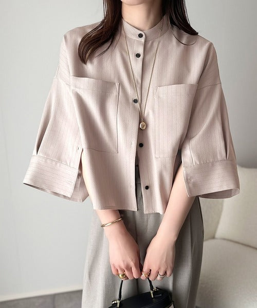 洗練された大人の女性にぴったりな「バンドカラーワイドスリーブショート丈ストライプシャツ」は、