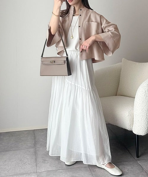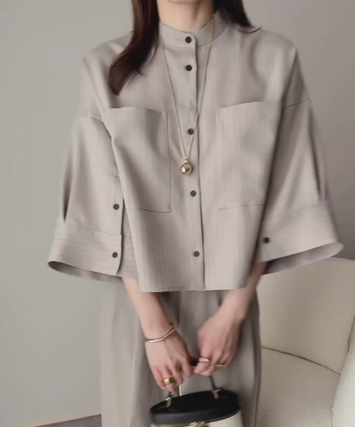 春夏シーズンにおすすめのバンドカラーワイドスリーブシャツ。