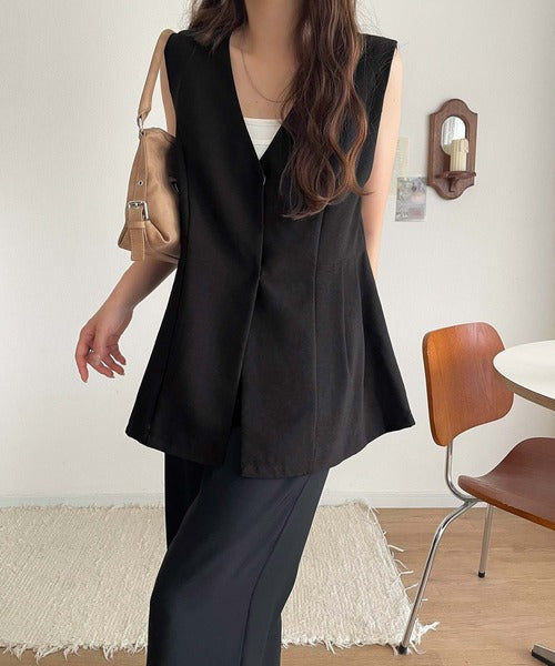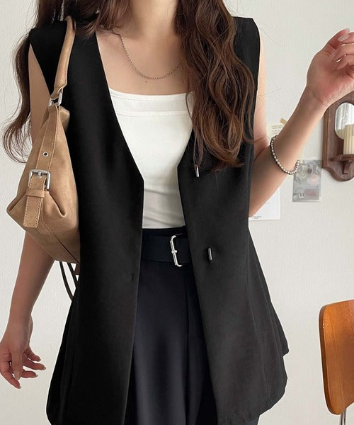 ノーカラー×Vネックがデコルテをきれいに見せ、すっきりとした女性らしい印象に仕上げてくれます。