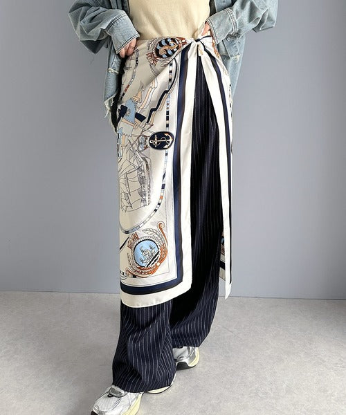 ラップスカート風にボトムスの上からレイヤードして、トレンドを意識したスタイルにも◎。