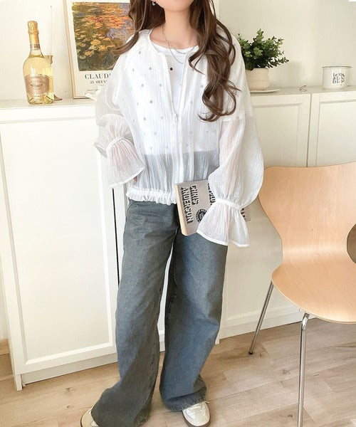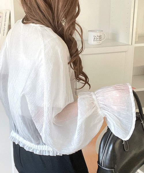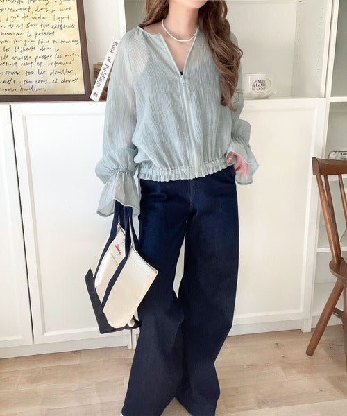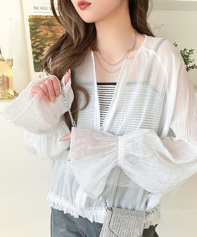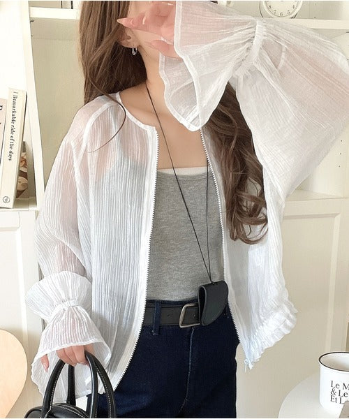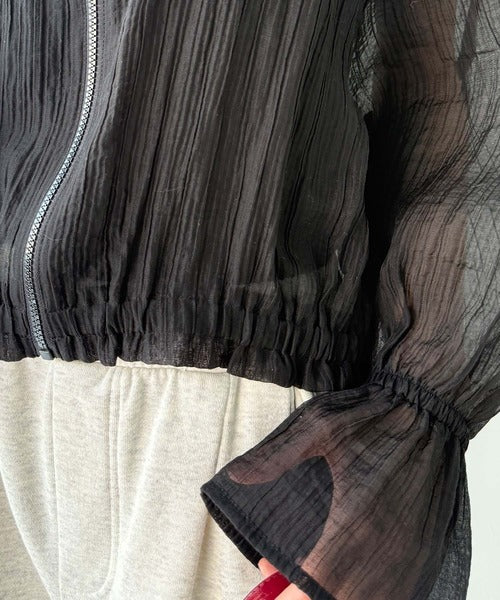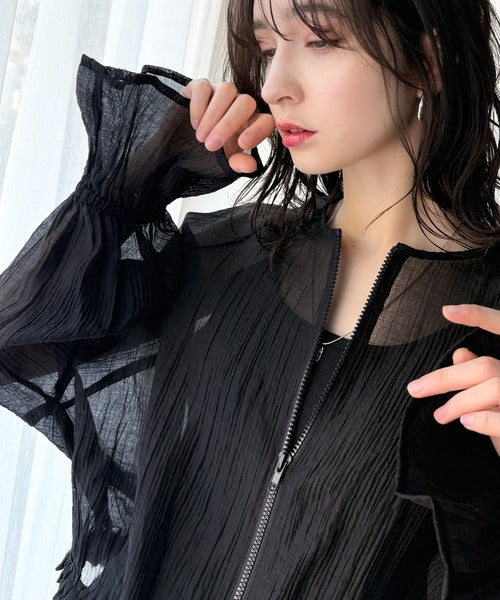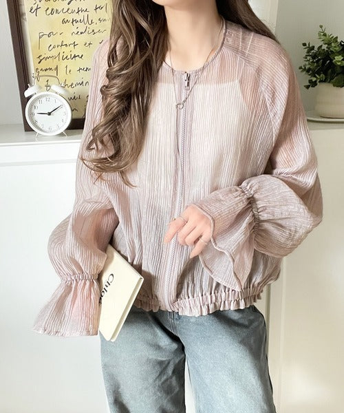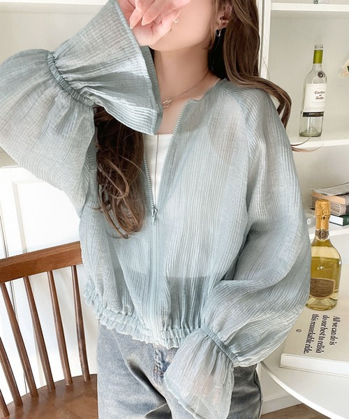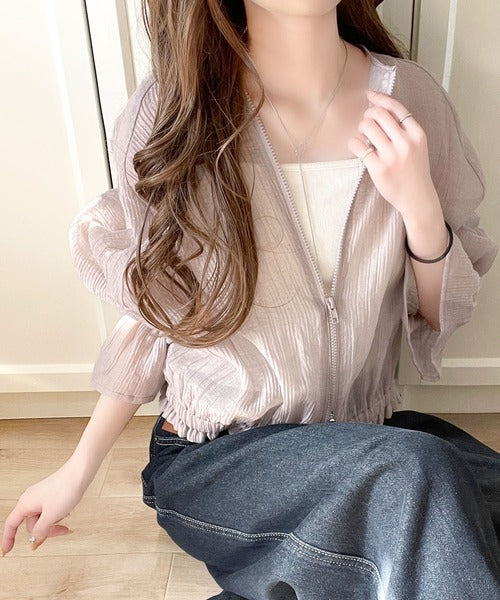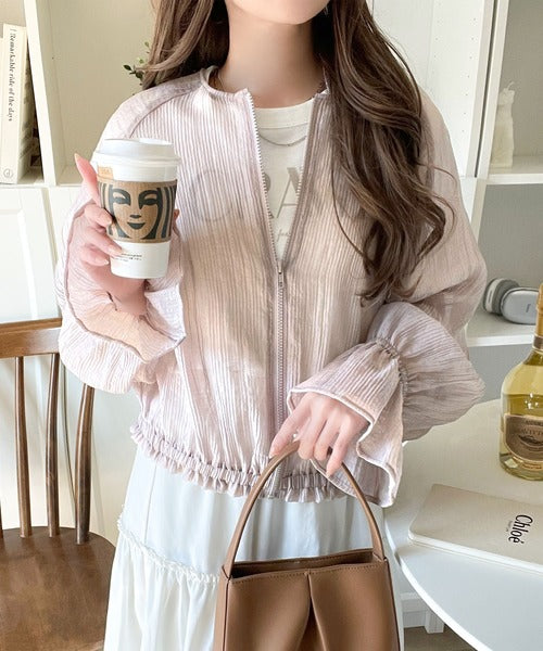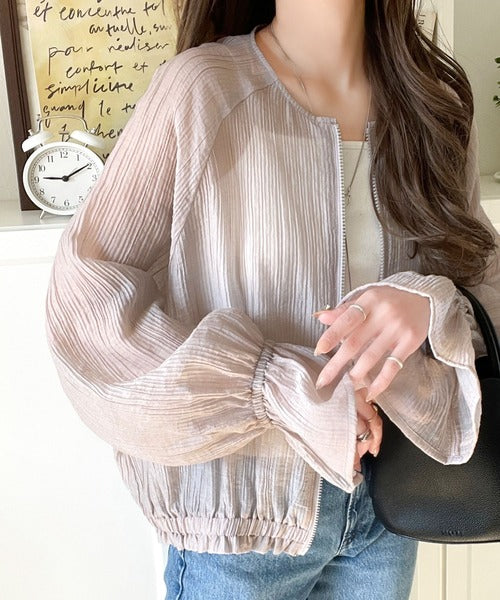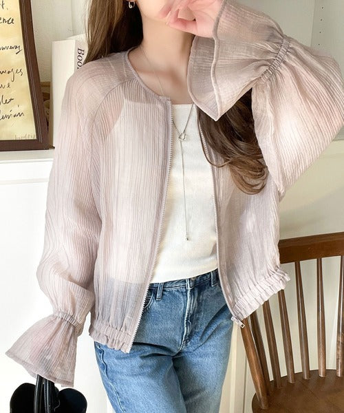 華やかな涼しげスタイル。楊柳シアー素材袖フリルクロップド丈ブルゾン(長袖) ce1240068