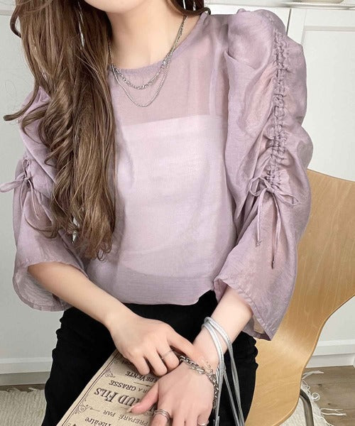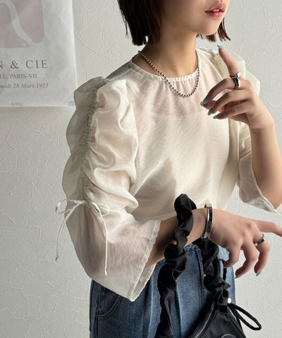 袖のギャザーの分量をドロスト紐で調整できる、大人かわいいブラウス。