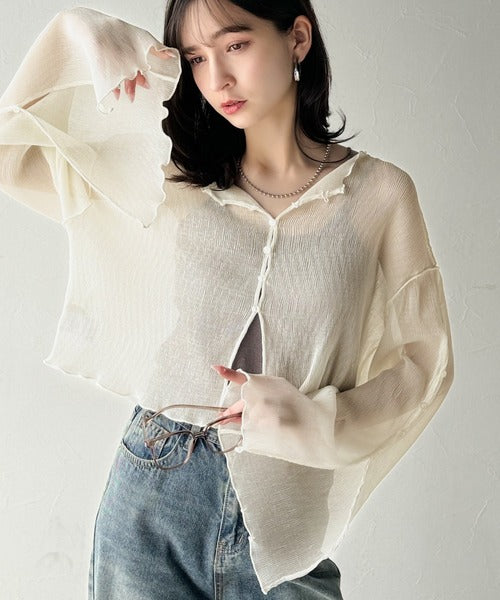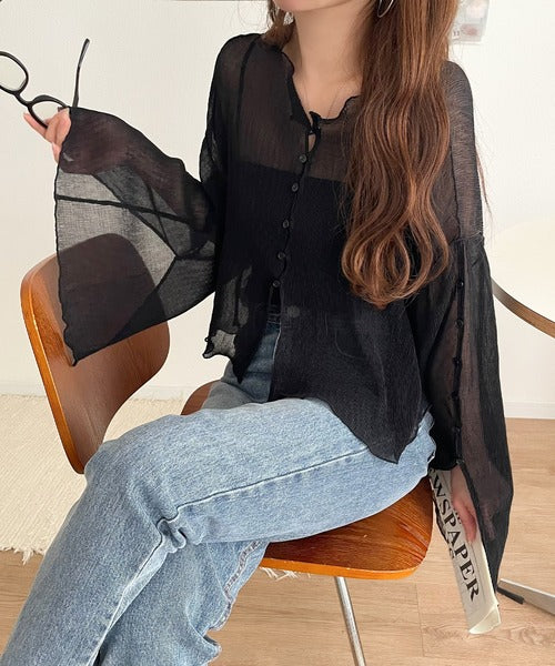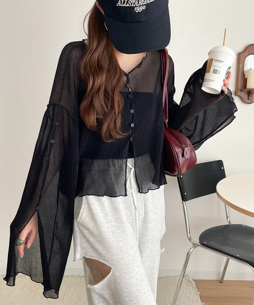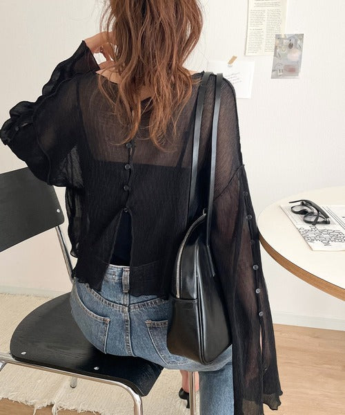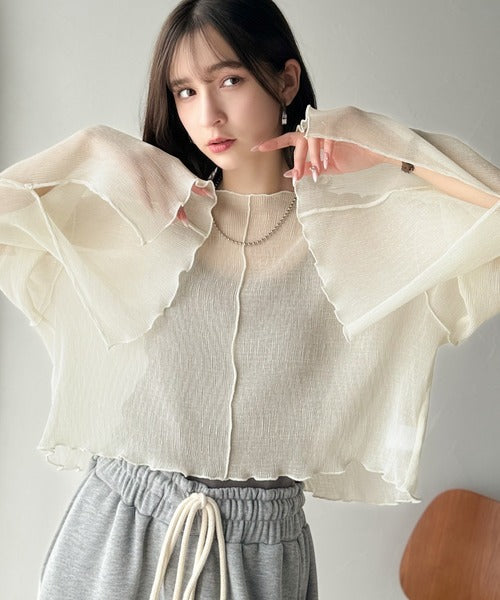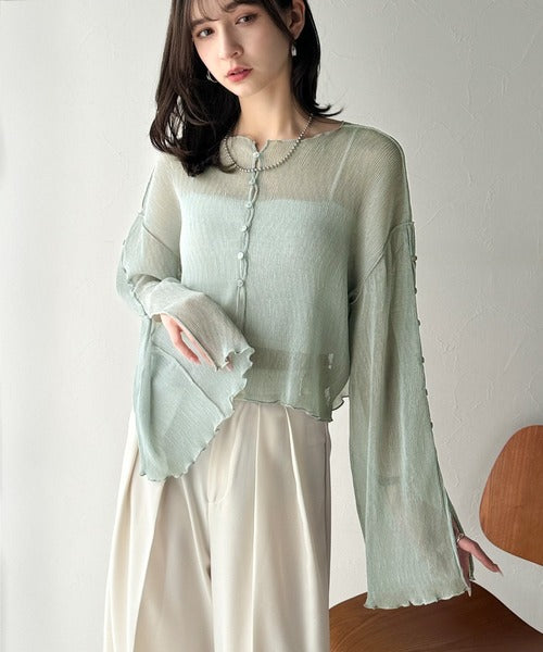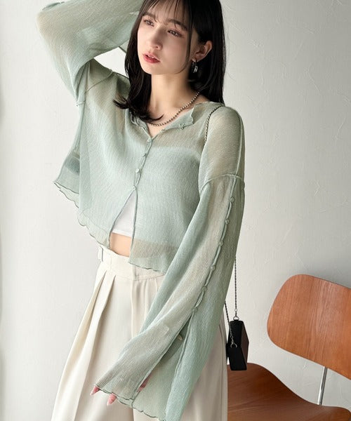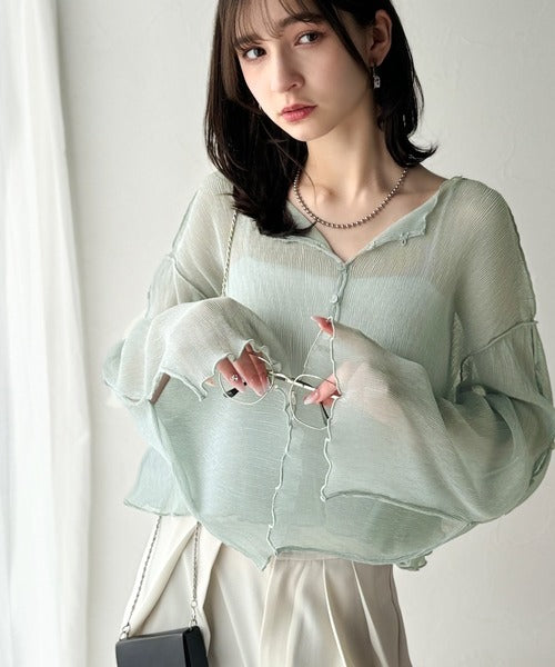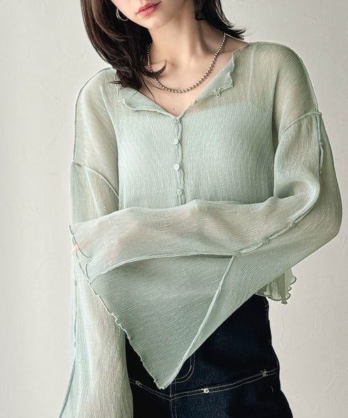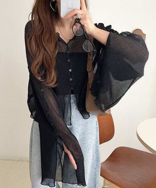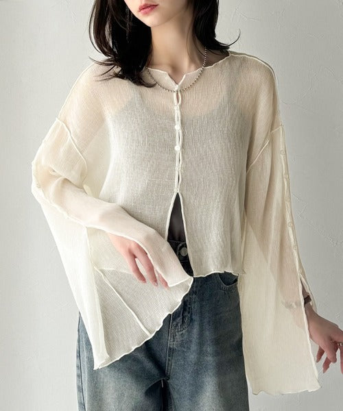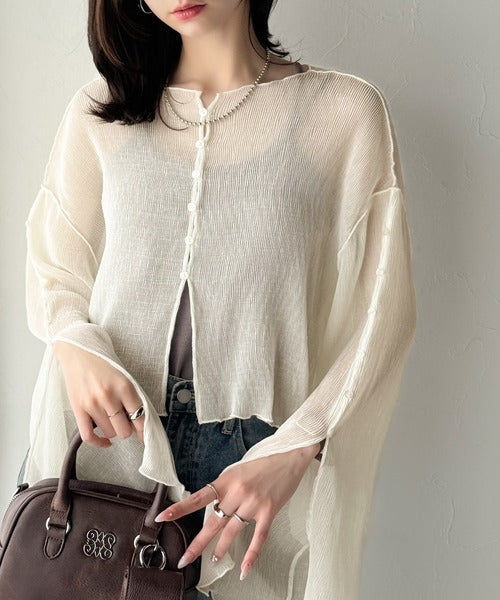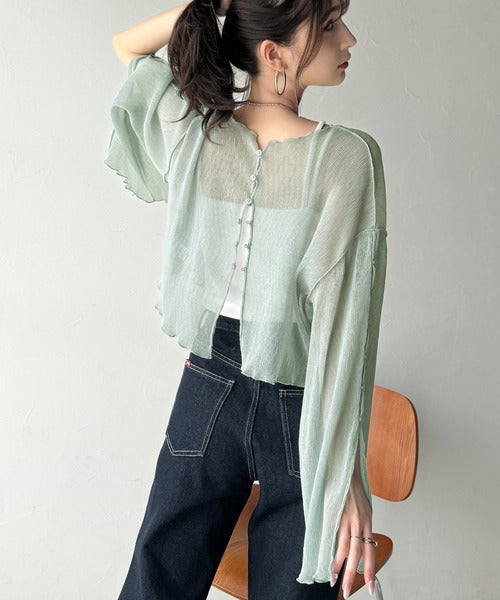 大人の上品な透け感を纏う。前後2wayシアー楊柳素材フレアスリーブブラウスカーディガン(長袖) ce1240083