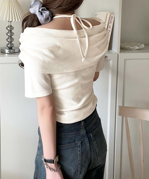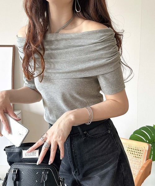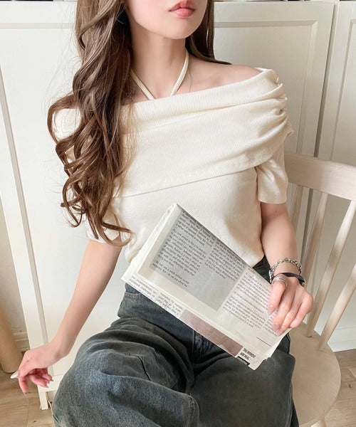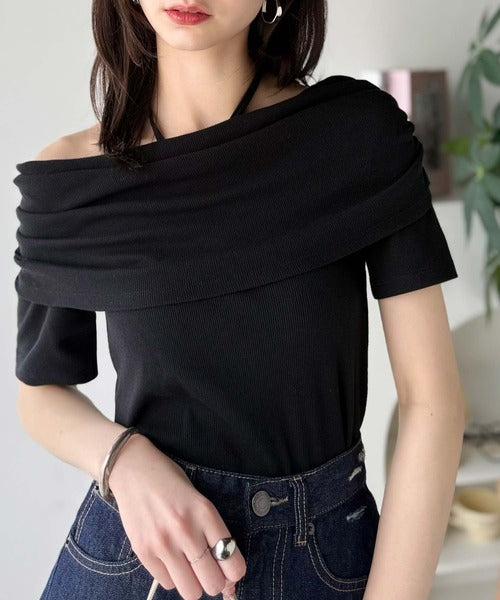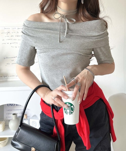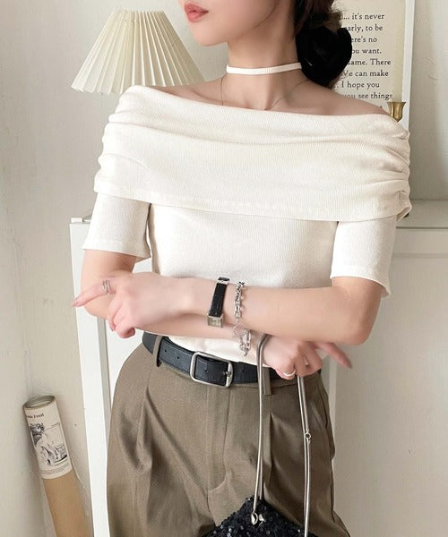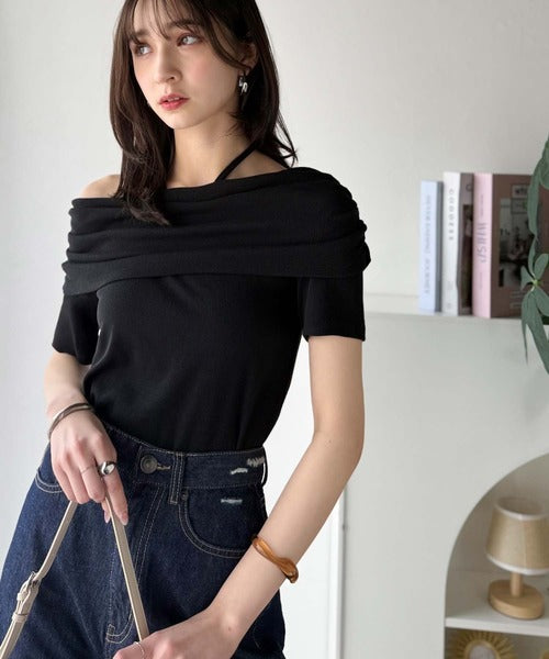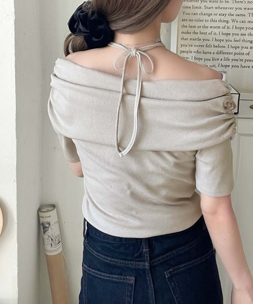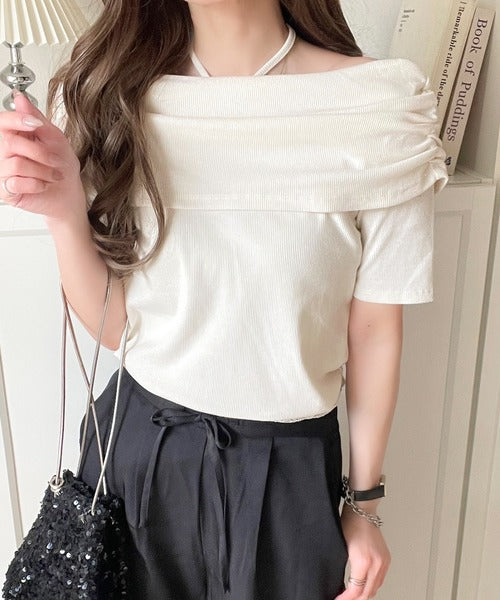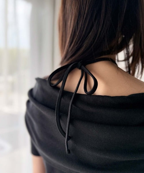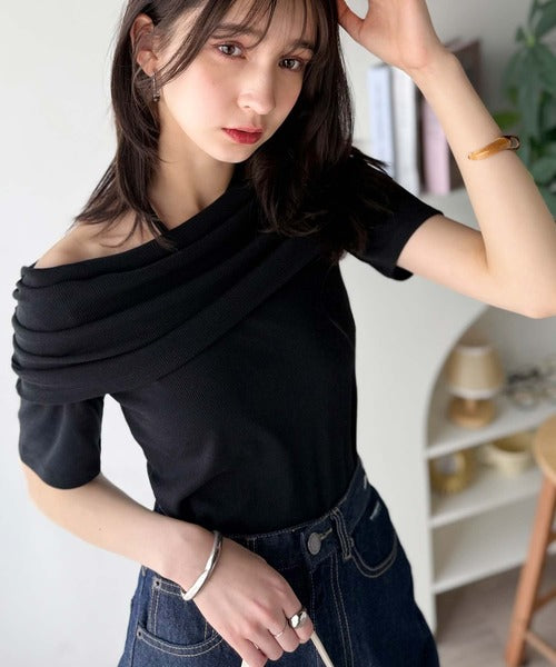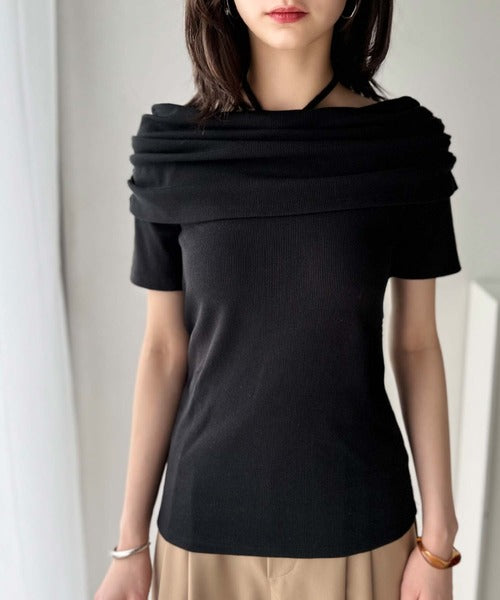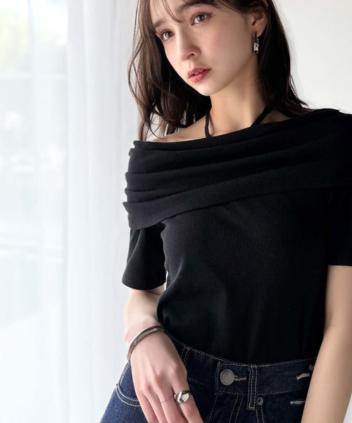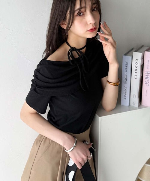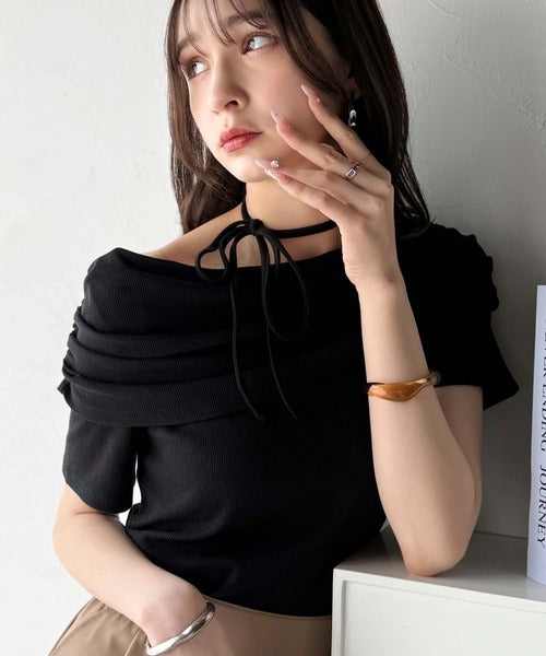 視線を奪う、美デコルテ。華奢見えを叶える、絶妙ドレープが◎ タイ付き五分袖オフショルトップス ce1240086