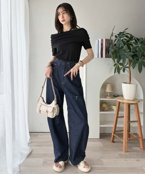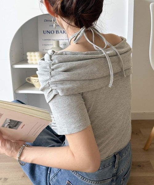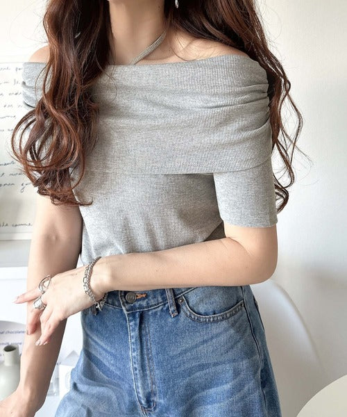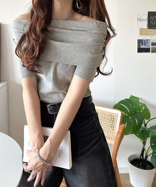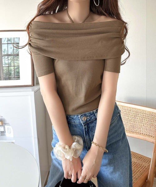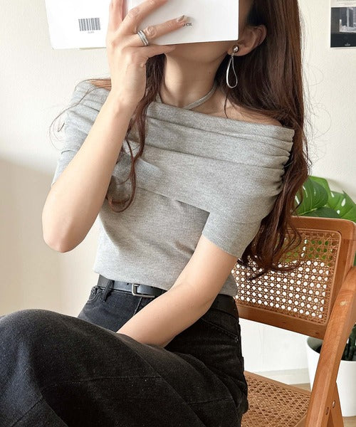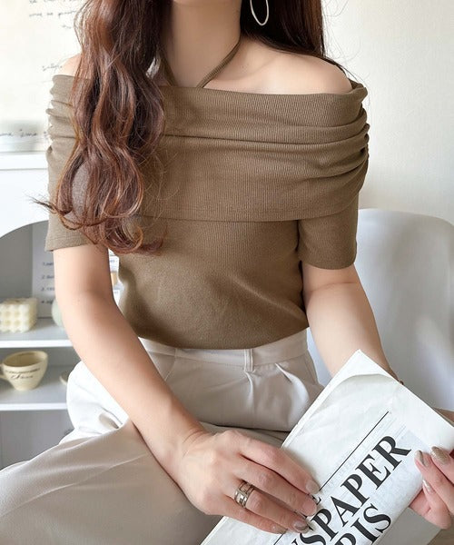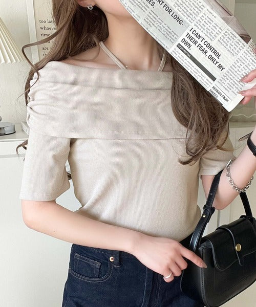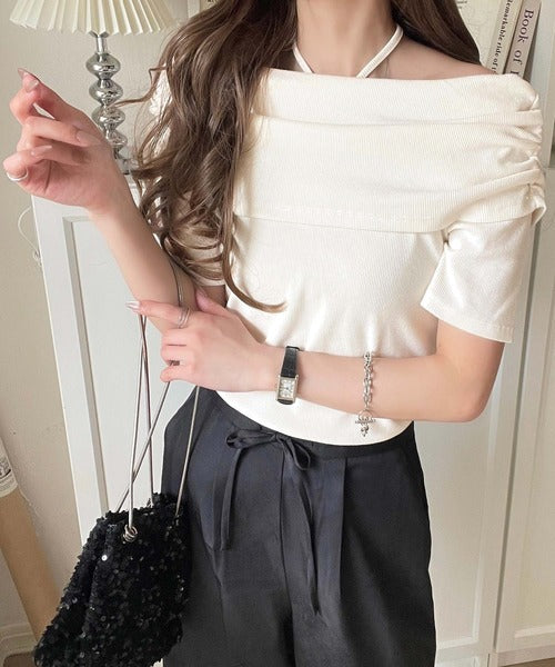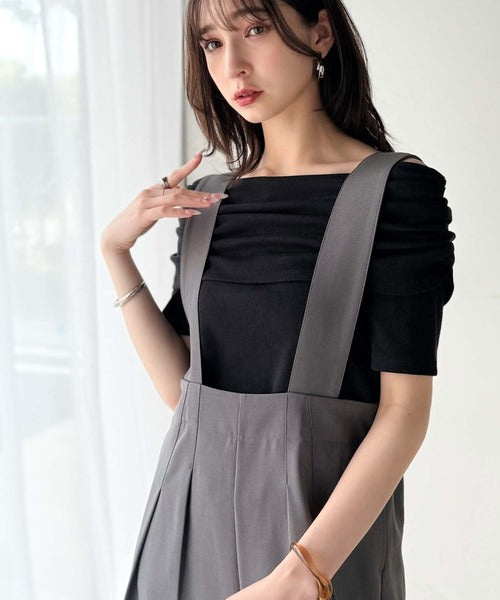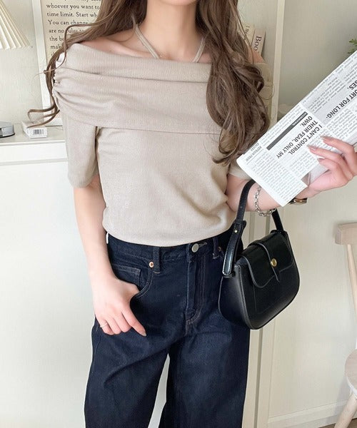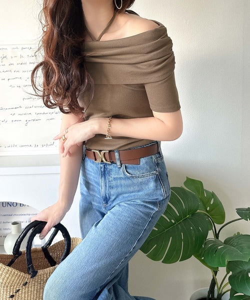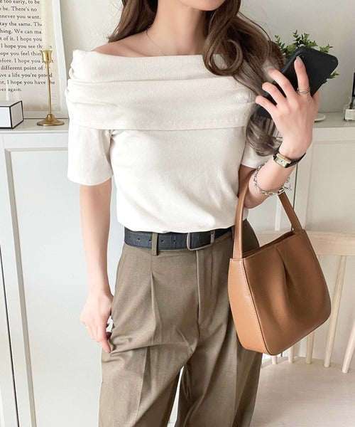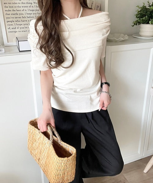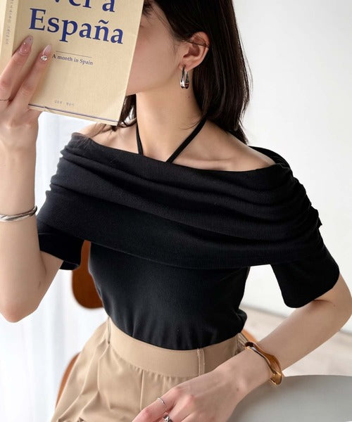 視線を奪う、美デコルテ。華奢見えを叶える、絶妙ドレープが◎ タイ付き五分袖オフショルトップス ce1240086