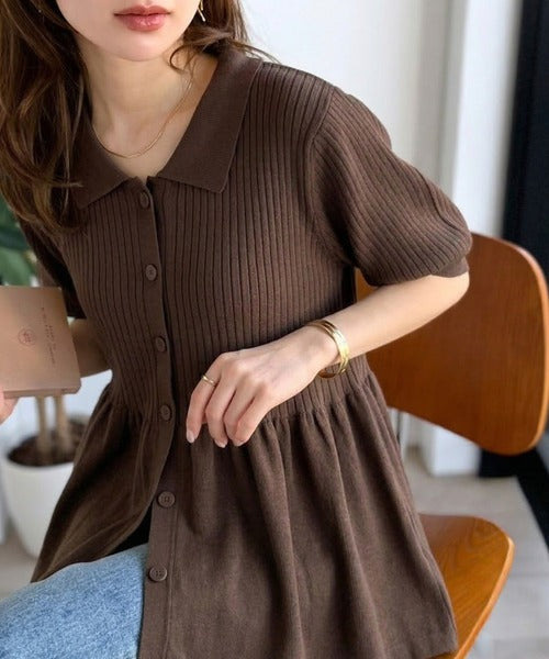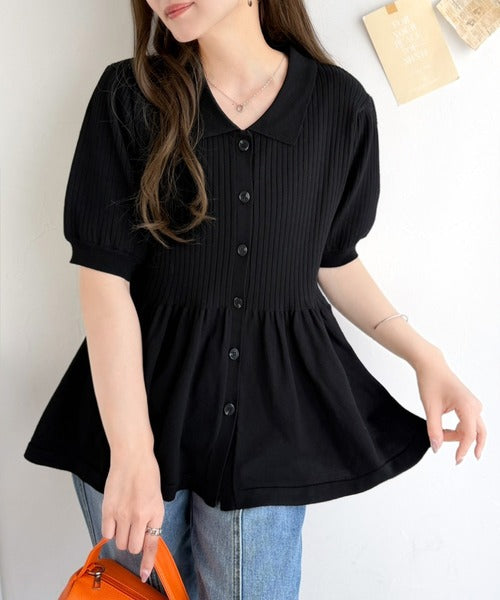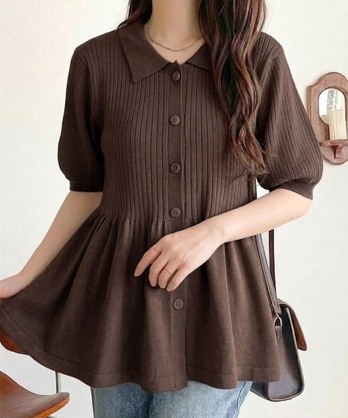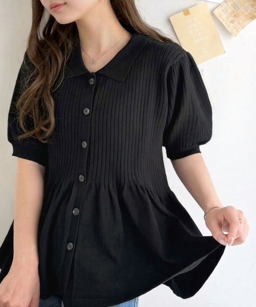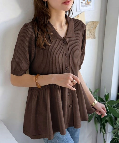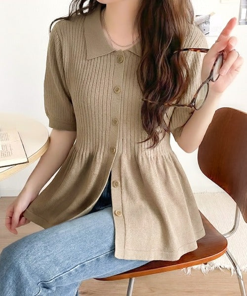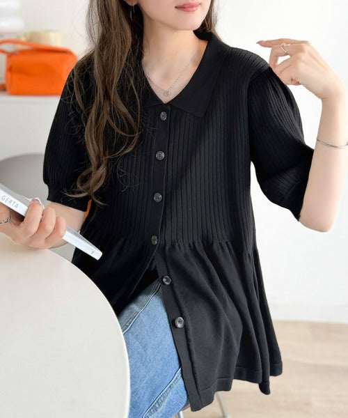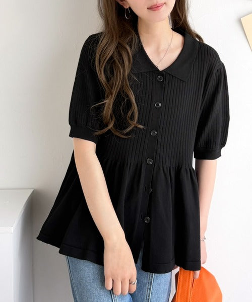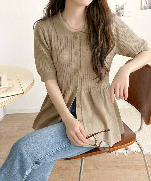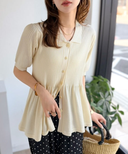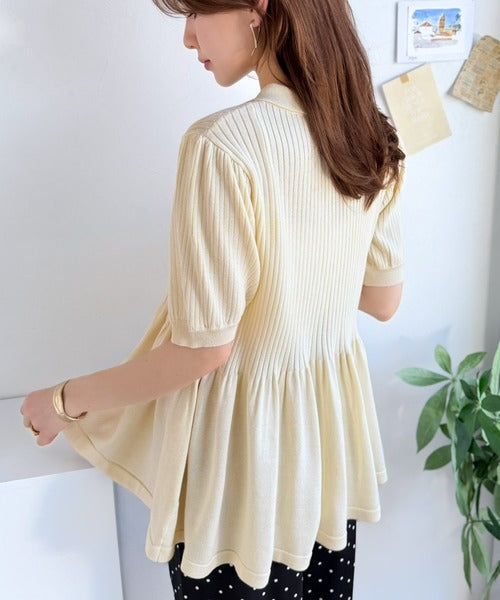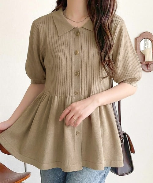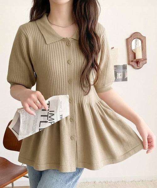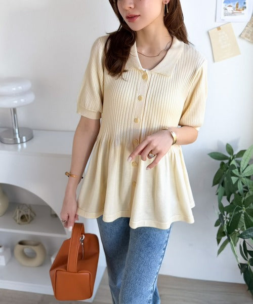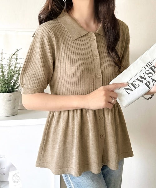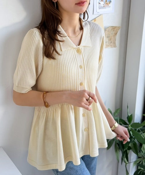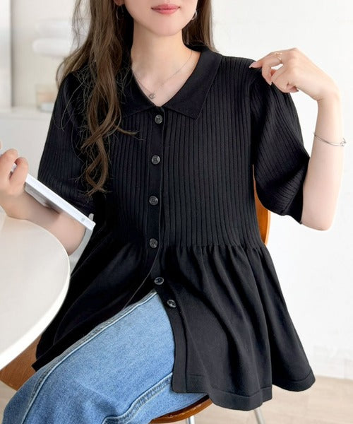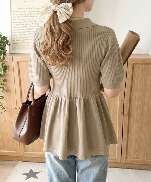 'メリハリ'シルエットで即きれい見え♪ポロ襟ペプラム5分袖リブニットプルオーバー ce1240118