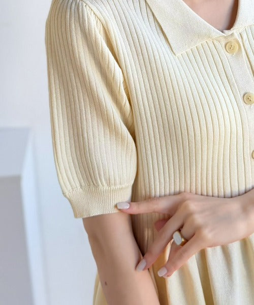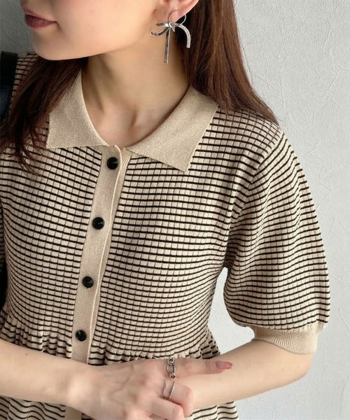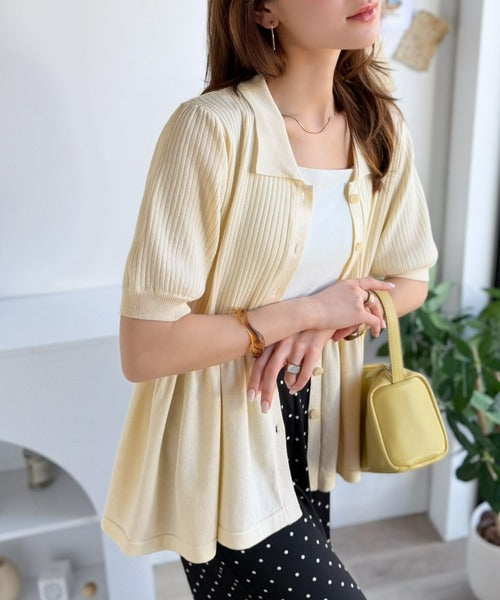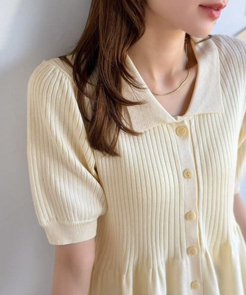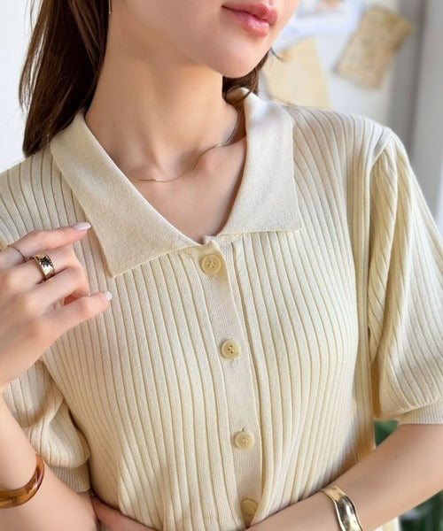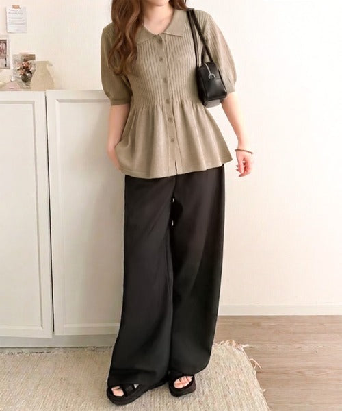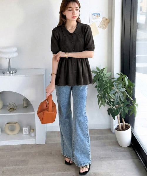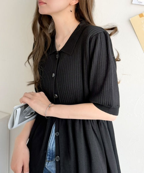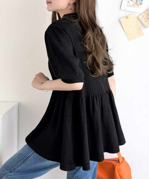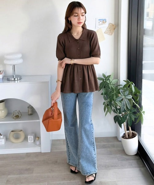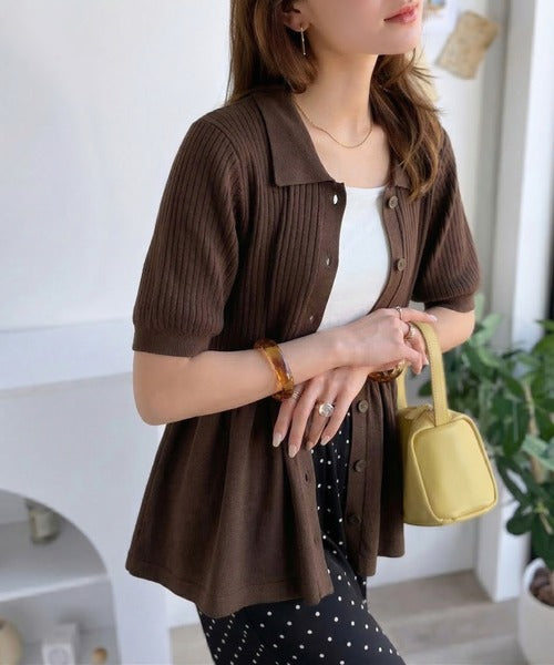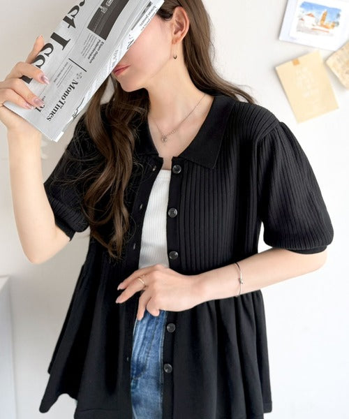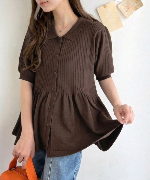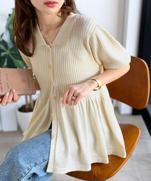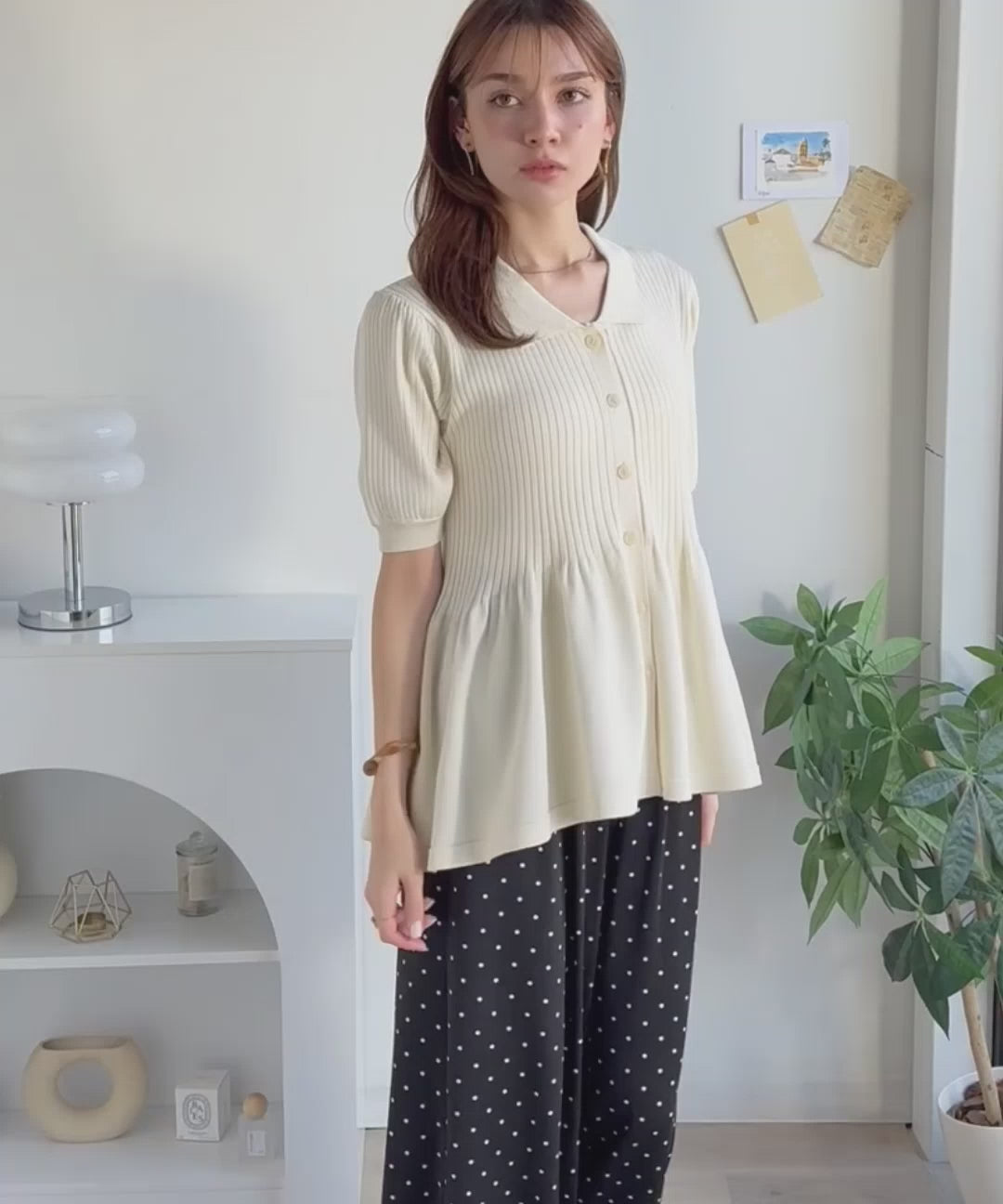 'メリハリ'シルエットで即きれい見え♪ポロ襟ペプラム5分袖リブニットプルオーバー ce1240118