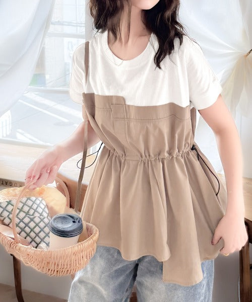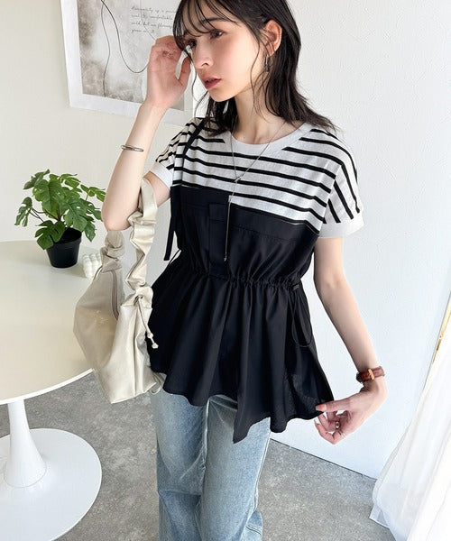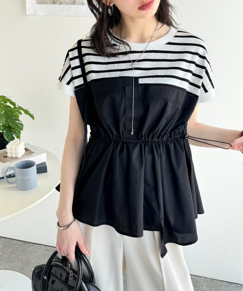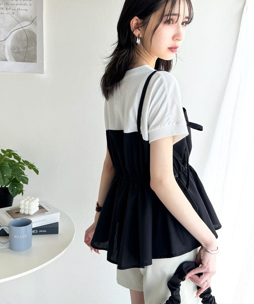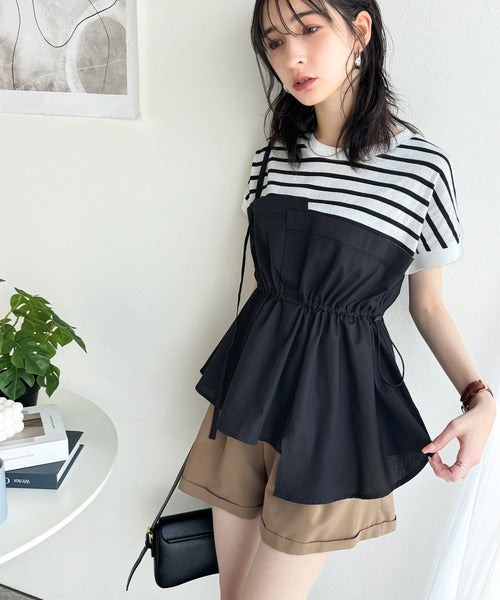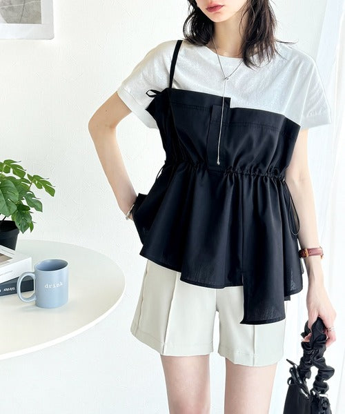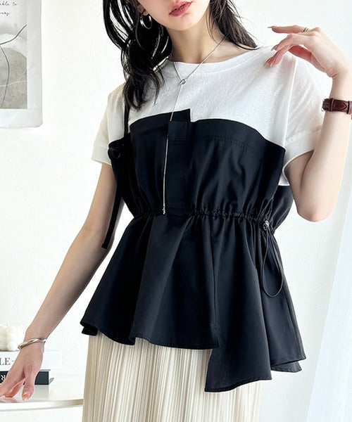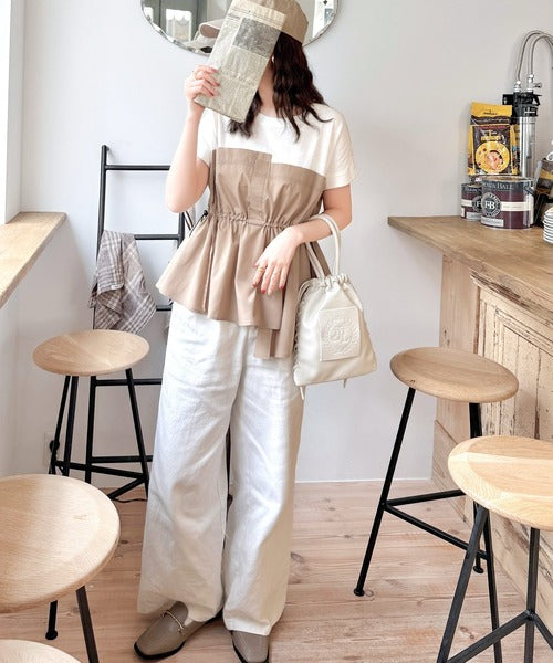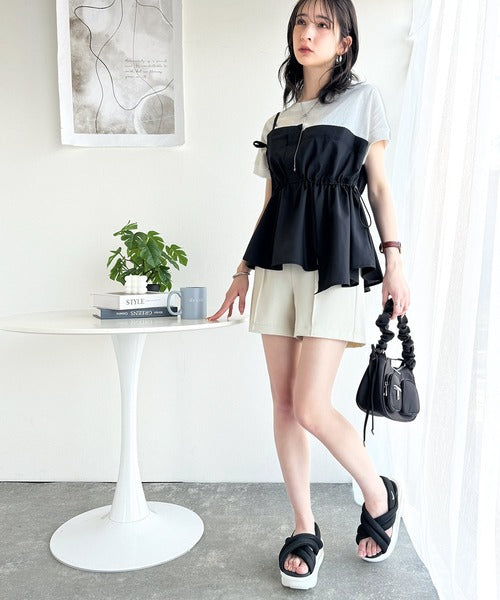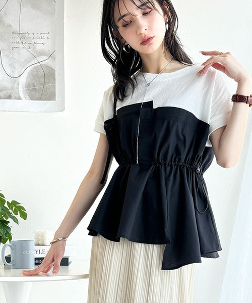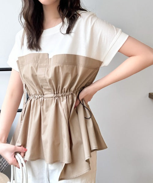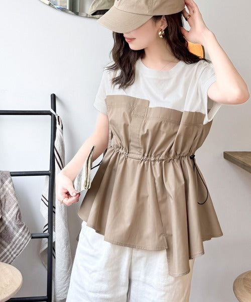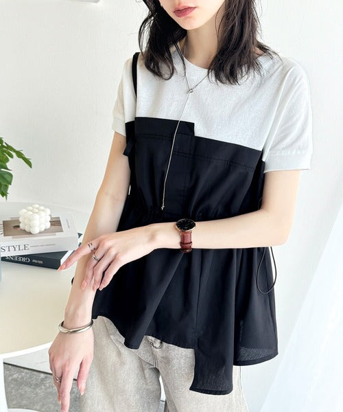 上部はさらりとした綿100%のTシャツ、下部は軽やかな布帛素材で作られ、異素材の組み合わせが新鮮。