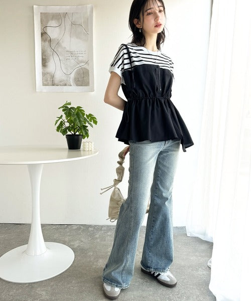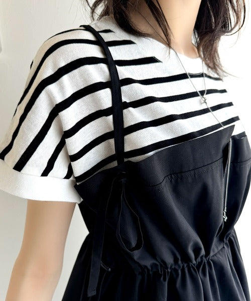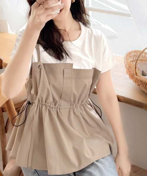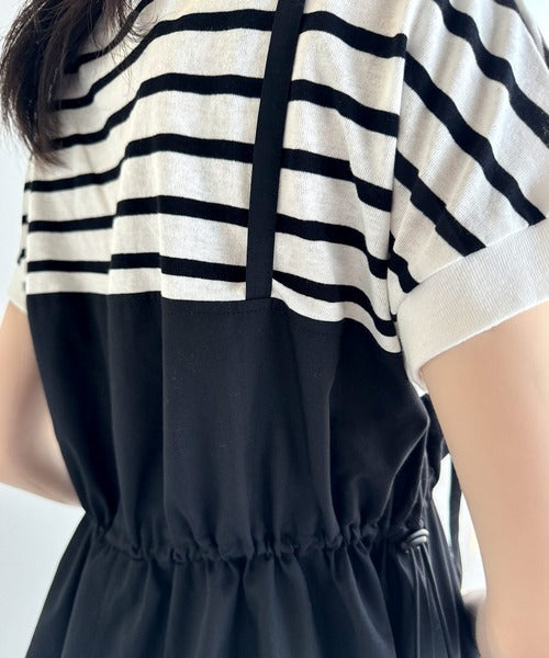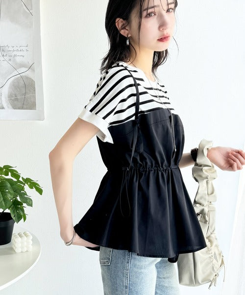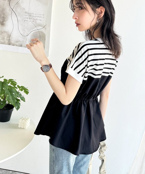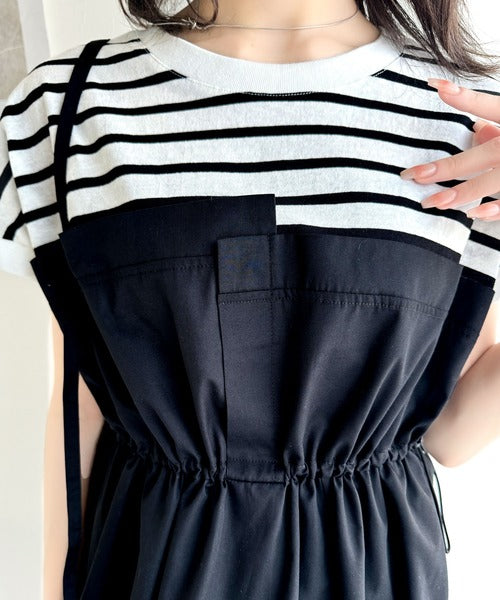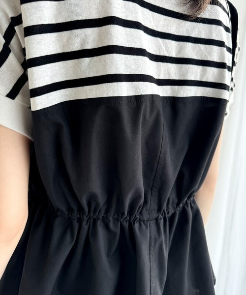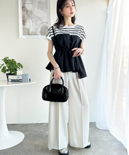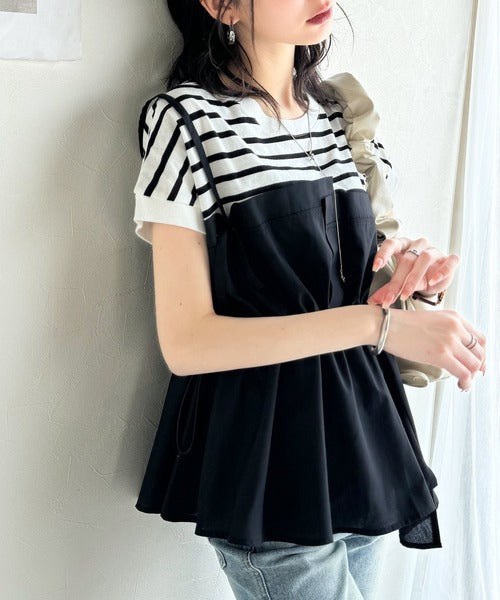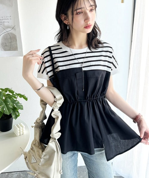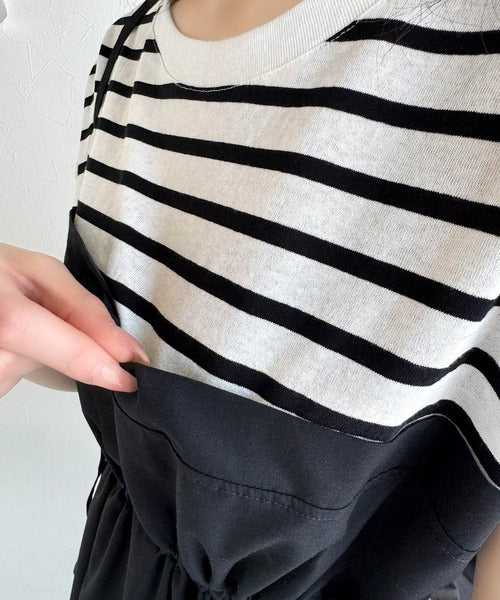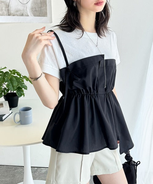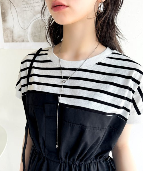 上部はさらりとした綿100%のTシャツ、下部は軽やかな布帛素材で作られ、異素材の組み合わせが新鮮。