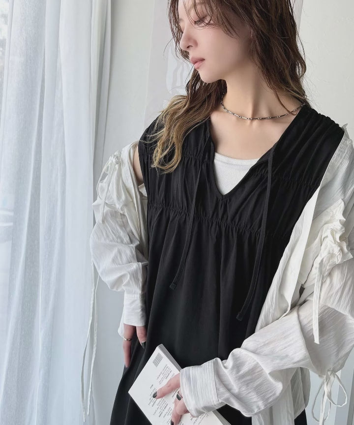 きれいめスタイルを楽しみたいときは、シアートップスやブラウスを合わせてジレを重ねるのがおすすめ。