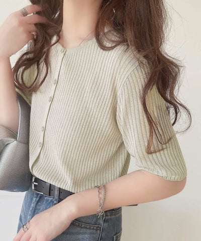 シアーな素材感と、縦ラインを強調するリブ編みが魅力の半袖カーディガン。