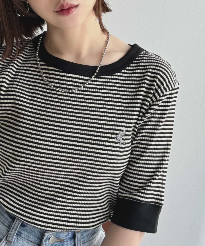 大人可愛いの新定番。袖リンガーボートネック胸刺繍ボーダーTシャツ(半袖) ce1260419