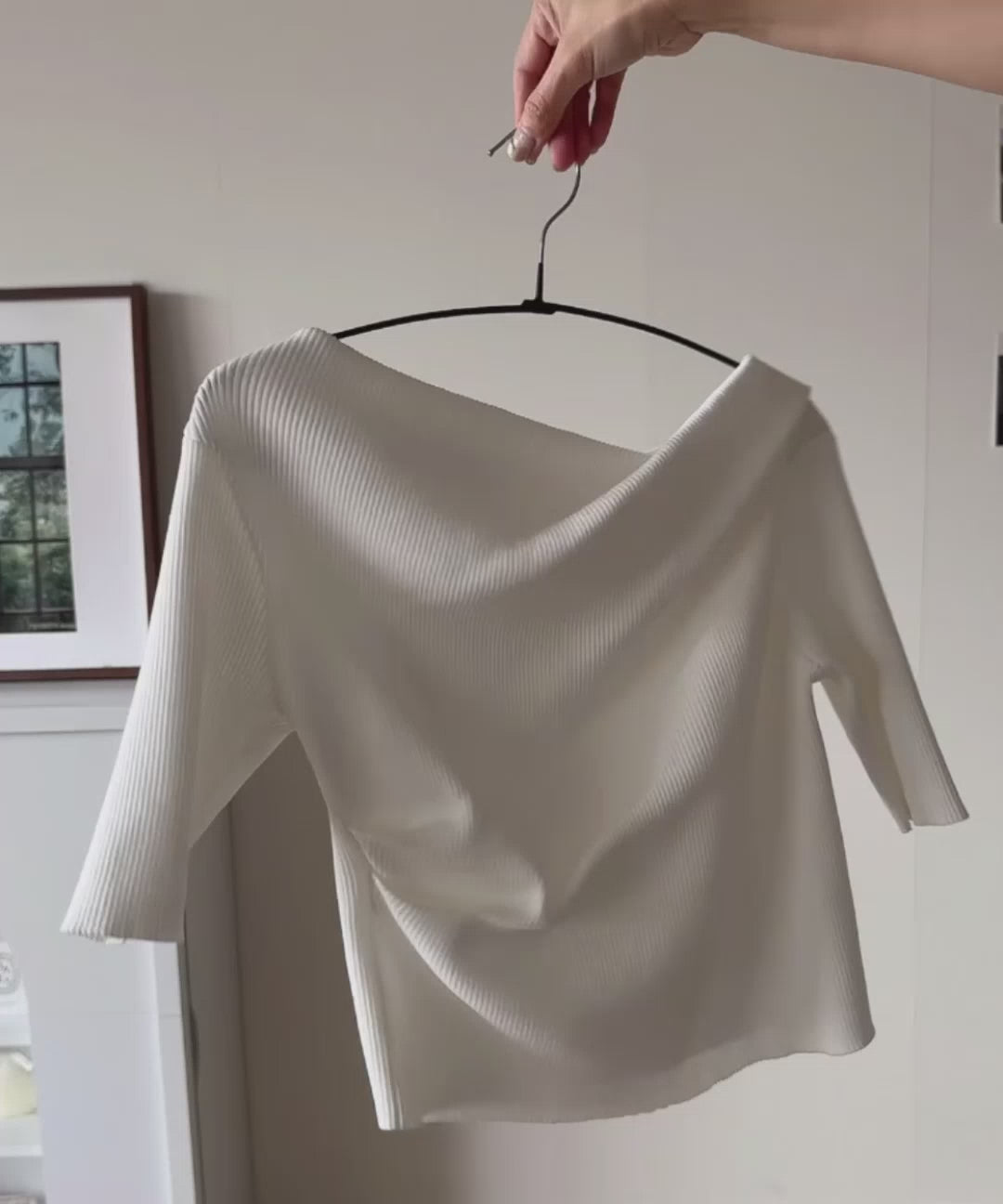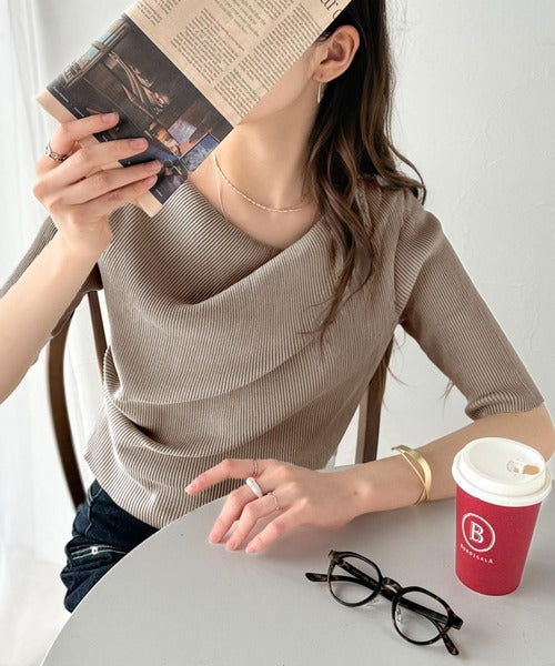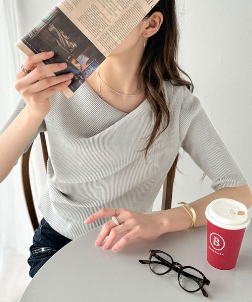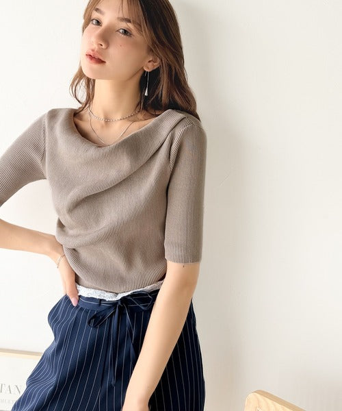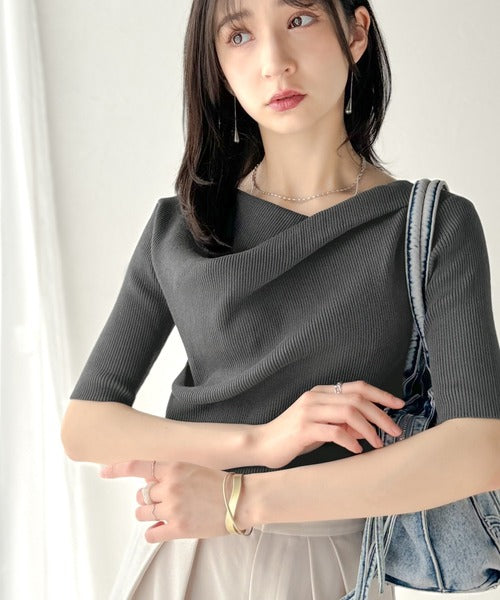 大人気、デコルテを美しく魅せるドレープデザインニットに5分袖バージョンが登場!