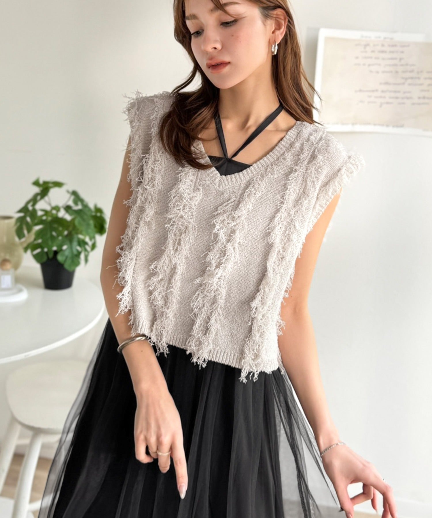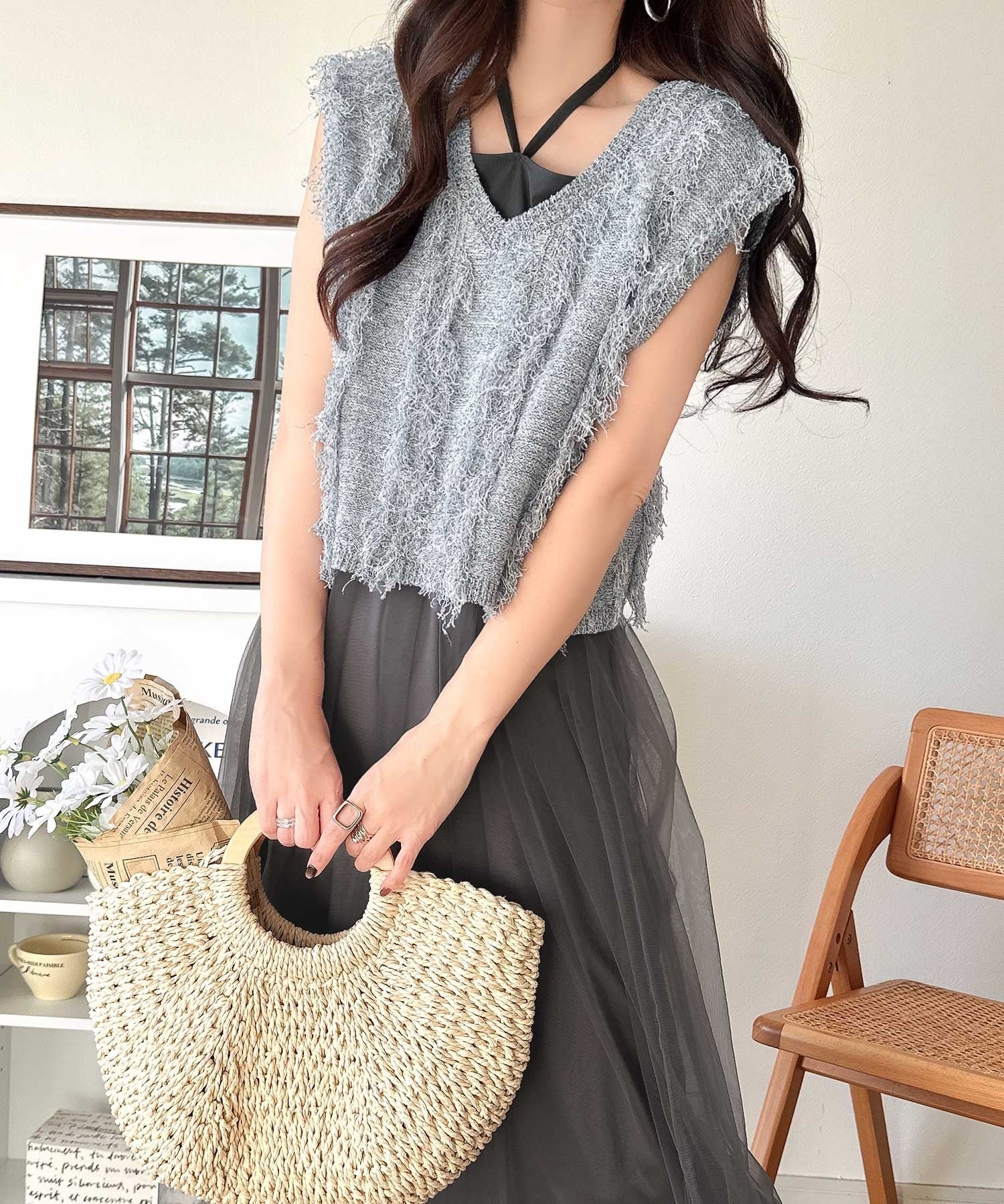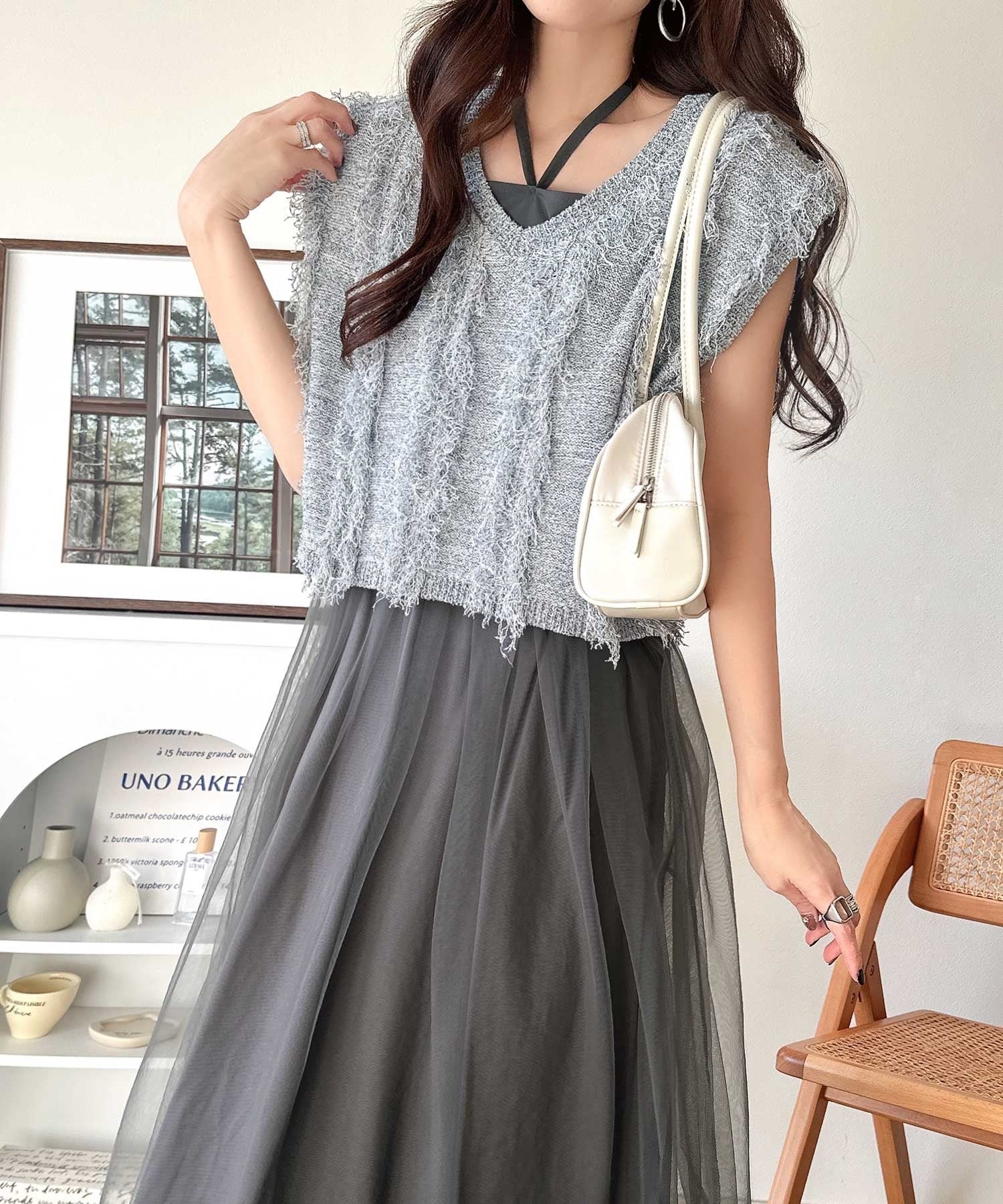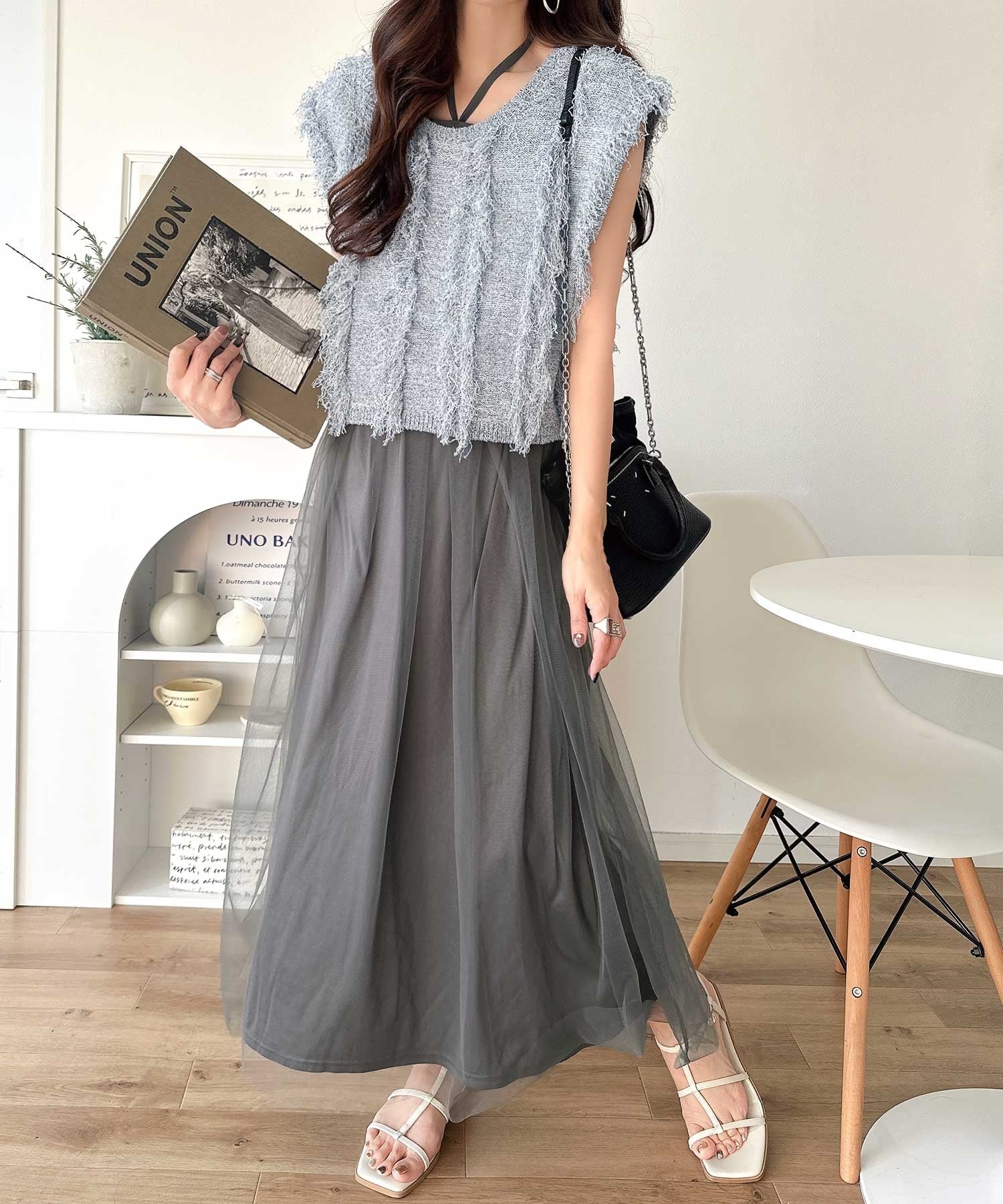 フリンジニット×フレアチュールの華やかセットアイテム。