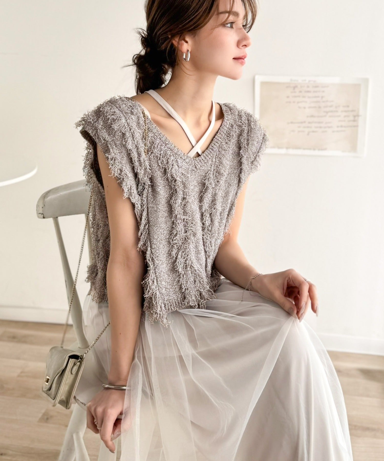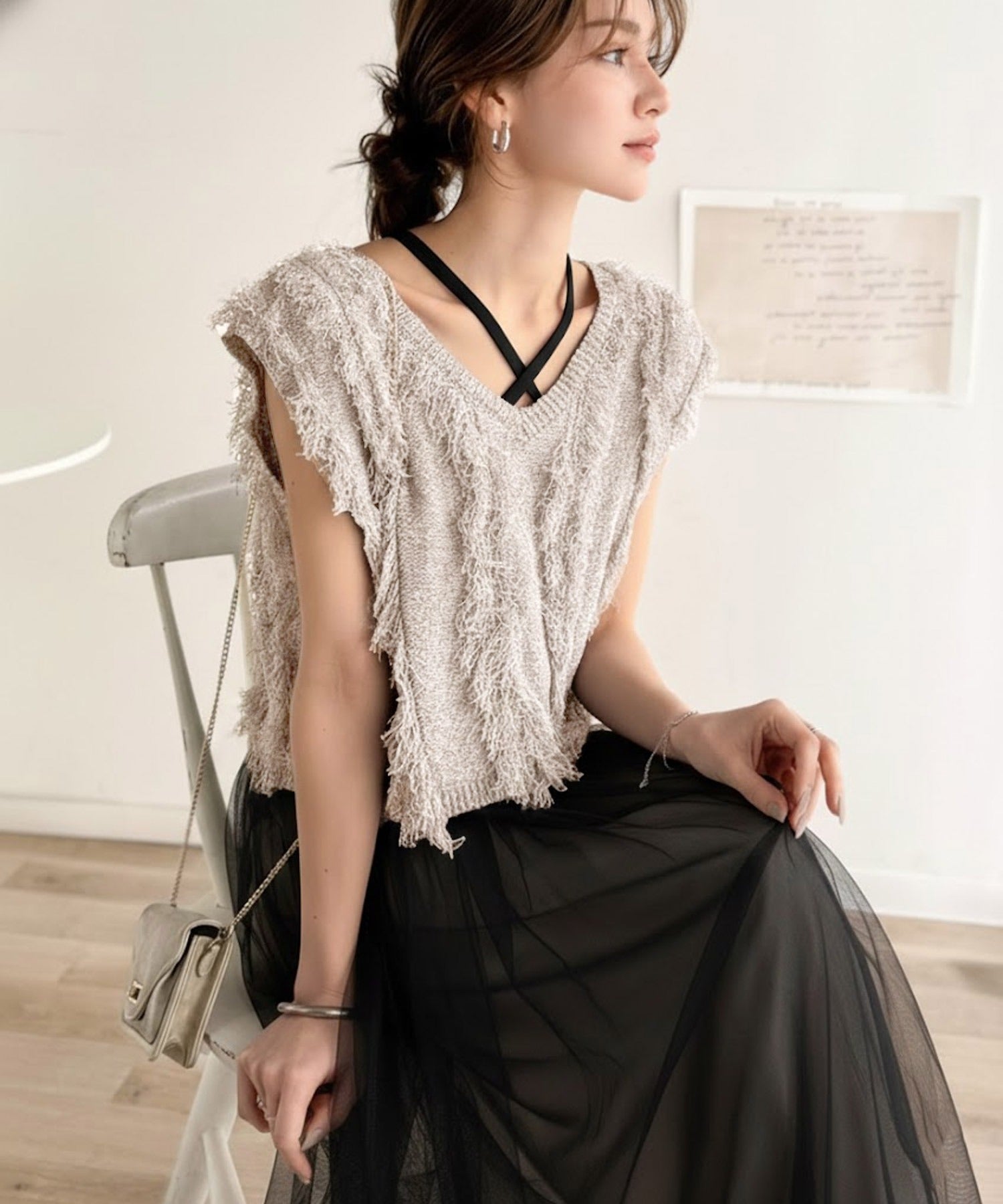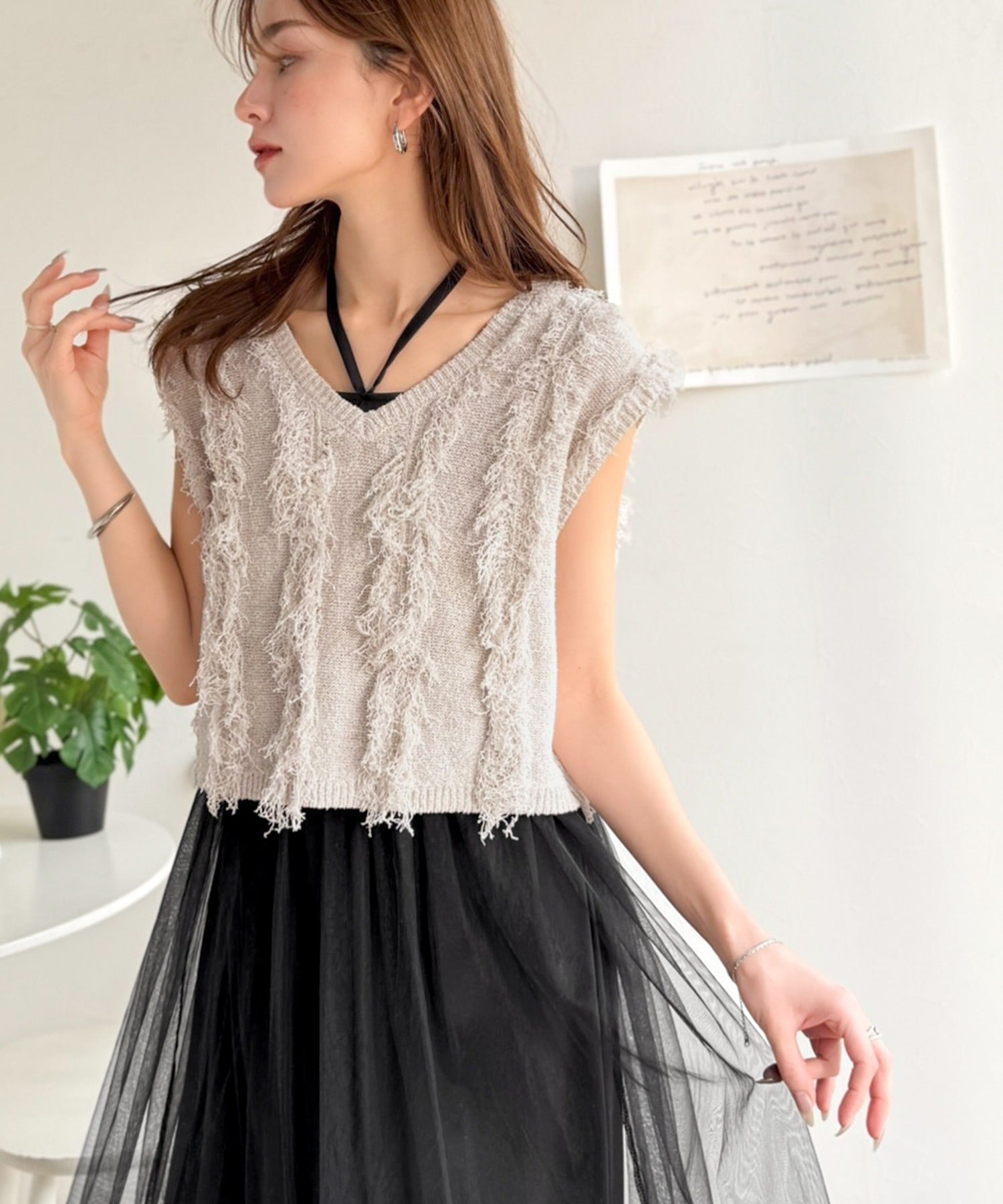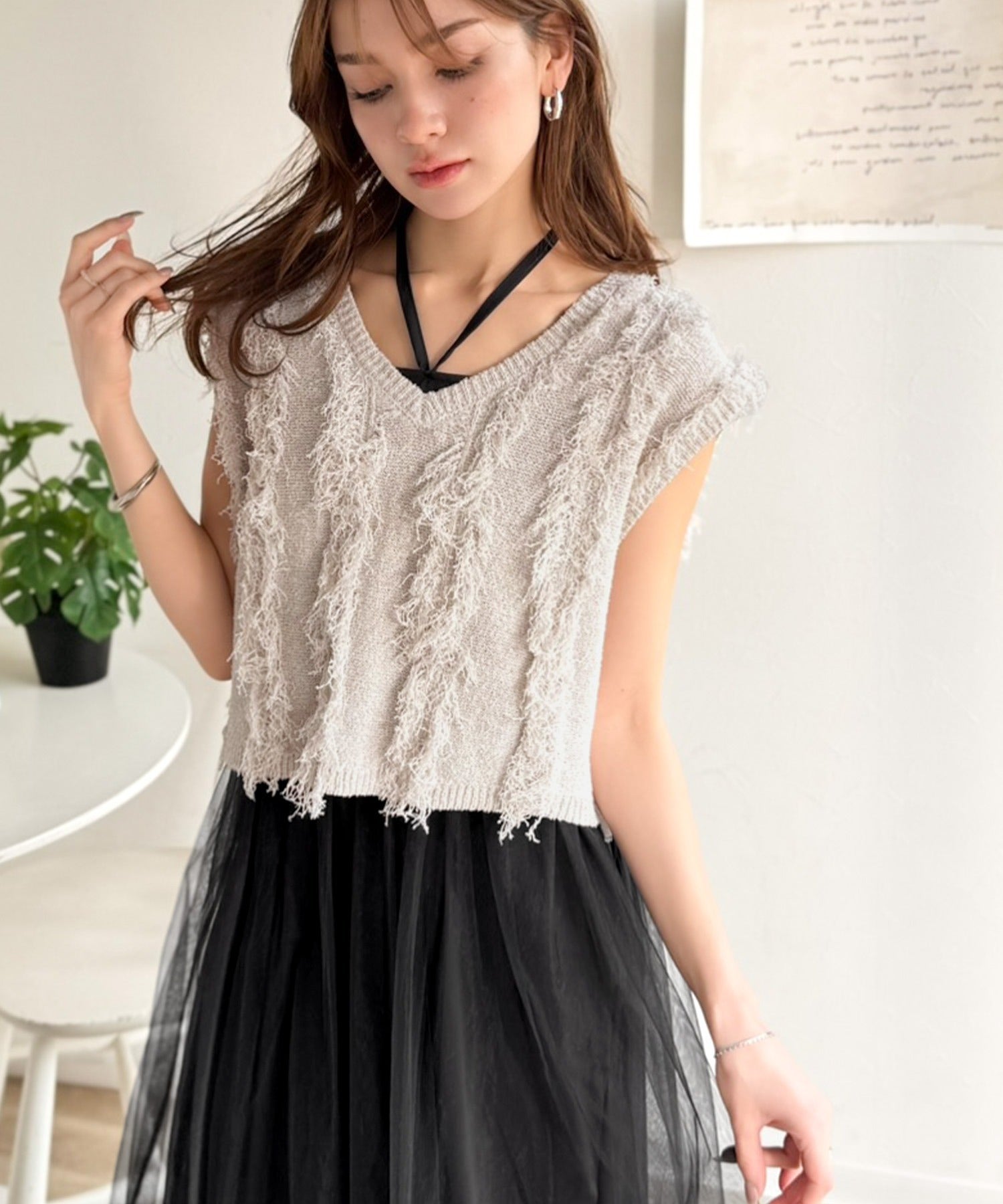 フリンジニット×フレアチュールの華やかセットアイテム。