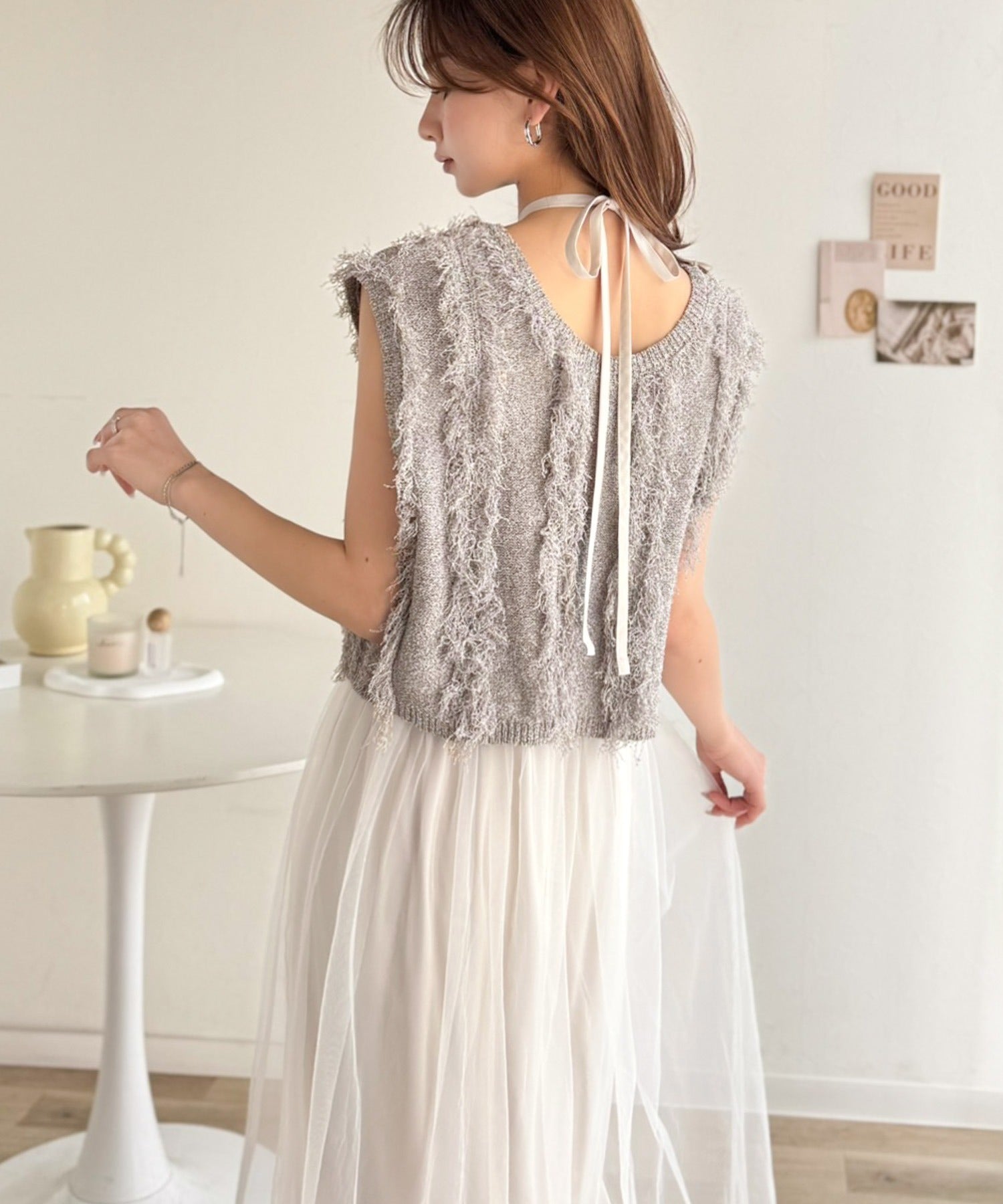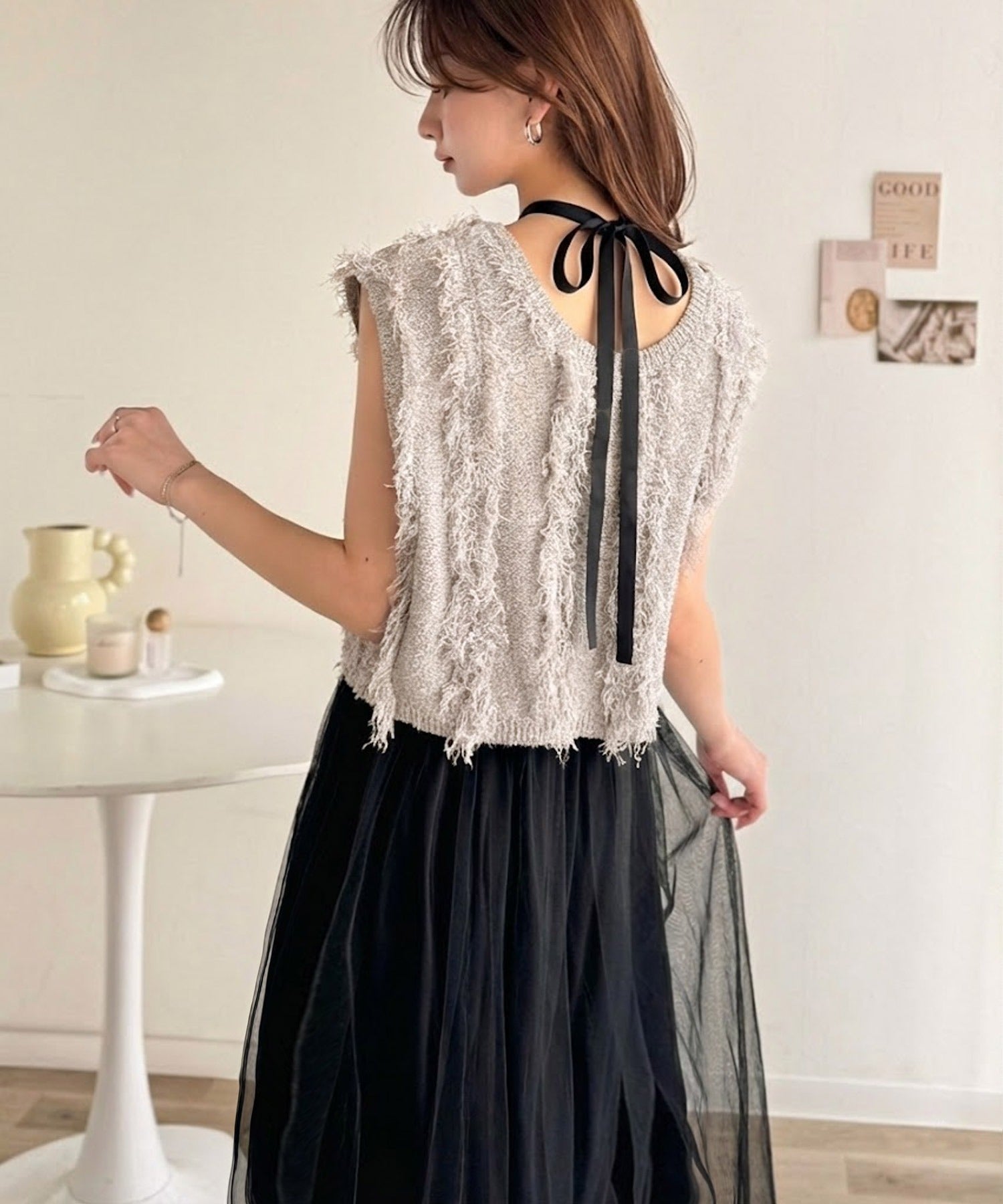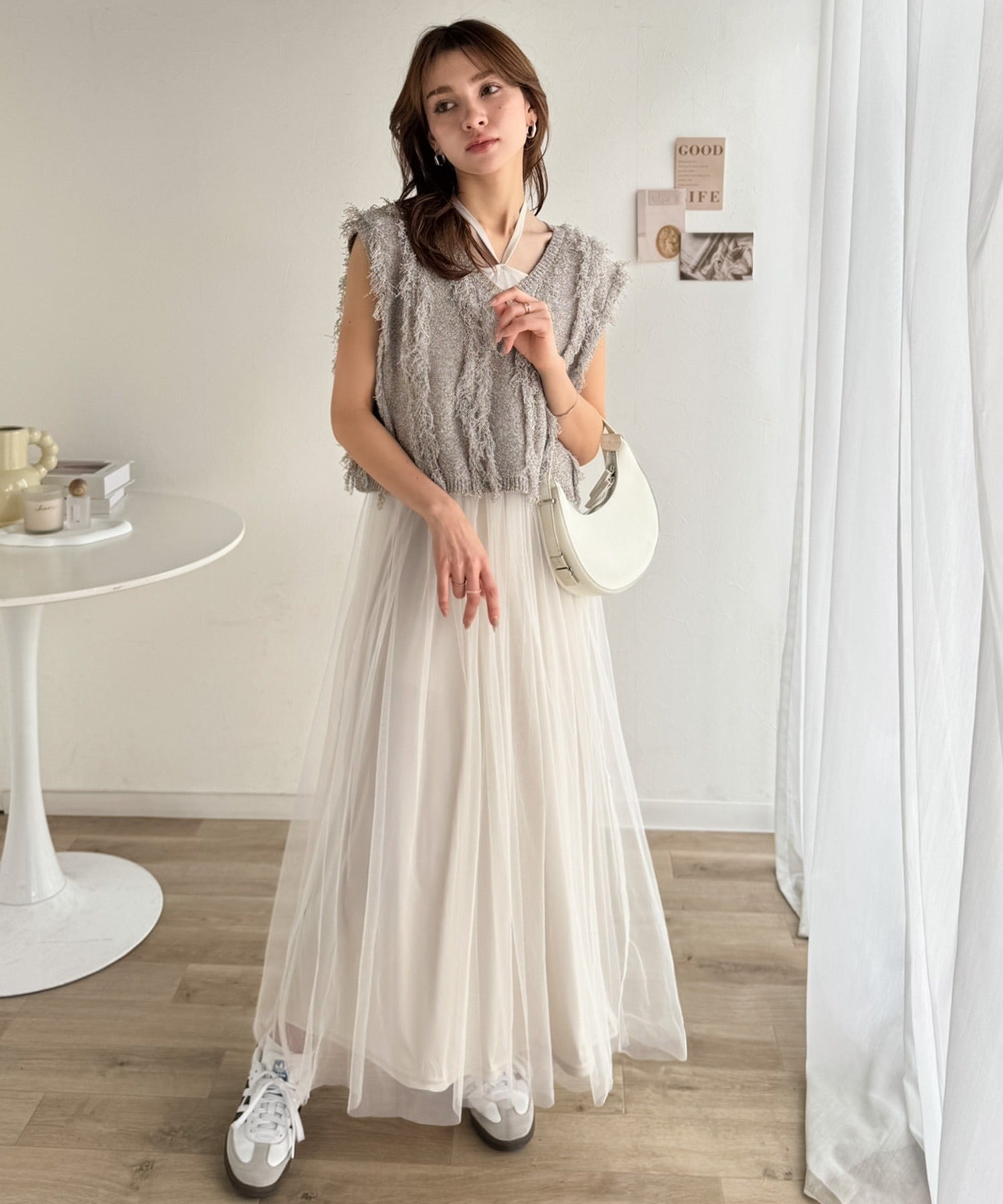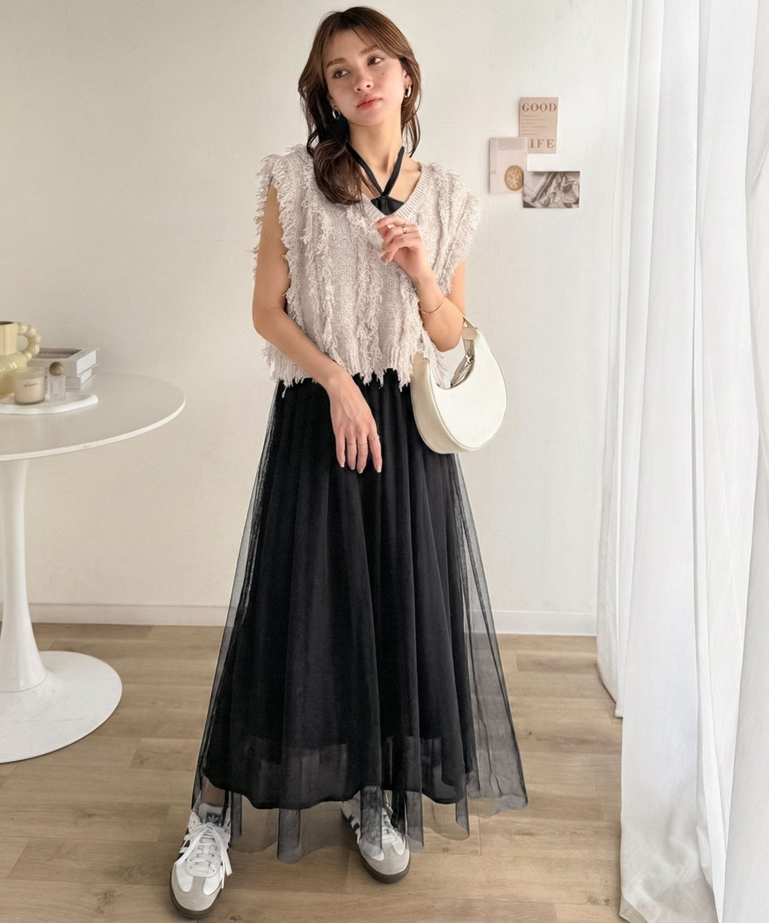 フリンジニット×フレアチュールの華やかセットアイテム。