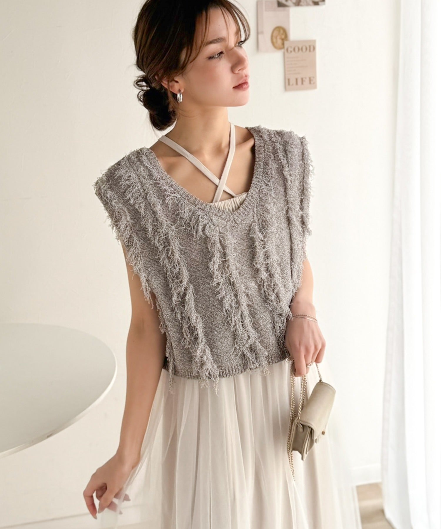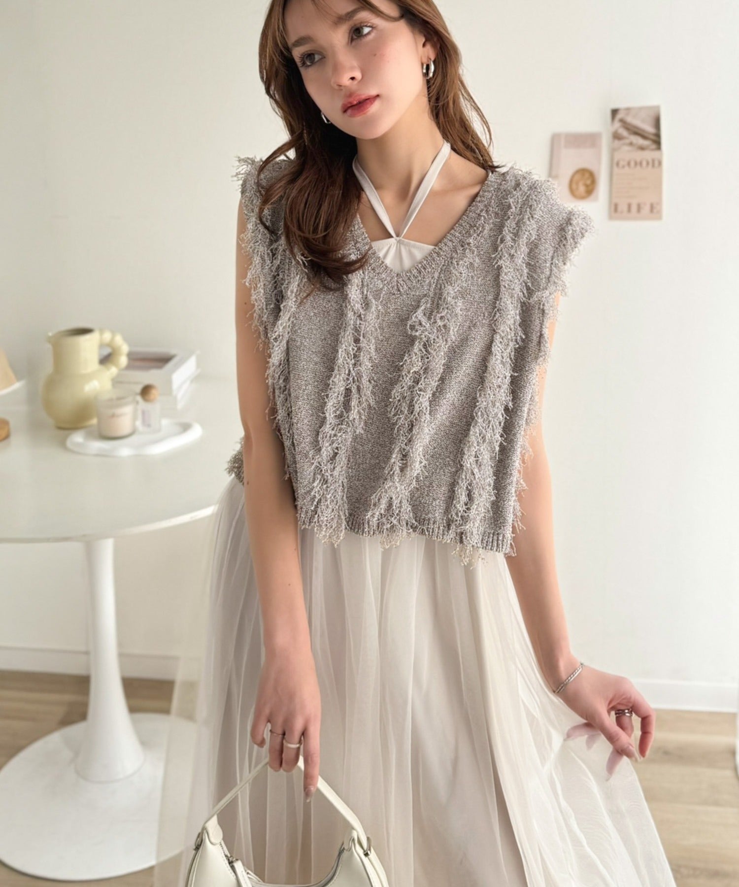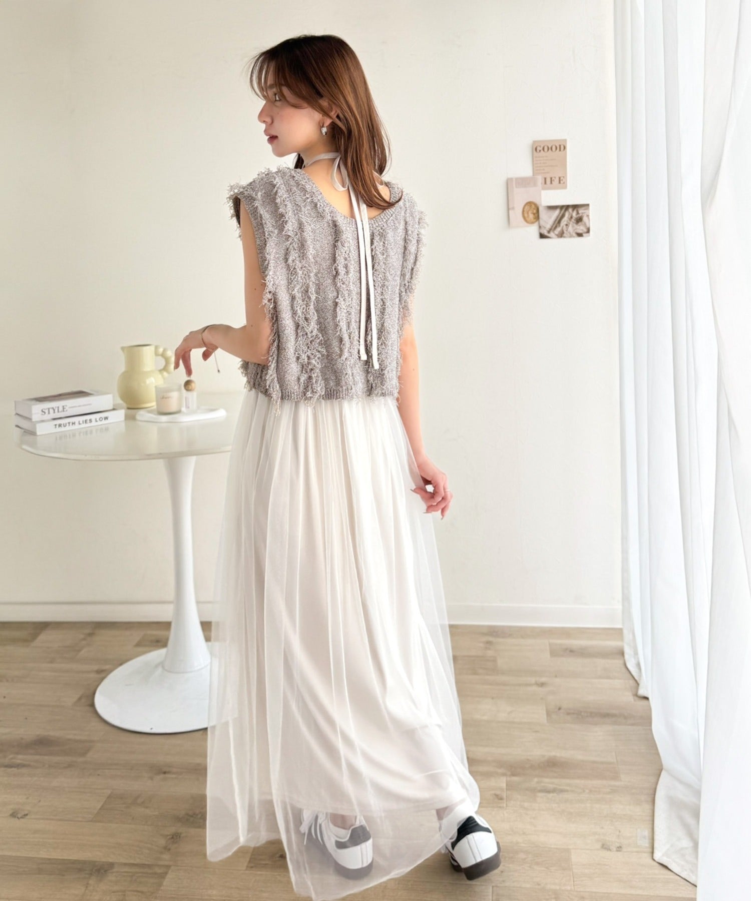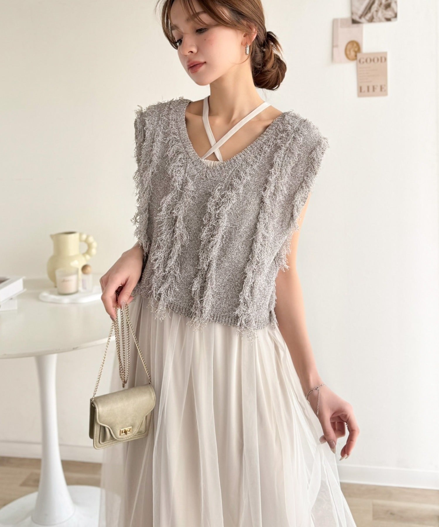 ヘルシーな肌見せが叶うフリンジニットと愛らしいチュールワンピースのセット。