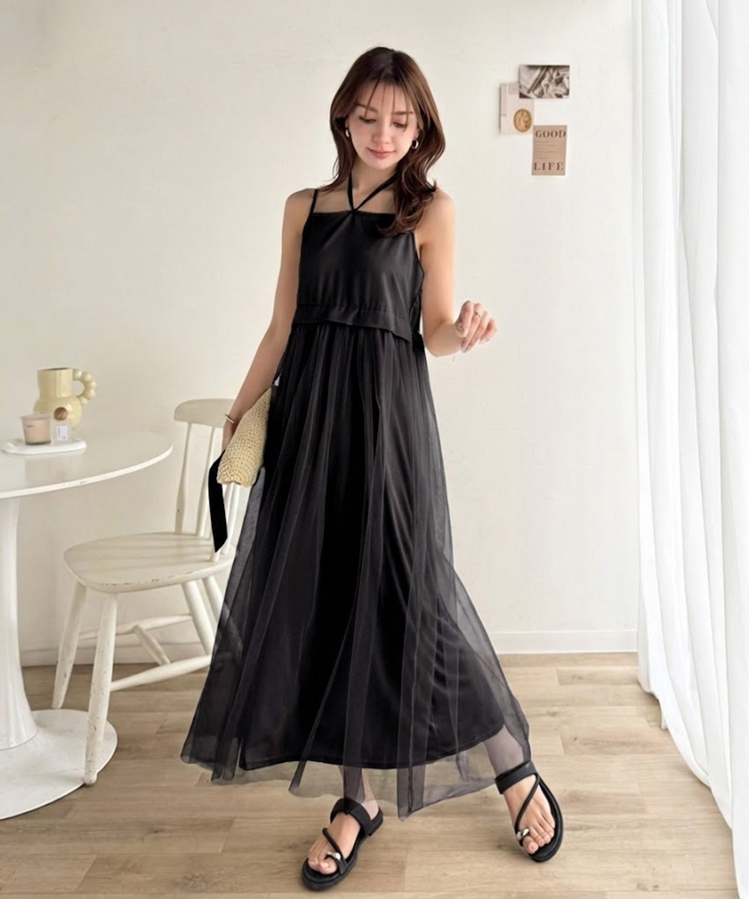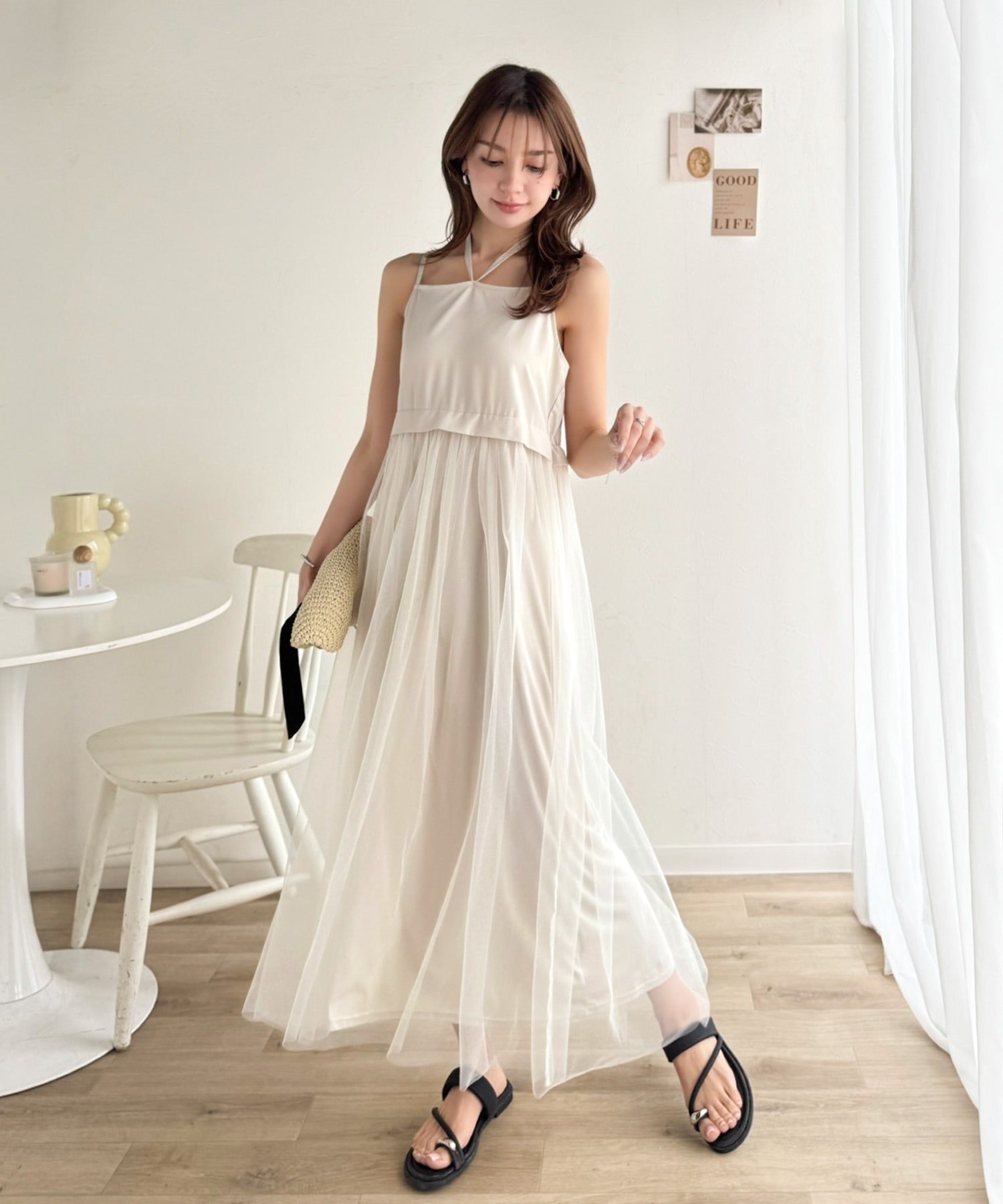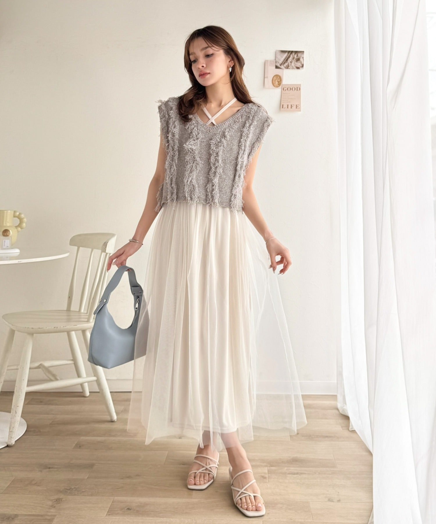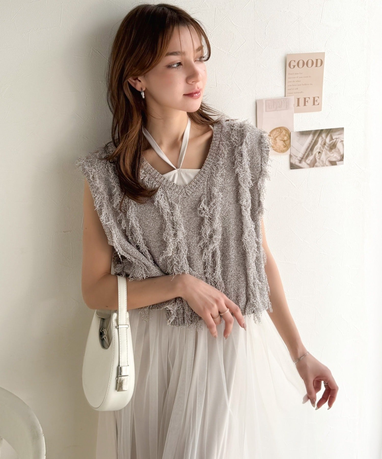 ヘルシーな肌見せが叶うフリンジニットと愛らしいチュールワンピースのセット。