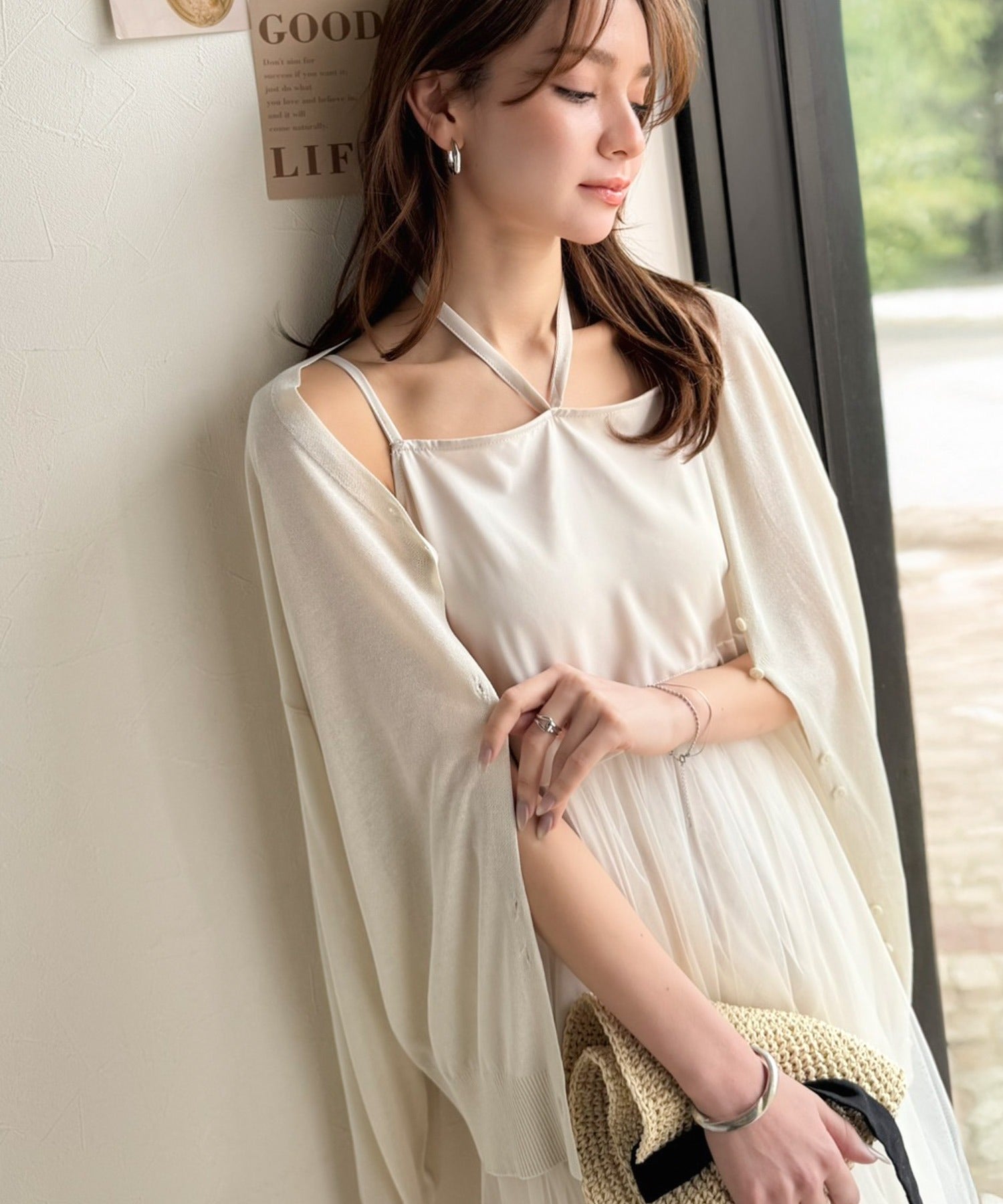 ニットはヘルシーに肌見せしつつ上品な存在感、ワンピースはふんわりAラインで抜け感を演出。