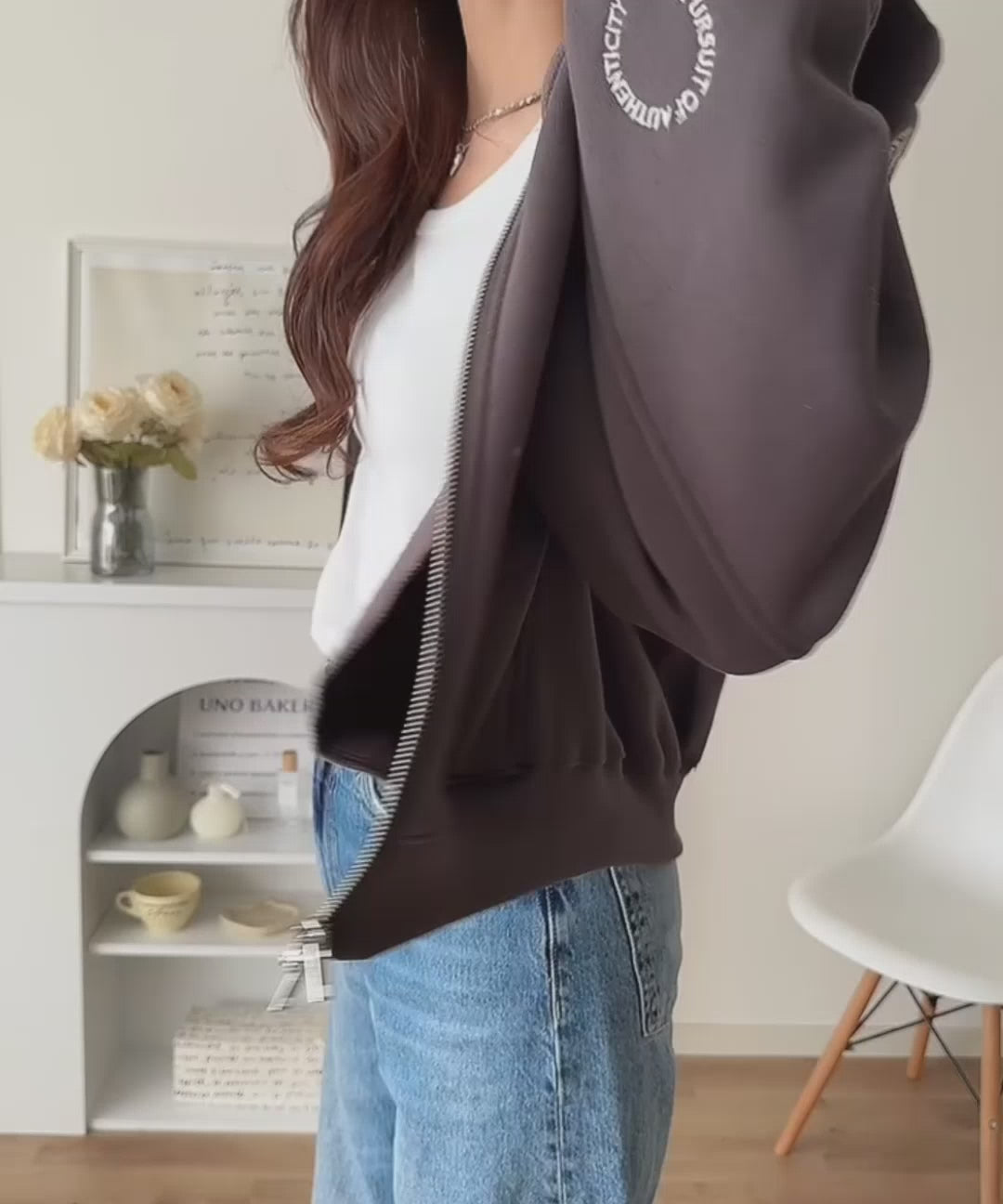控えめながらも個性を添える裏起毛パーカー。