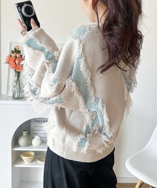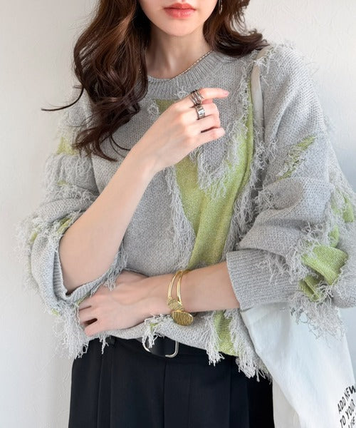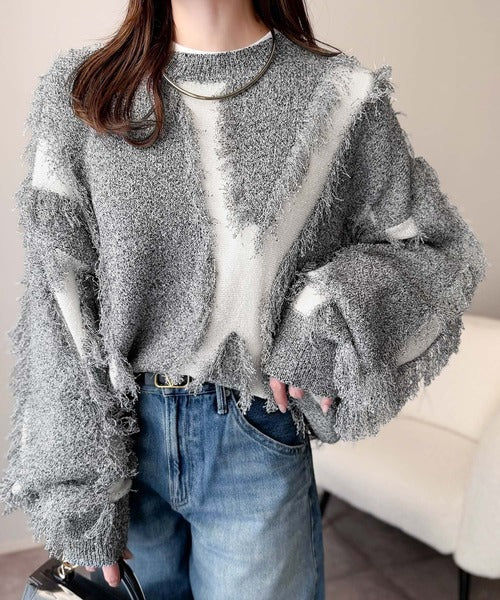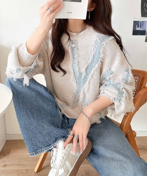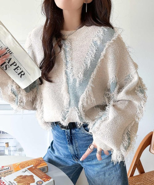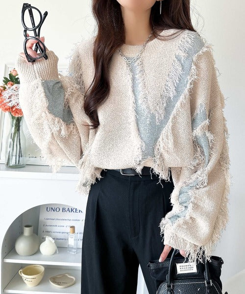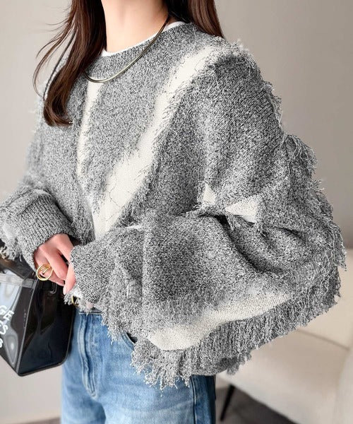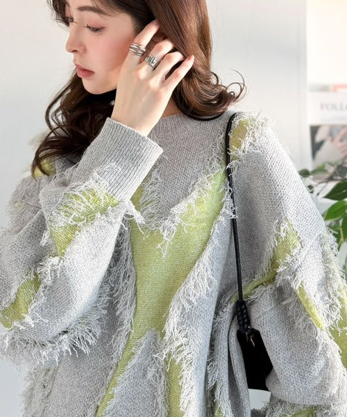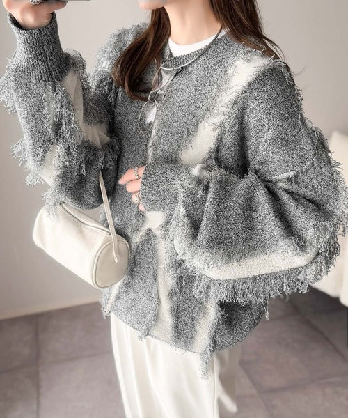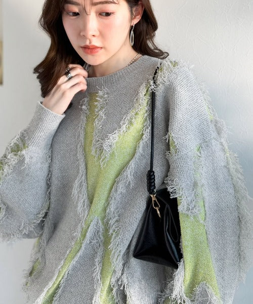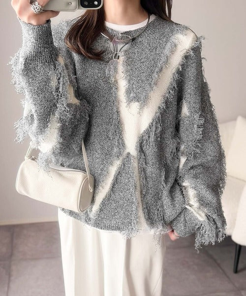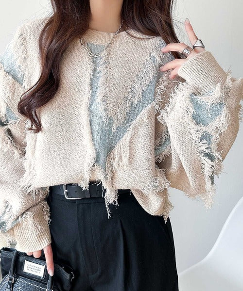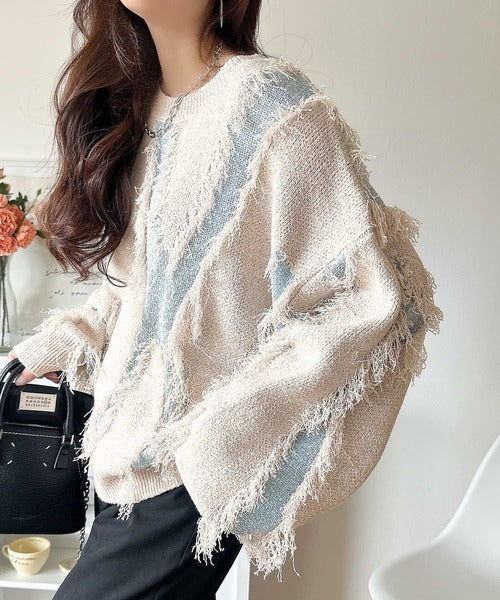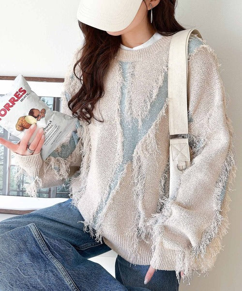 一枚で存在感を放つフリンジ配色オーバーニット。