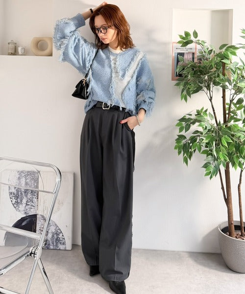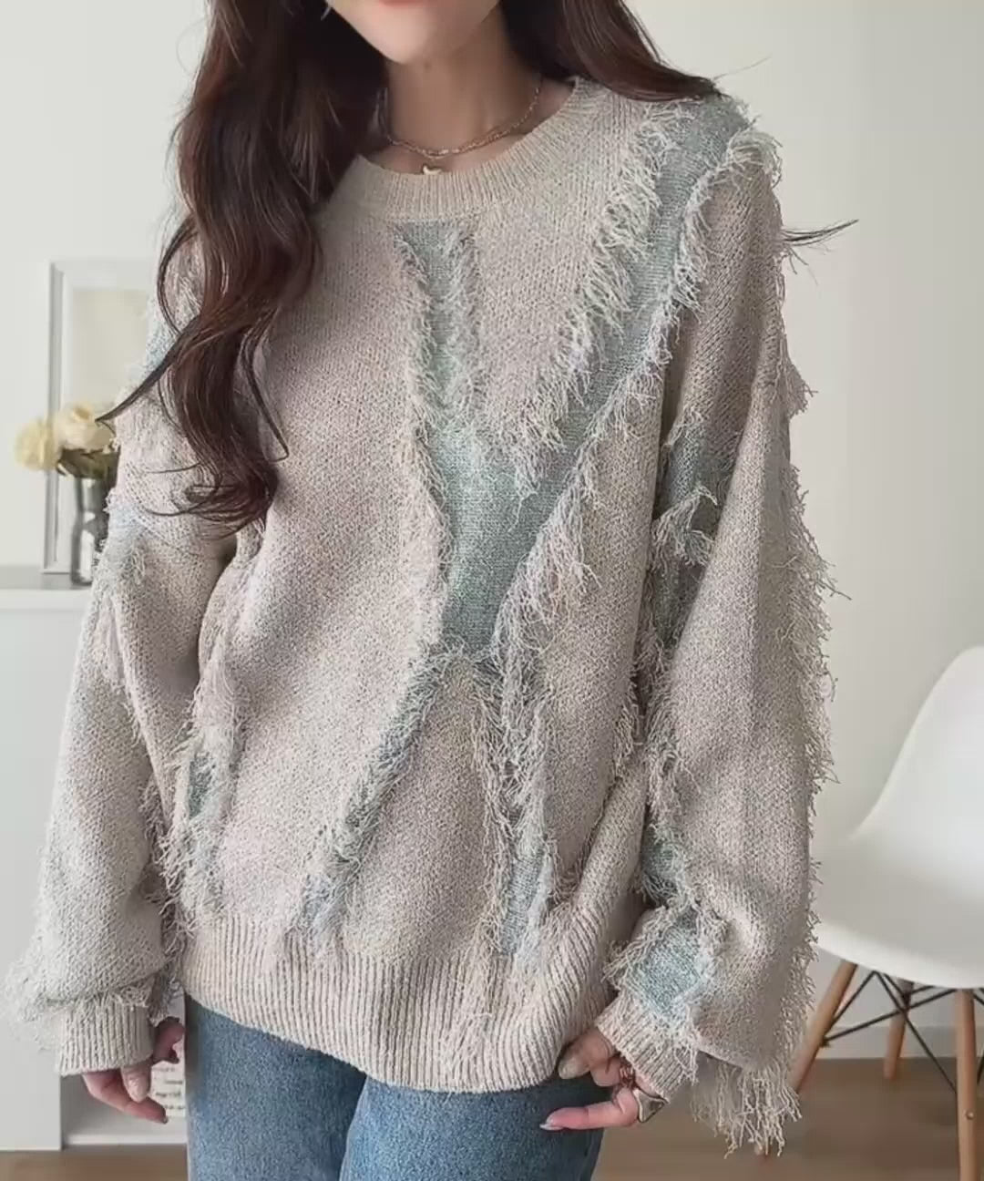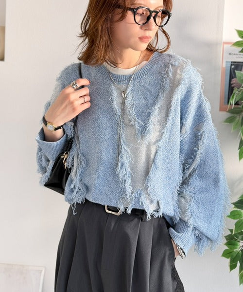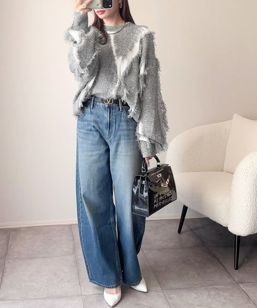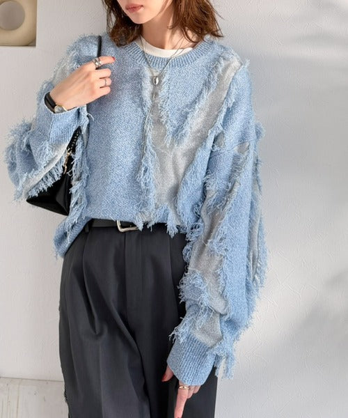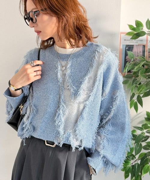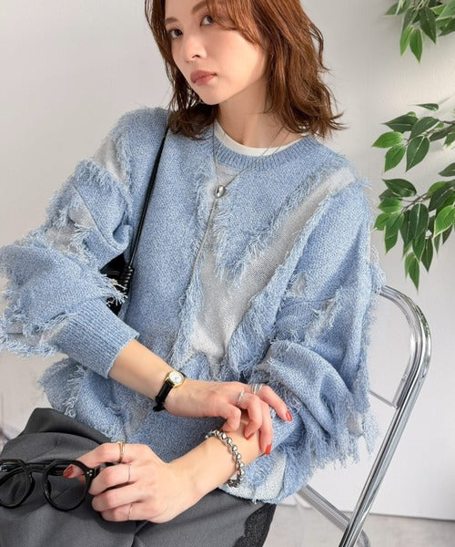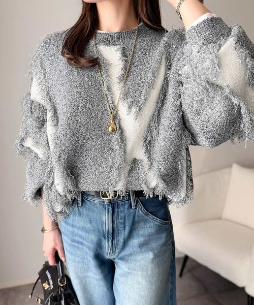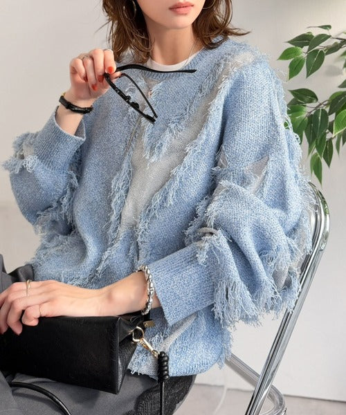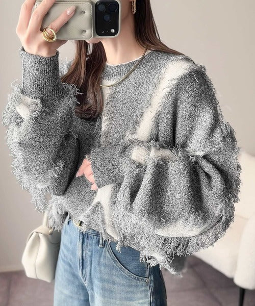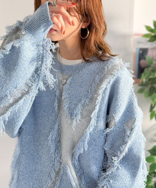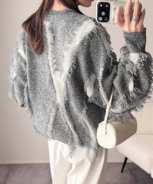 一枚で存在感を放つフリンジ配色オーバーニット。