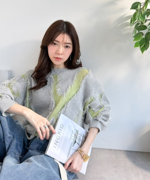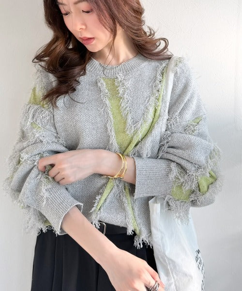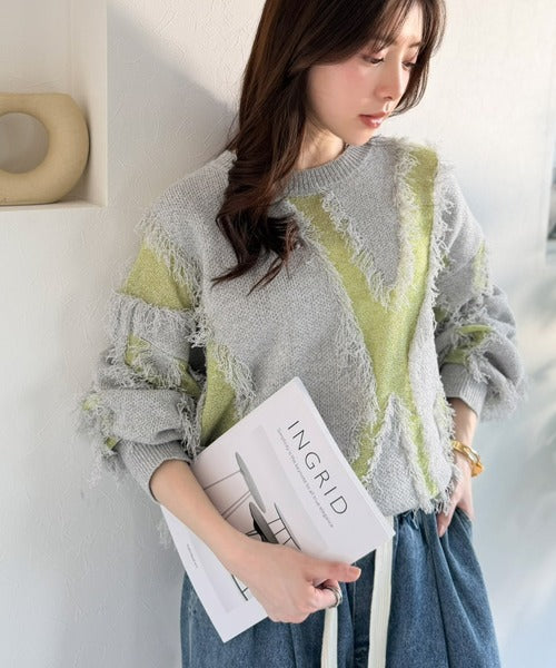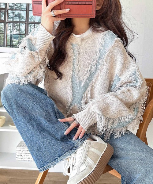 トレンド感溢れる、フリンジ配色ジャガードニット。
