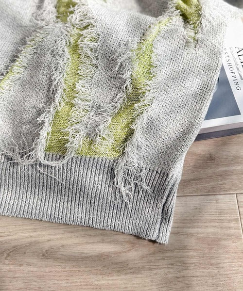 ゆったりオーバーシルエットのフリンジ配色ジャガードニットです。