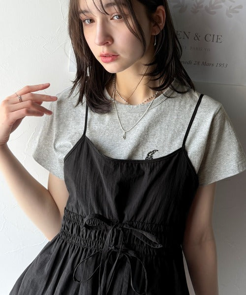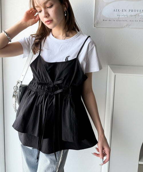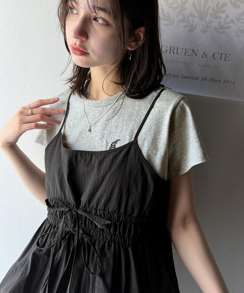 旬のレイヤードスタイルがこれ一着で即完成。ダブルリボン使いキャミ&ムーン刺繍半袖Tシャツセット ce1265004