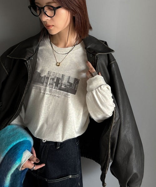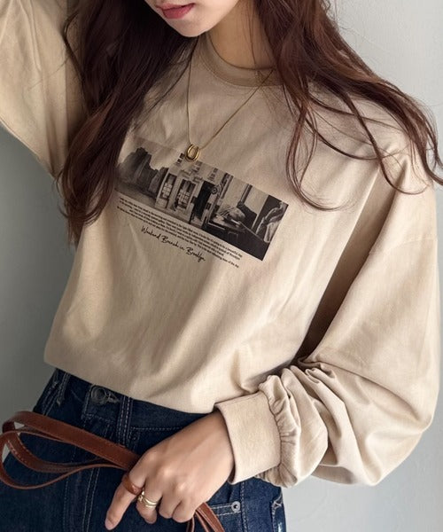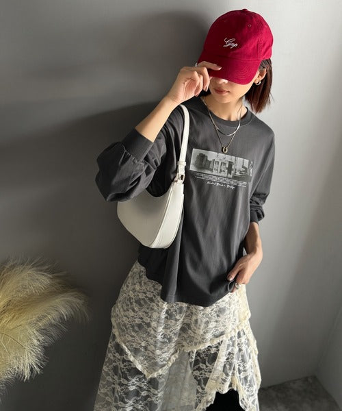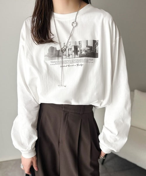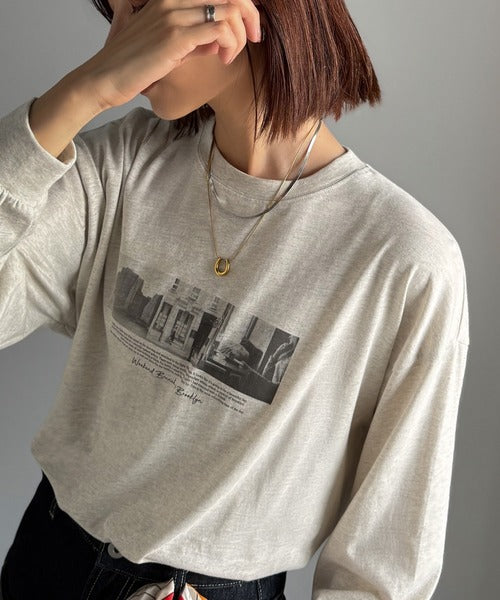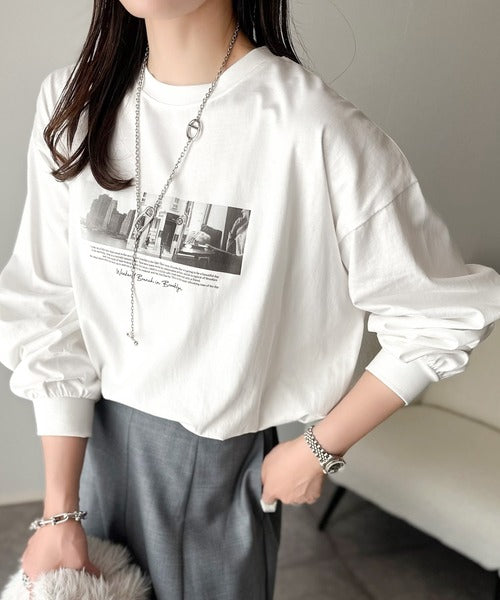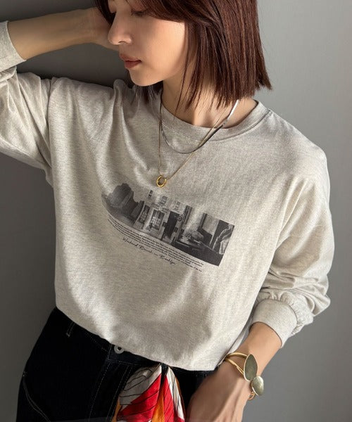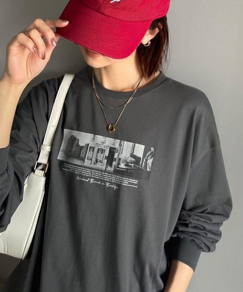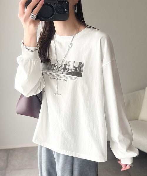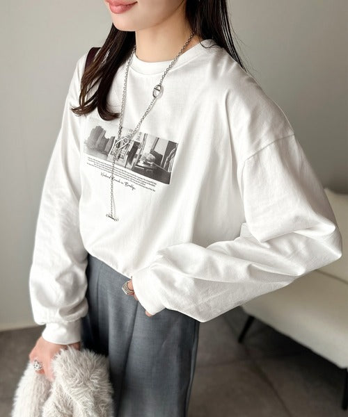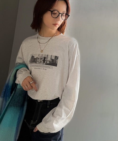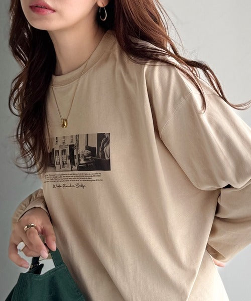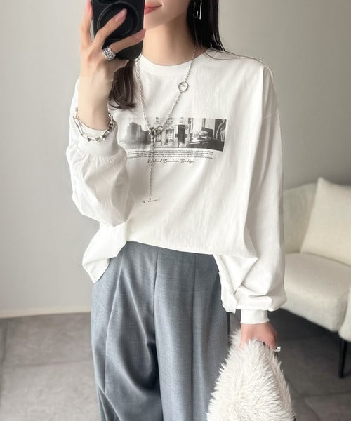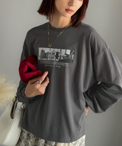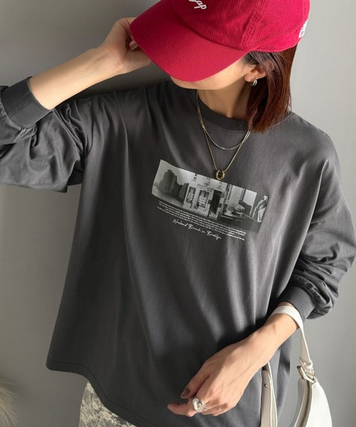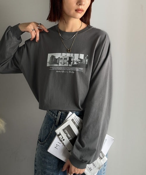 一枚でも、レイヤードでも。モードな雰囲気で魅せる綿100%モノクロフォトプリントロンT(長袖) ce1330041