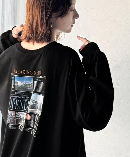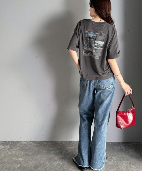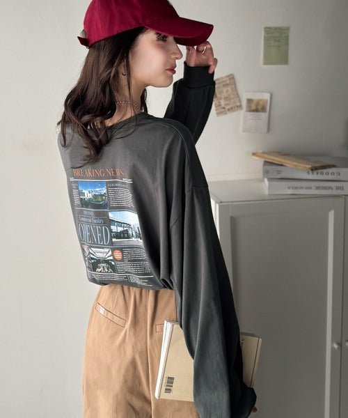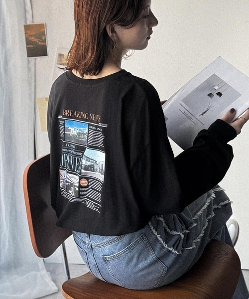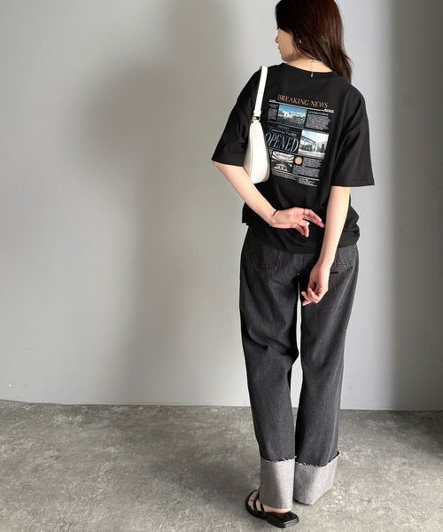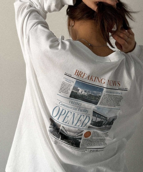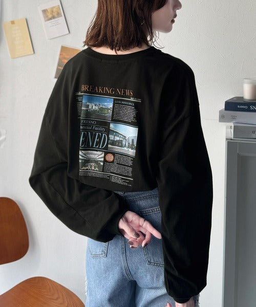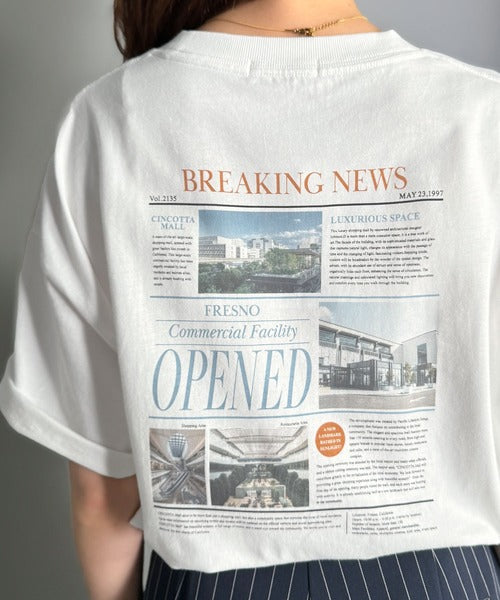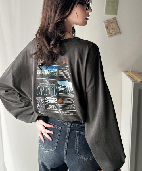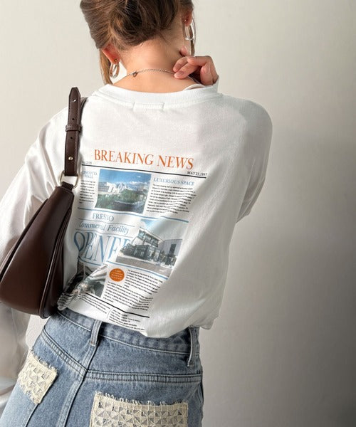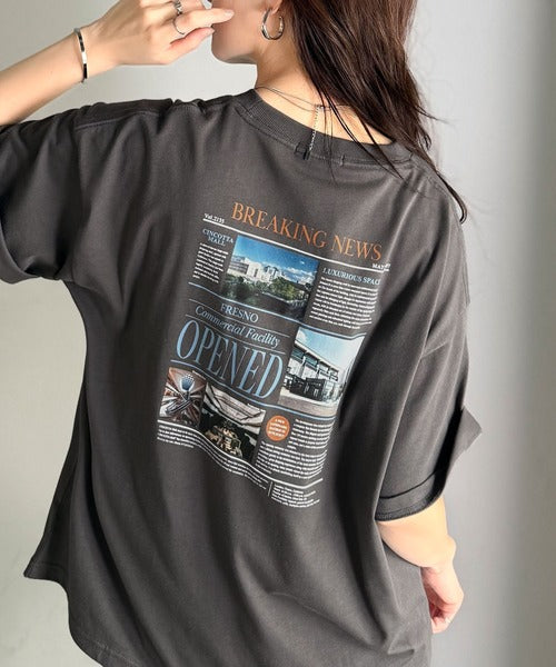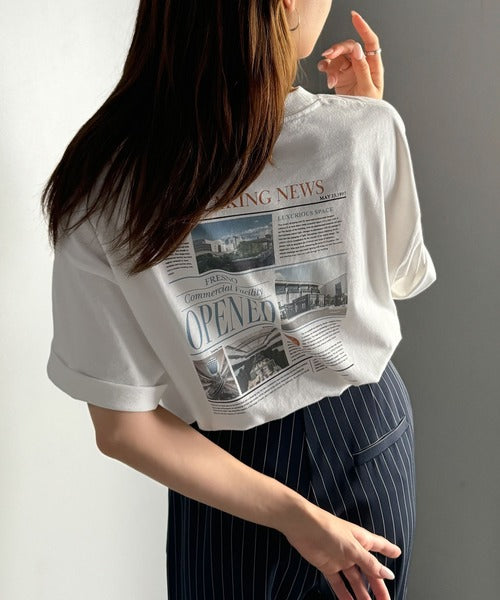 ニュースペーパー風のバックプリントが目を引く、こだわりの1枚です。