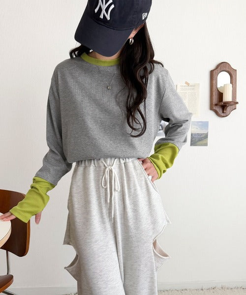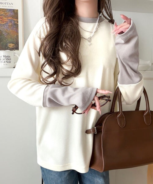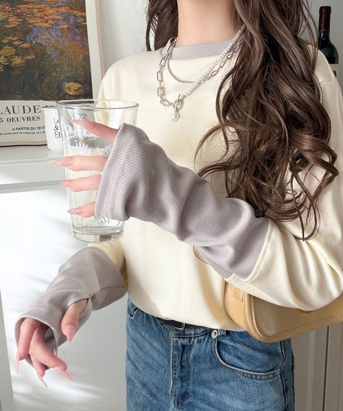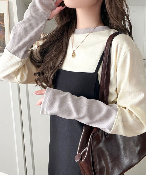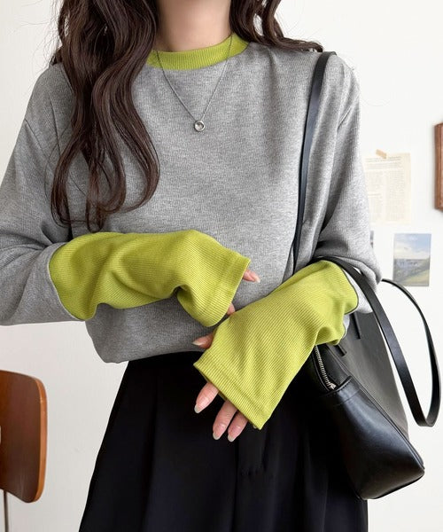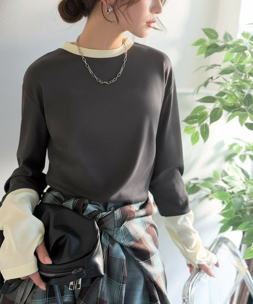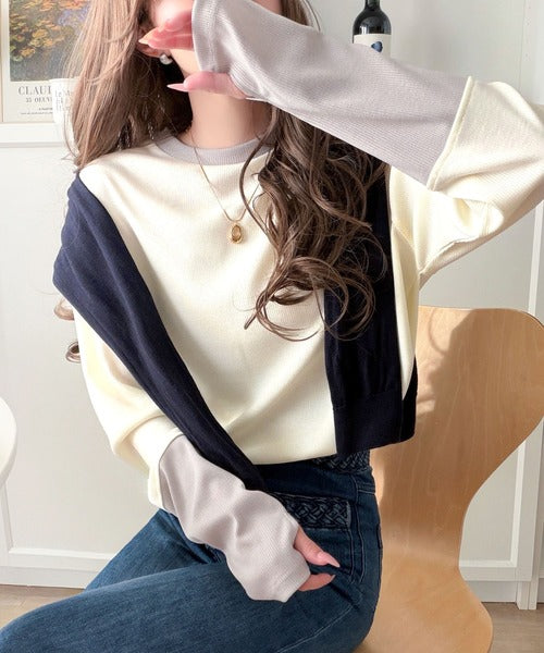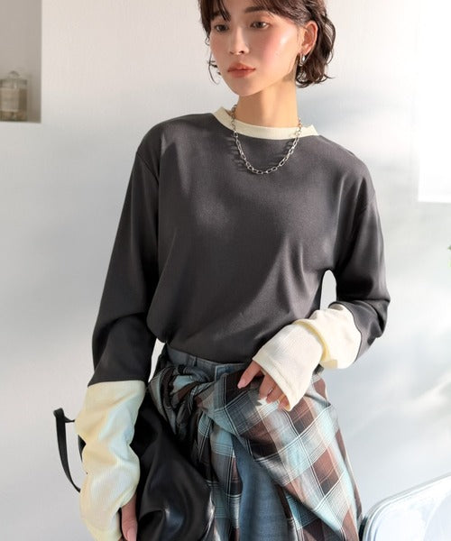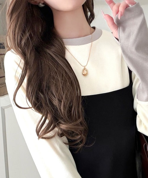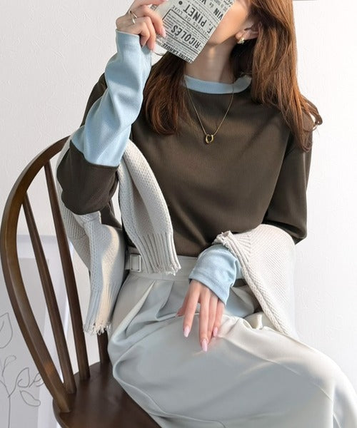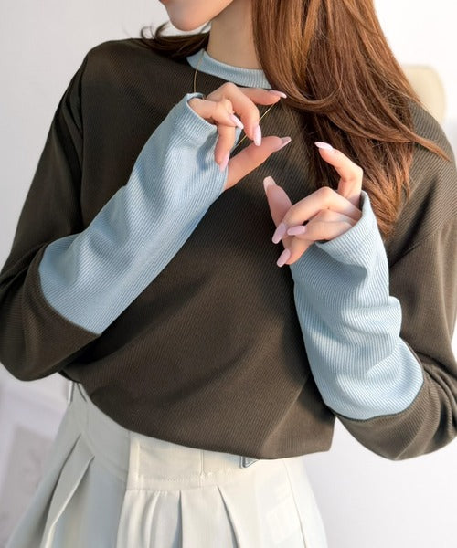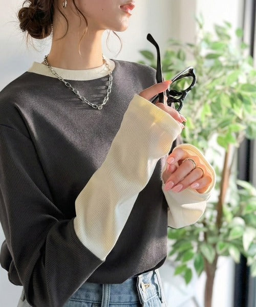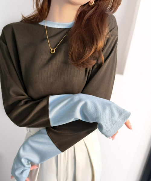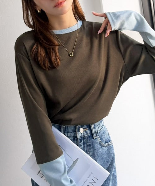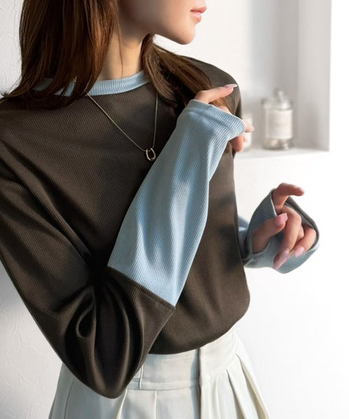 レイヤード見えで仕上げる、きれいめモード。指穴(サムホール)付き袖配色切り替えテレコリブニットプルオーバー(長袖) ce1330082