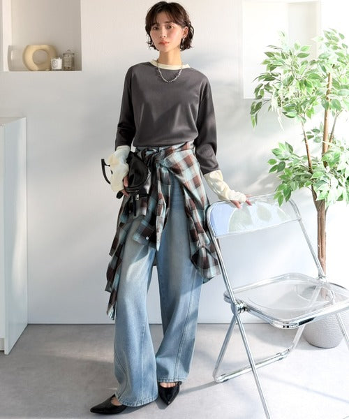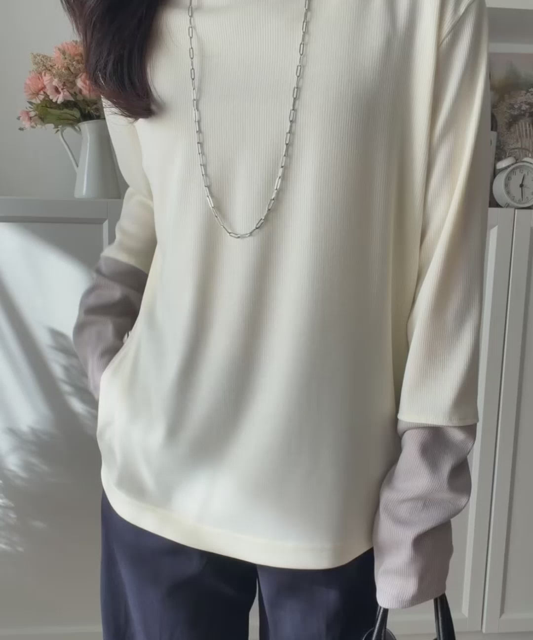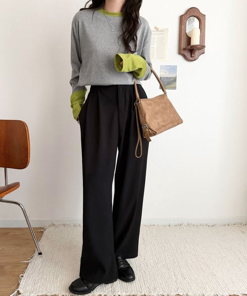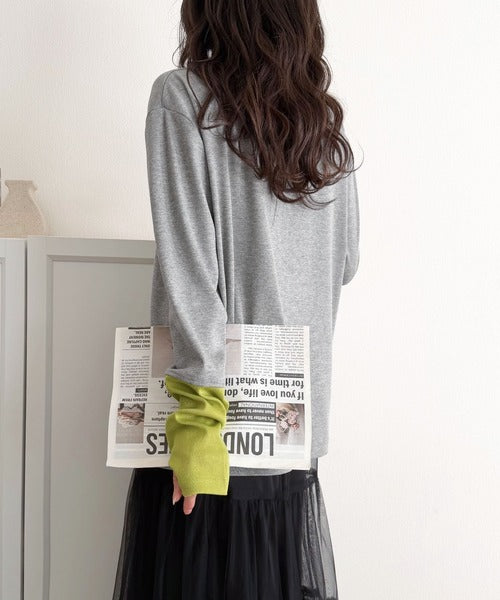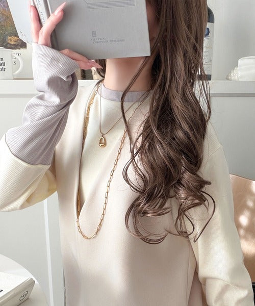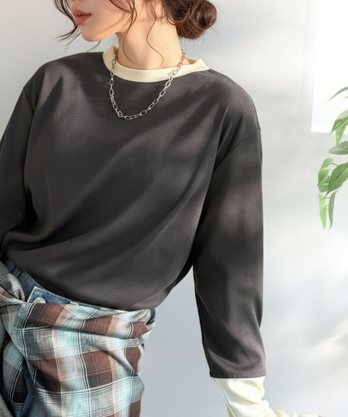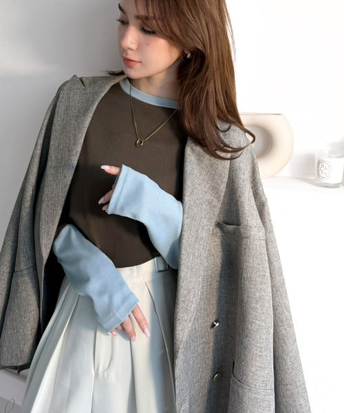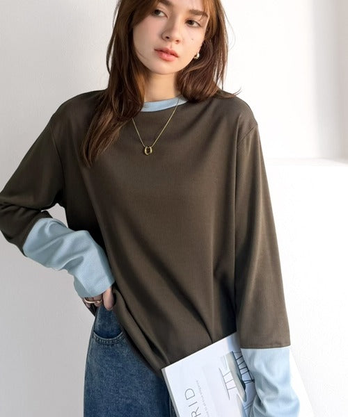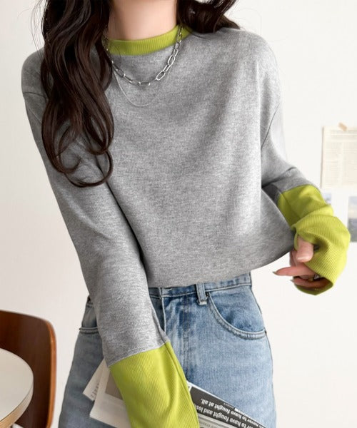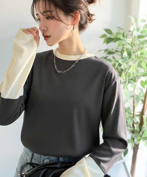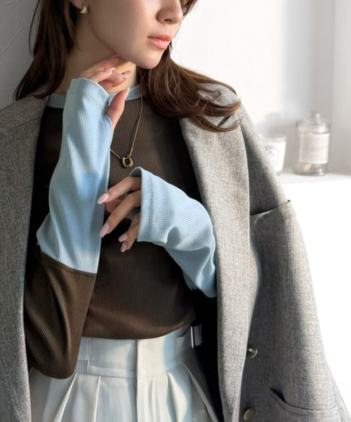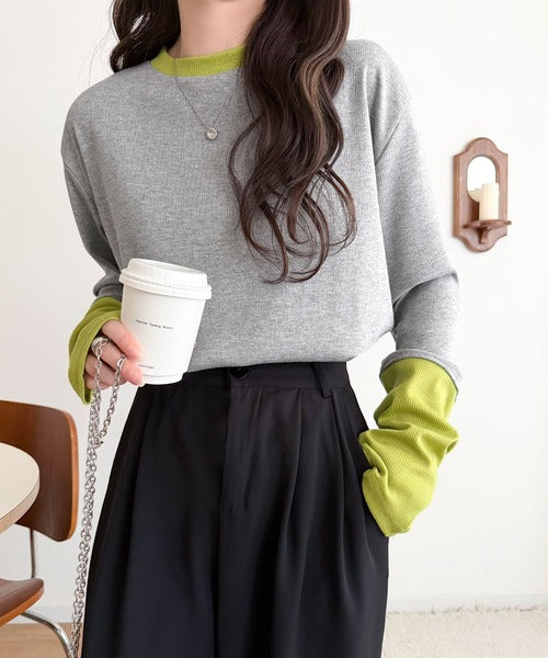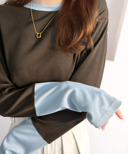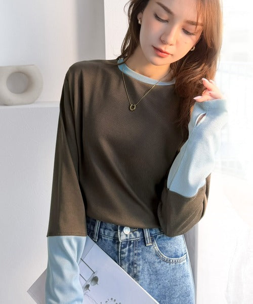 一枚でレイヤード見えが叶う、袖配色切り替えテレコリブニット。